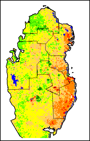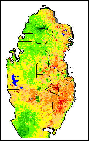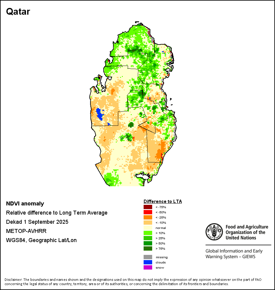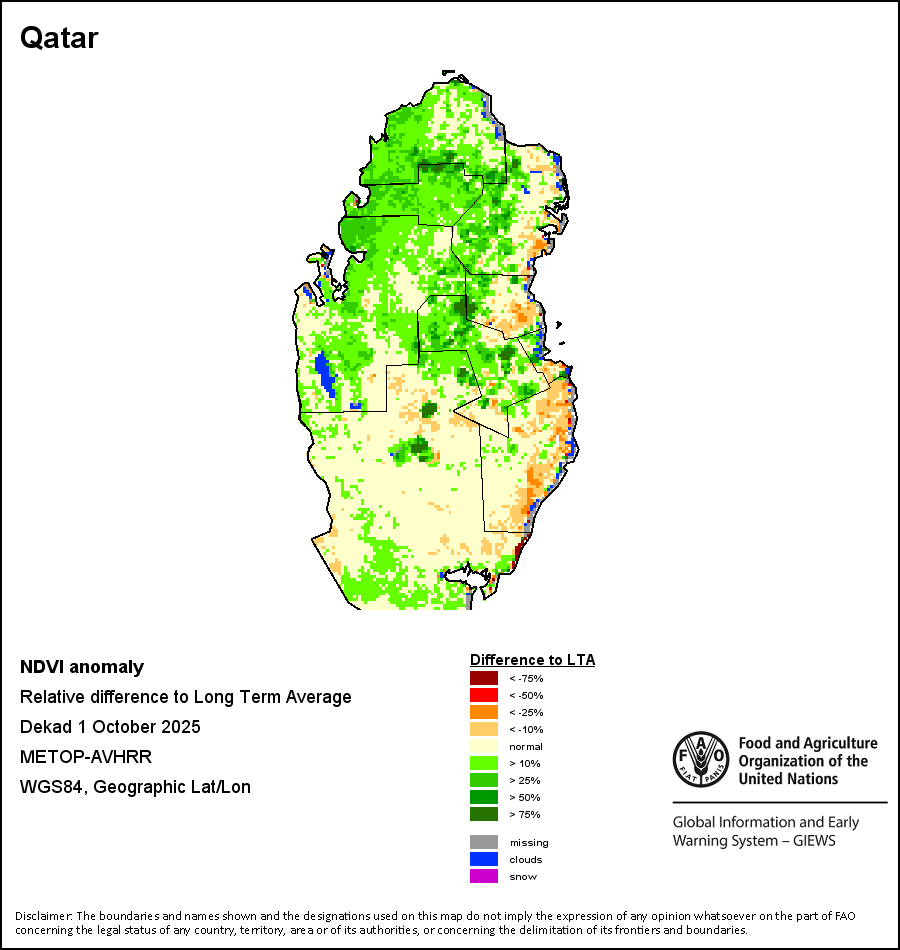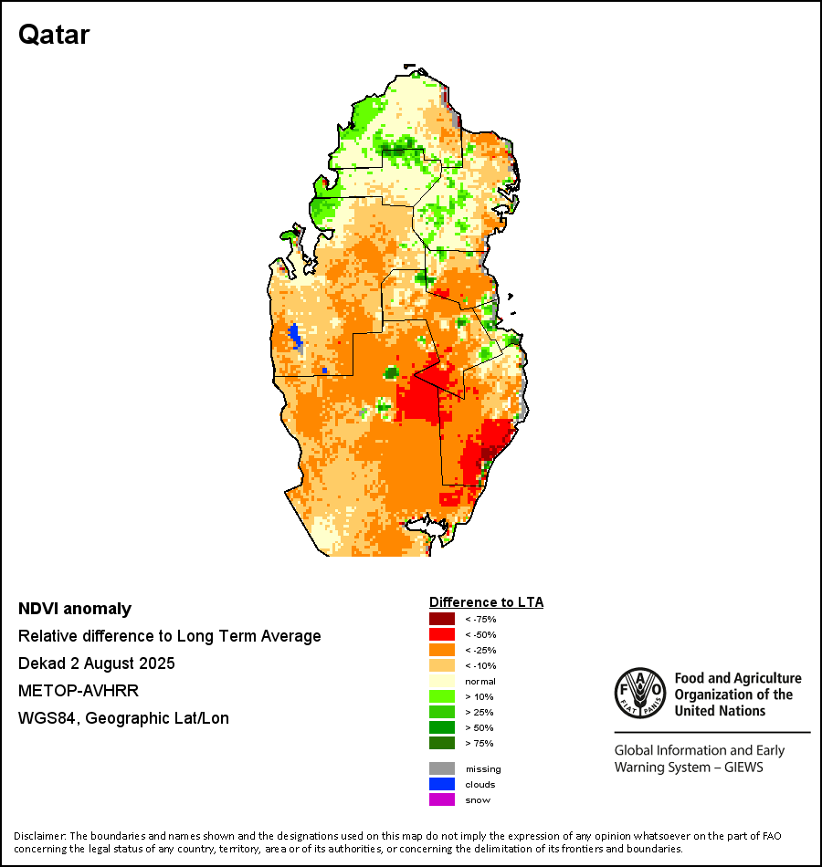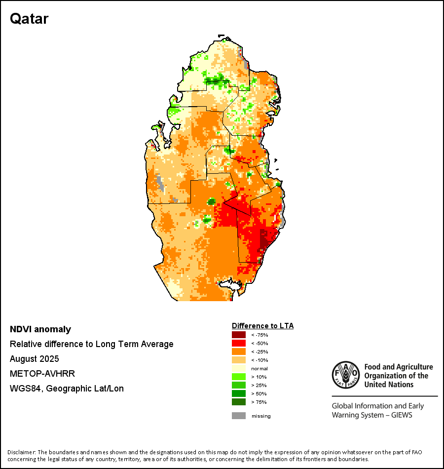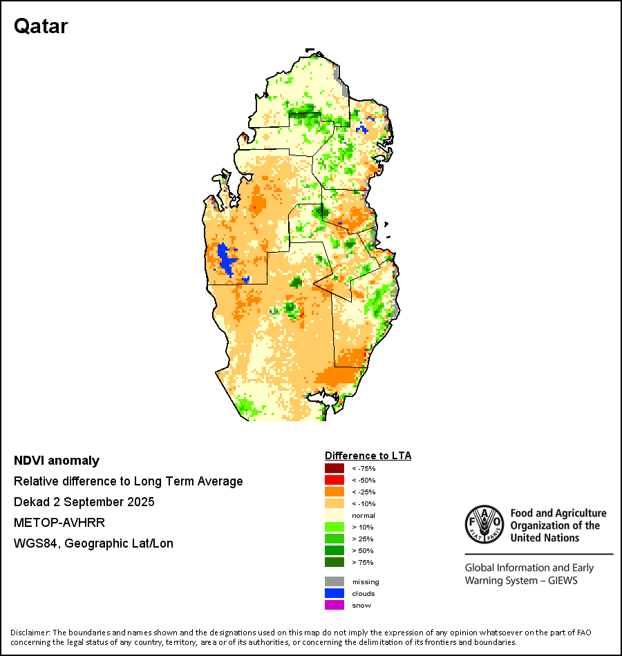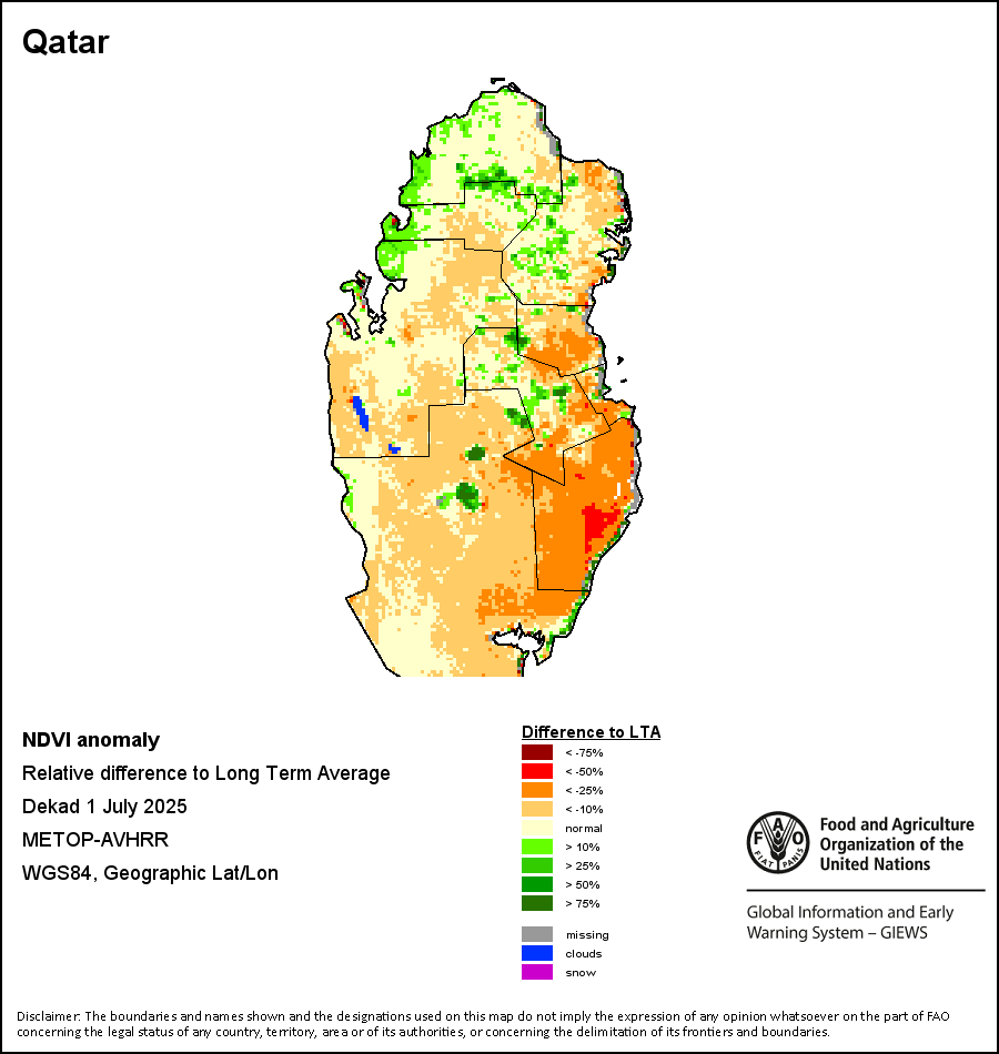 خضعت دراسة المؤشر الموحد لتباين الغطاء النباتي إلى مقارنة مع المعدل طويل الأجل (1984- 2015) وبيانات العام السابق على المستوى الإداري الأول.
