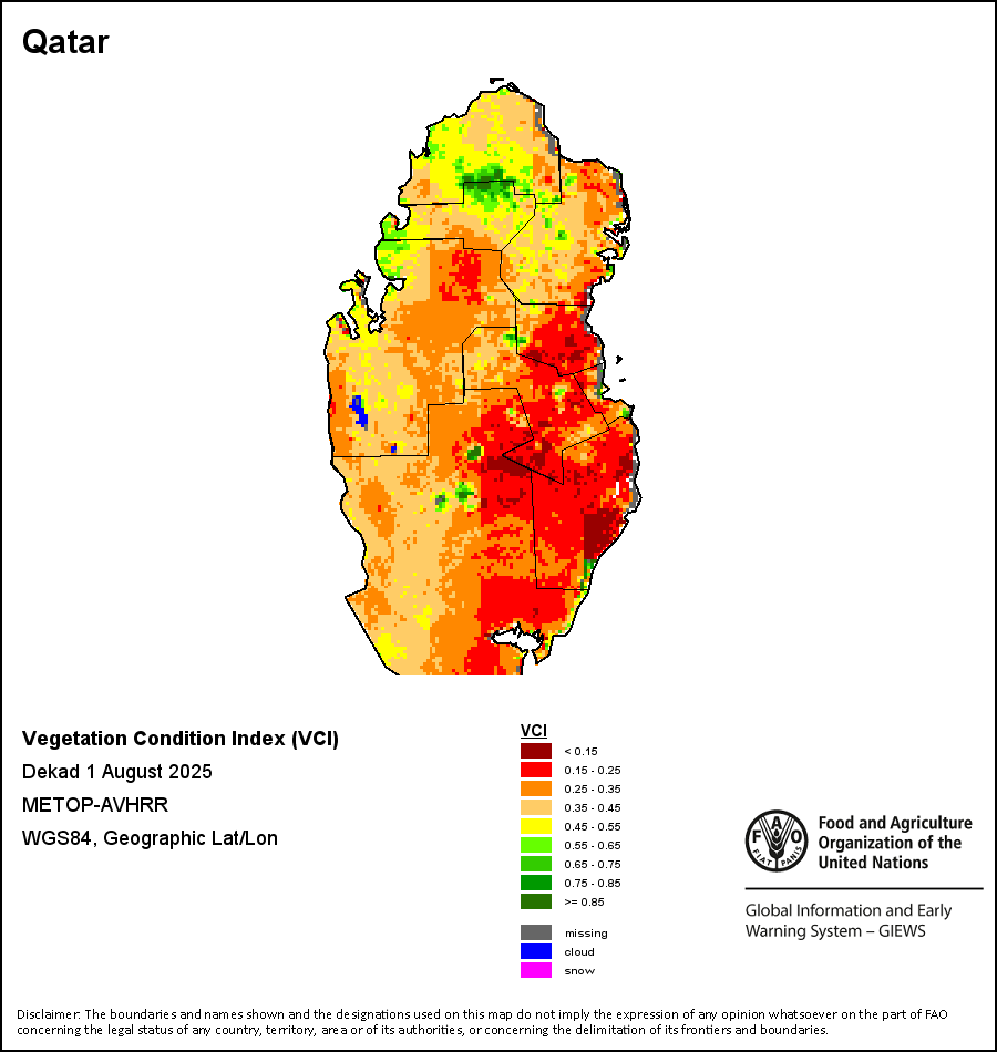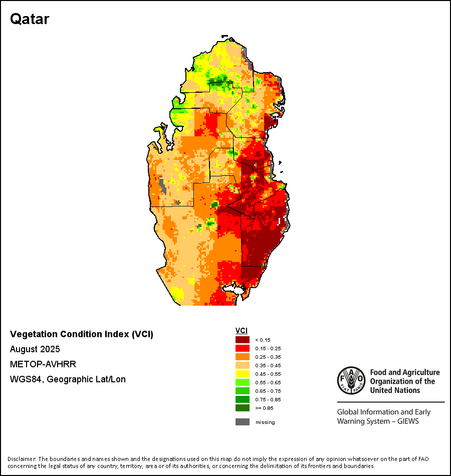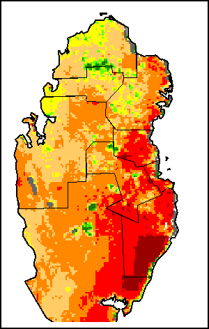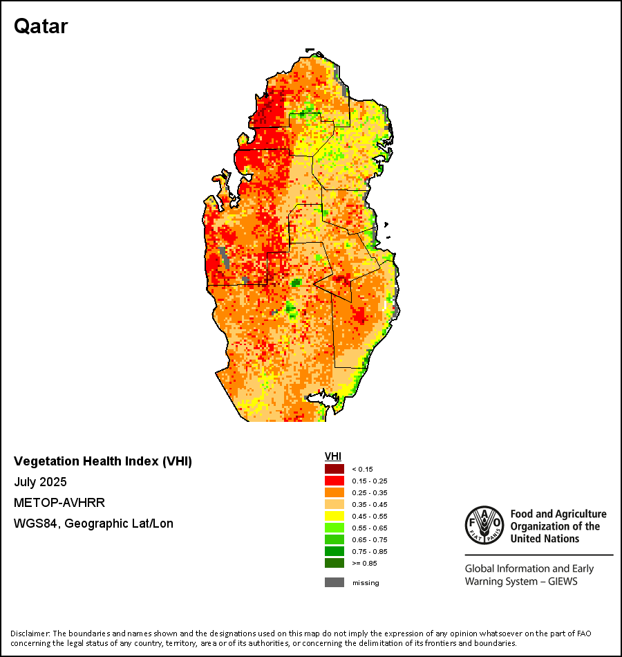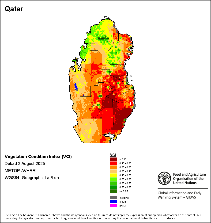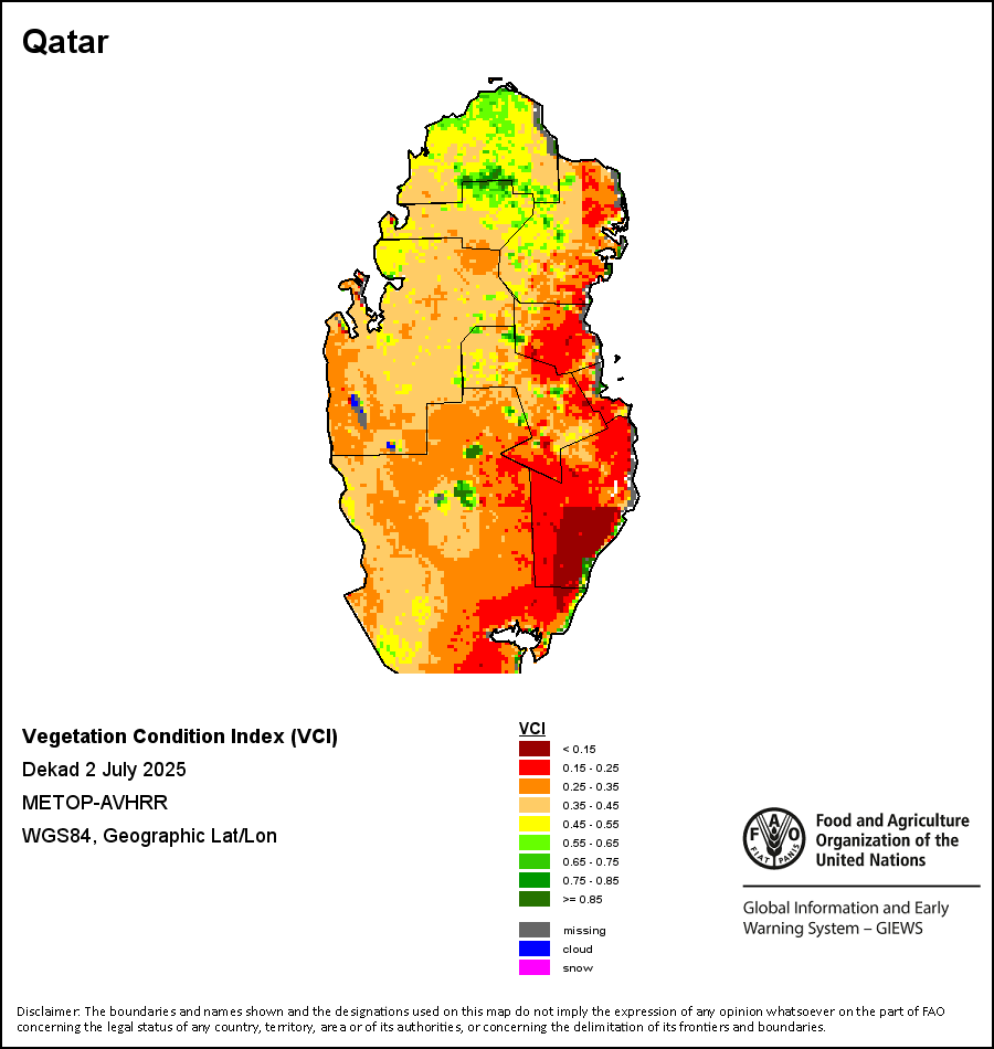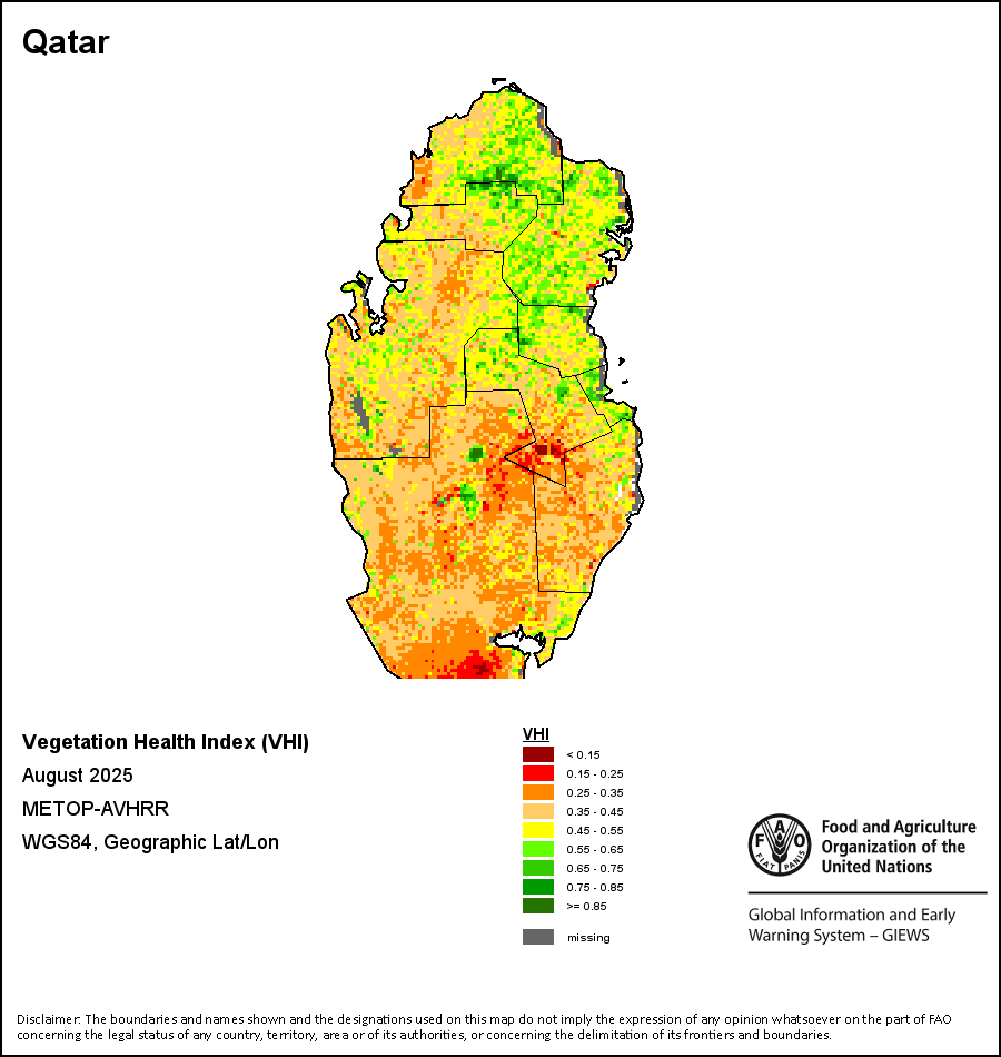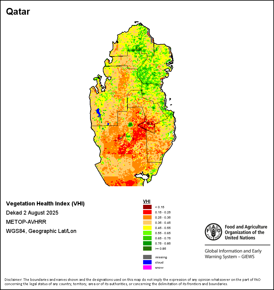 خضعت دراسة المؤشر الموحد لتباين الغطاء النباتي إلى مقارنة مع المعدل طويل الأجل (1984- 2015) وبيانات العام السابق على المستوى الإداري الأول.