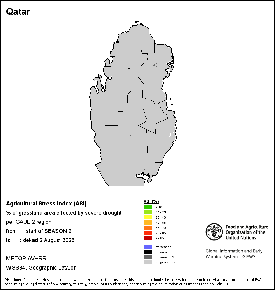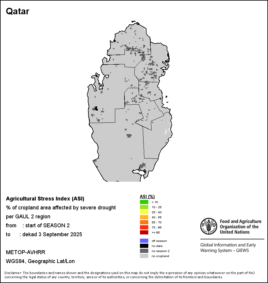 يصور مؤشر الإجهاد الزراعي السنوي النسبة المئوية من الأراضي الزراعية المتأثرة بالجفاف على امتداد الموسم الزراعي بأكمله ضمن منطقة إدارية ما. ويختلف هذا المؤشر السنوي عن مؤشر الإجهاد الزراعي الذي يعتمد على أحوال الجفاف منذ بداية الموسم وحتى فترة العشرة أيام الراهنة.