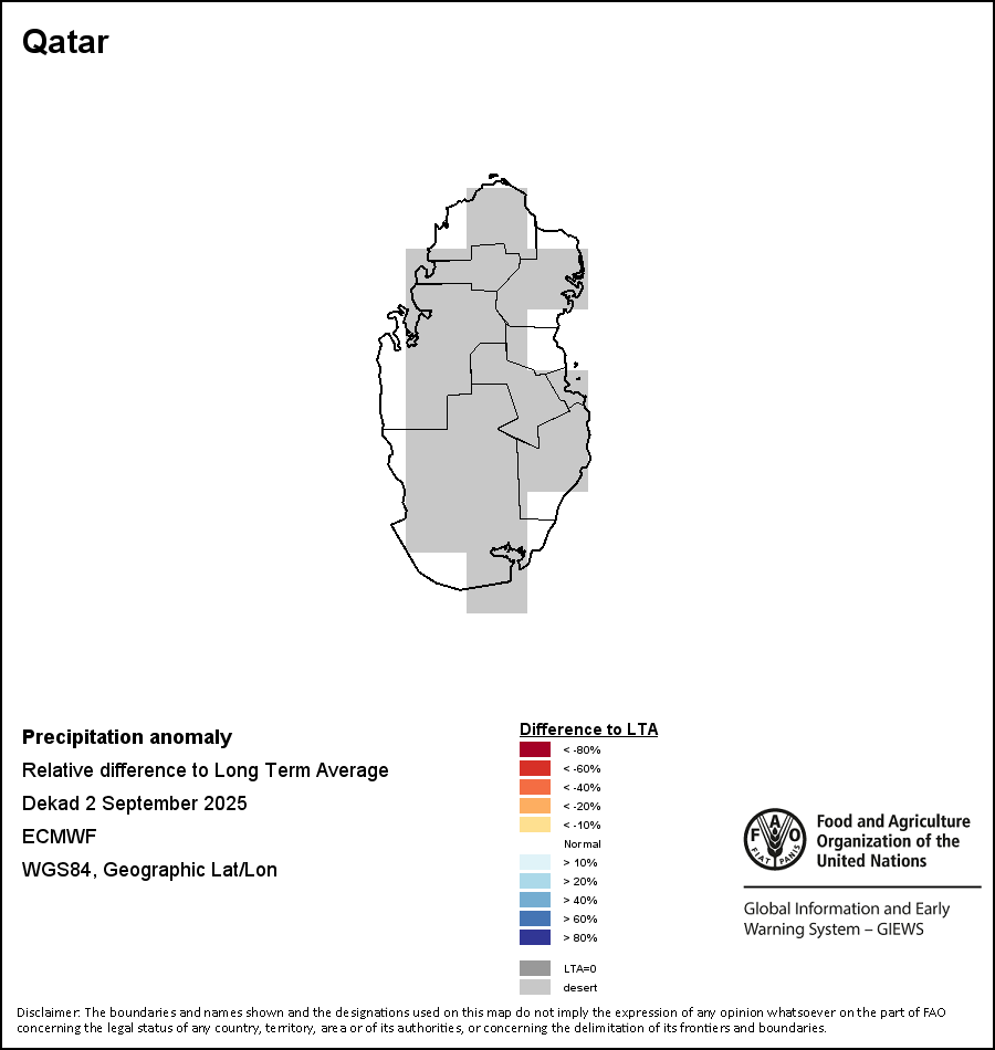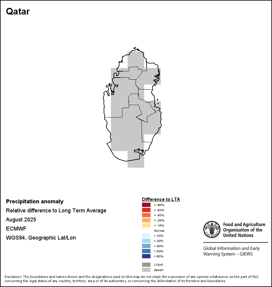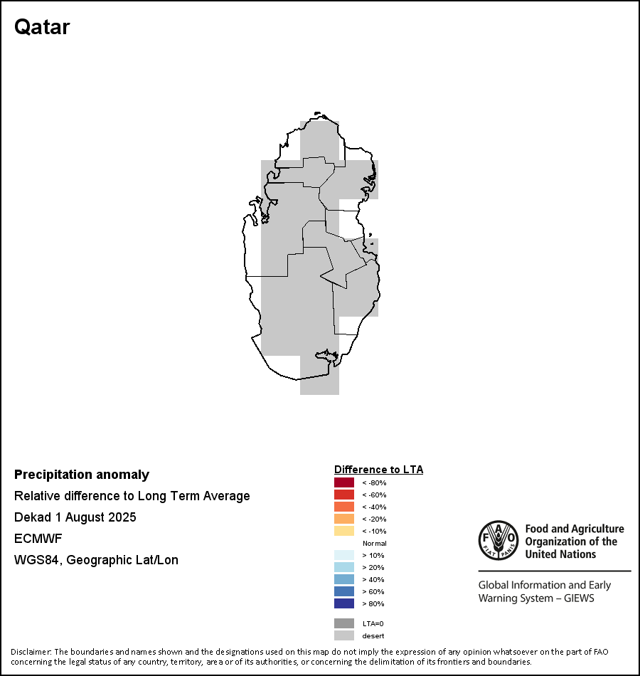 توضح الخريطة الاختلاف بين كمية الهطولات المطرية الراهنة ومعدلها. تقارَن مستويات الهطولات المطرية مع المعدل طويل الأجل الذي يشير إلى الفترة ما بين 1989-2015.