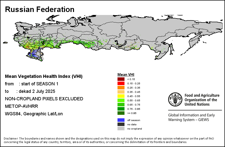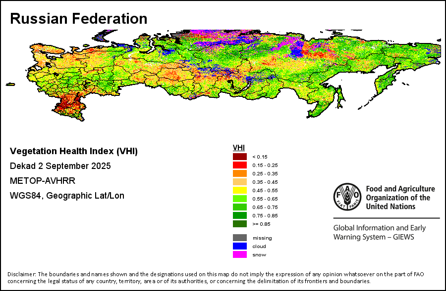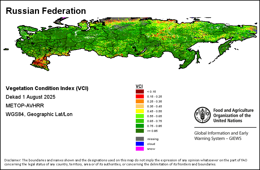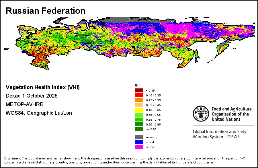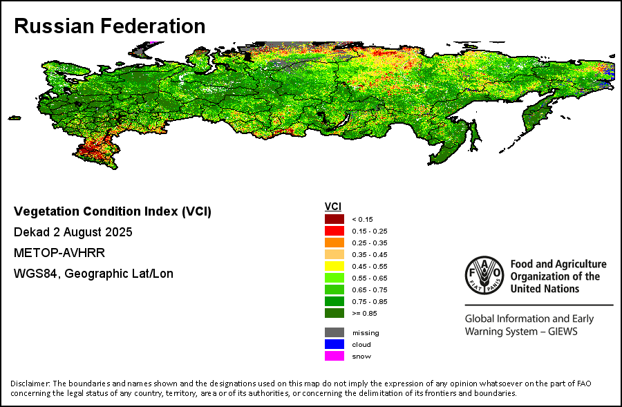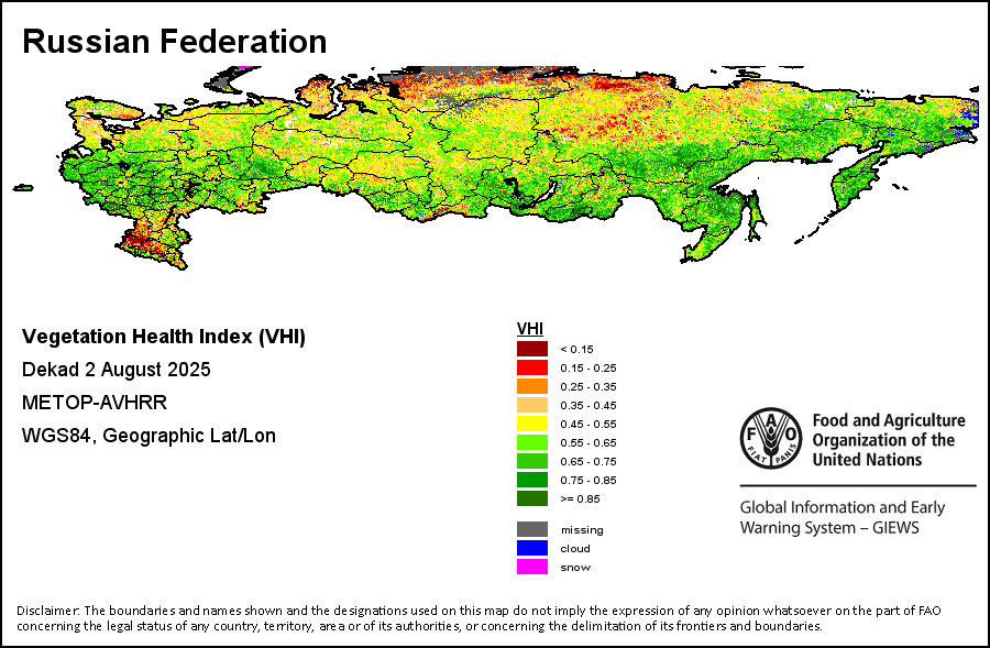 植被健康指数(VHI)根据植被健康状况以及气温对作物状况的影响情况显示干旱的严重程度。 VHI是一项综合指数,是用于计算ASI的基础性指标。它结合了植被状况指数(VCI)和气温状况指数(TCI)。TCI的计算采用了与VCI类似的方程,但它把当前气温与长期最高和最低值联系起来,因为一个假定前提是气温越高就倾向于造成植被状况恶化。比方说,VHI指数下降就意味着植被状况相对较差,而气温越高则意味着植被状况受到胁迫,较长时间延续则成为干旱的指征。VHI映像针对两个主要季节进行计算并分为三种时间模式:旬度、月度和年度。