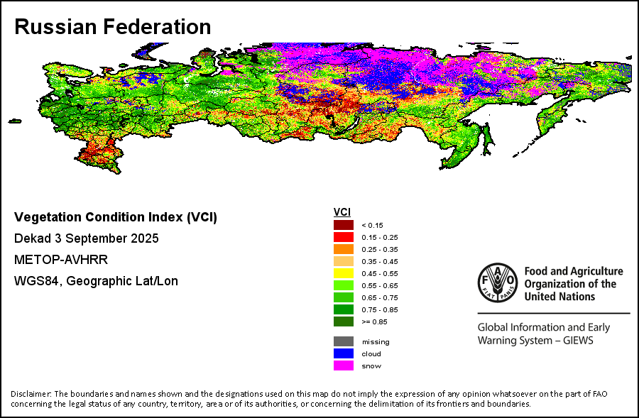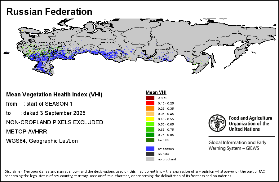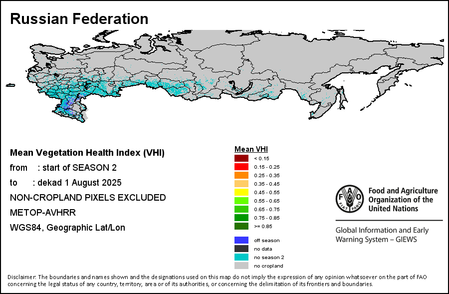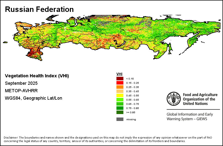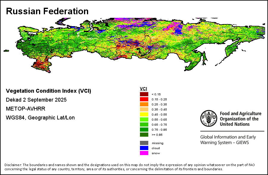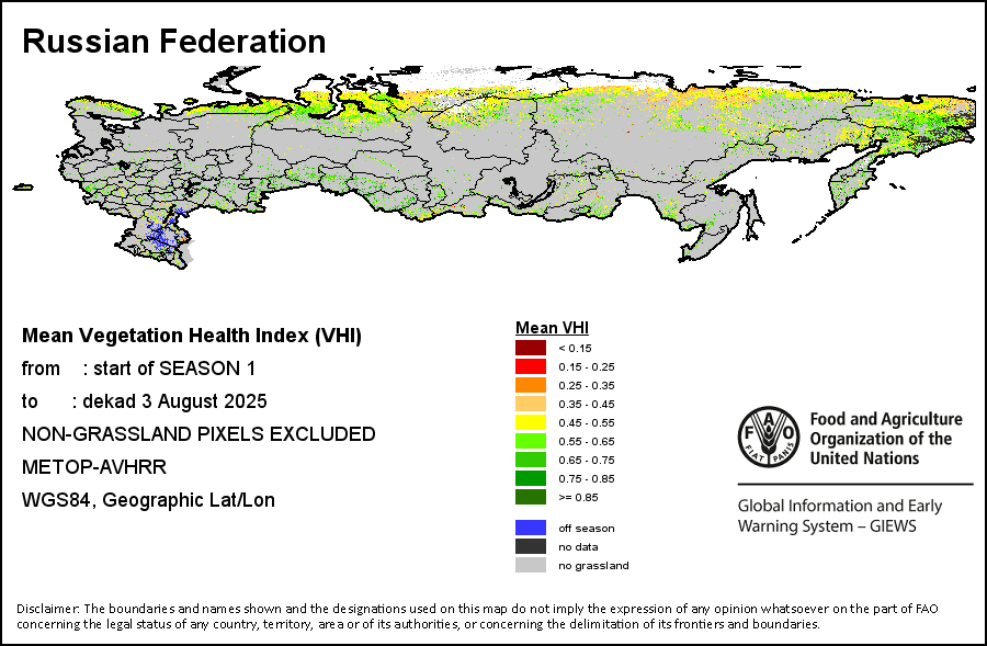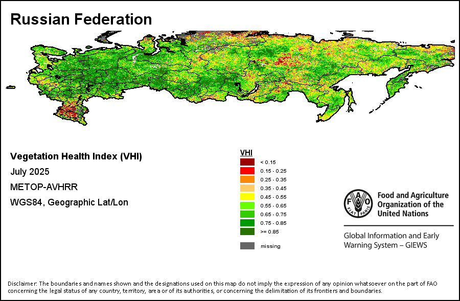 植被健康指数(VHI)根据植被健康状况以及气温对作物状况的影响情况显示干旱的严重程度。 VHI是一项综合指数,是用于计算ASI的基础性指标。它结合了植被状况指数(VCI)和气温状况指数(TCI)。TCI的计算采用了与VCI类似的方程,但它把当前气温与长期最高和最低值联系起来,因为一个假定前提是气温越高就倾向于造成植被状况恶化。比方说,VHI指数下降就意味着植被状况相对较差,而气温越高则意味着植被状况受到胁迫,较长时间延续则成为干旱的指征。VHI映像针对两个主要季节进行计算并分为三种时间模式:旬度、月度和年度。