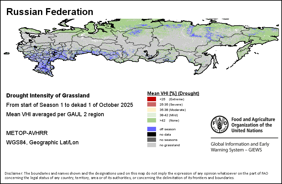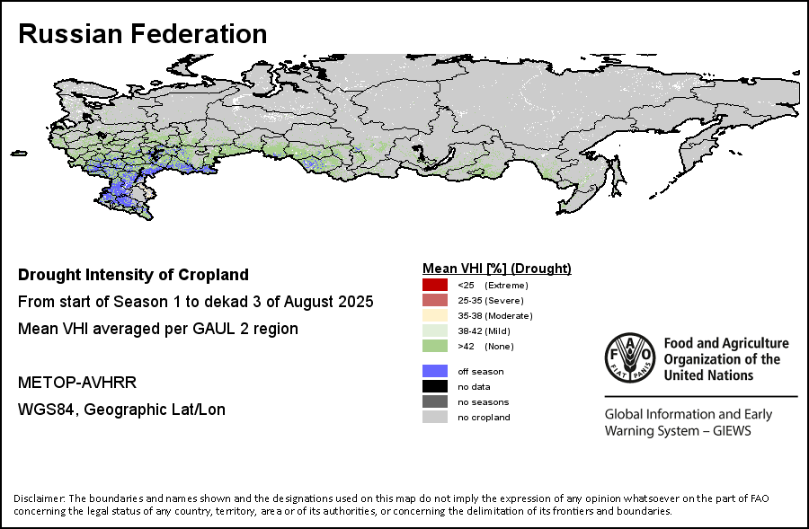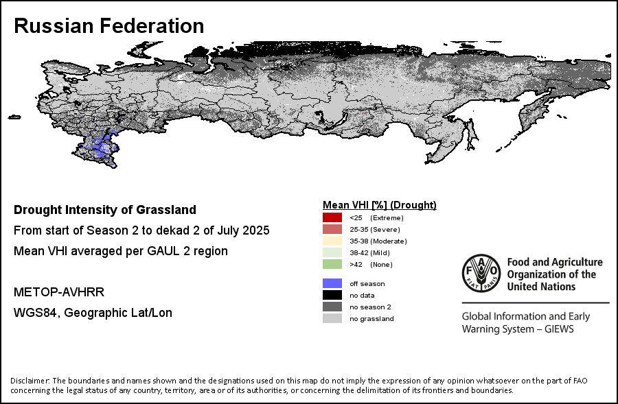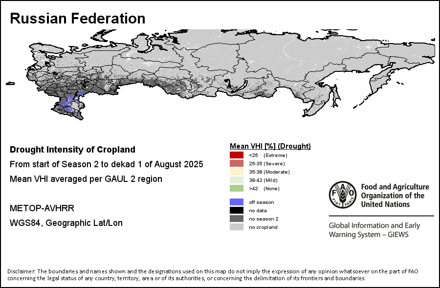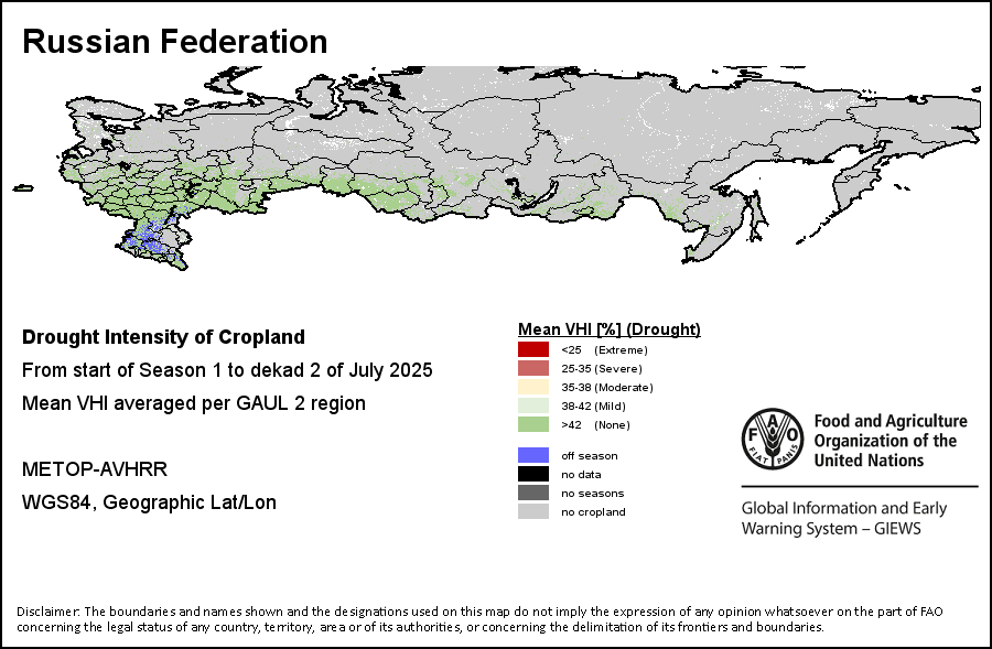 农业干旱依据其强度划分为四类:极端、严重、重度或轻度。 干旱强度通过加权平均植被健康指数计算得出,意味着植被健康状况越差旱情就越严重。年度干旱强度汇总可以用于评估整个生长季节的总体干旱强度。