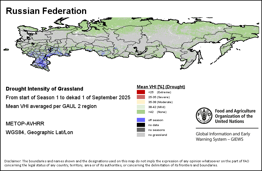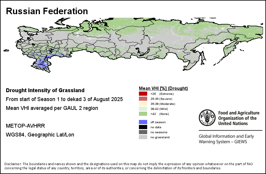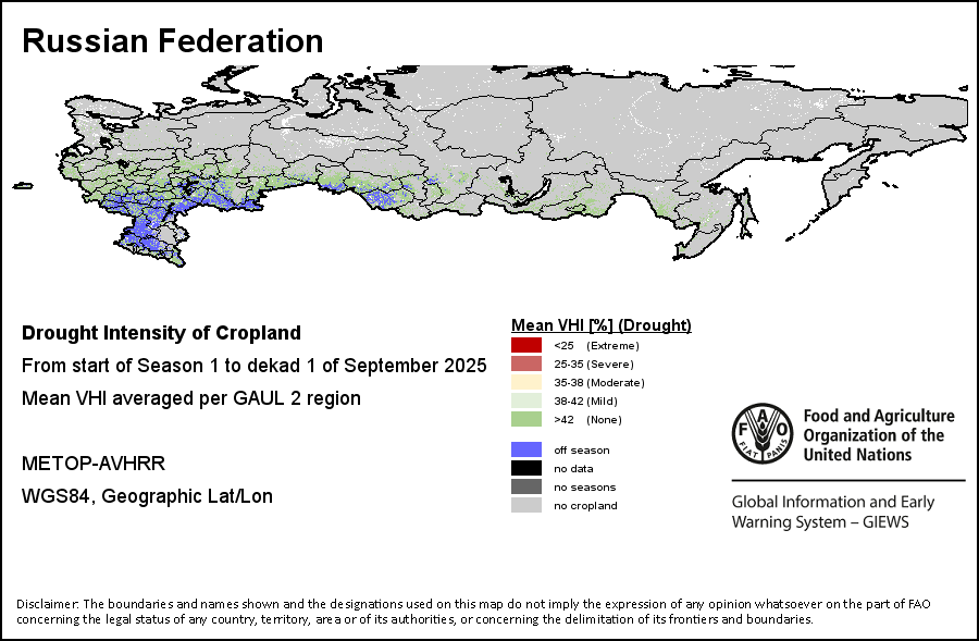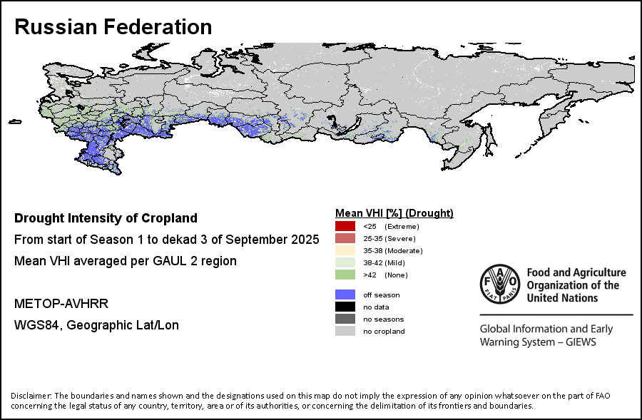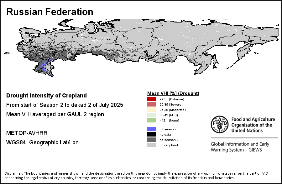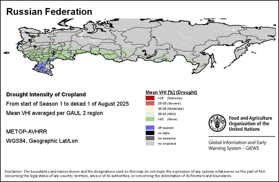 农业干旱依据其强度划分为四类:极端、严重、重度或轻度。 干旱强度通过植被健康指数加权均值计算得出,意味着植被健康状况越差旱情就越严重。年度干旱强度汇总可以用于评估整个生长季节的总体干旱强度。
