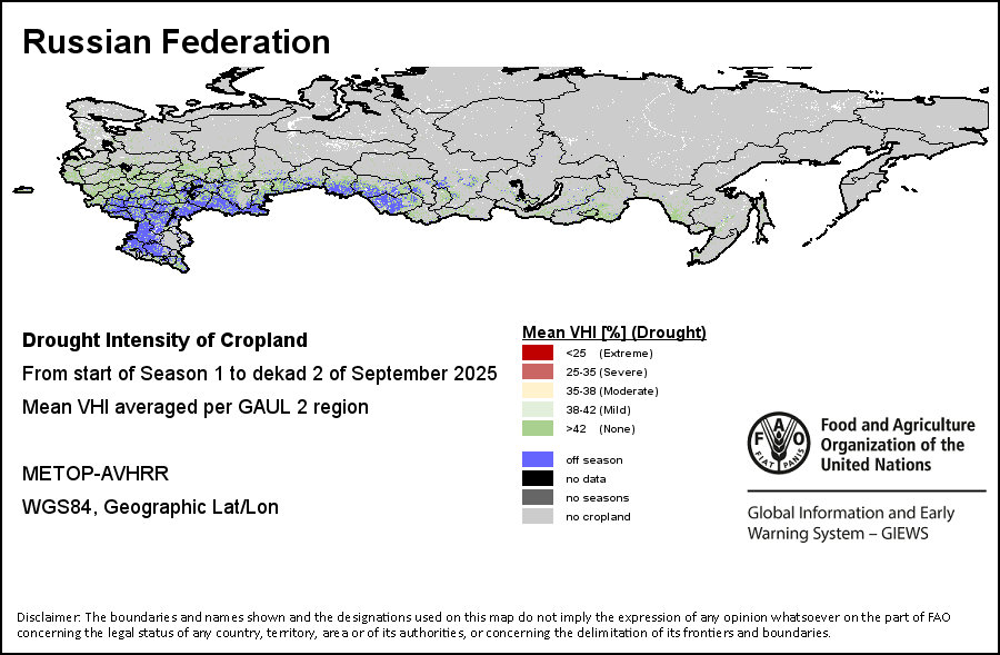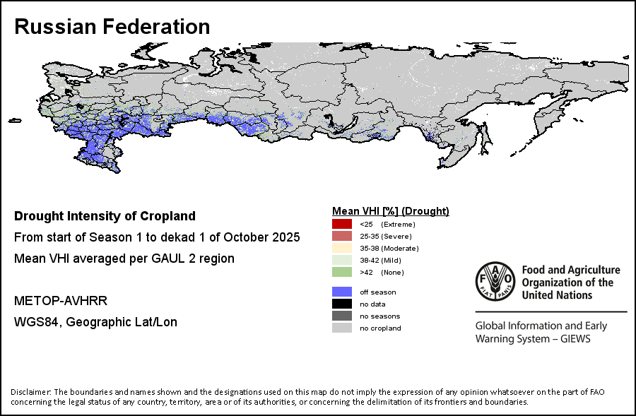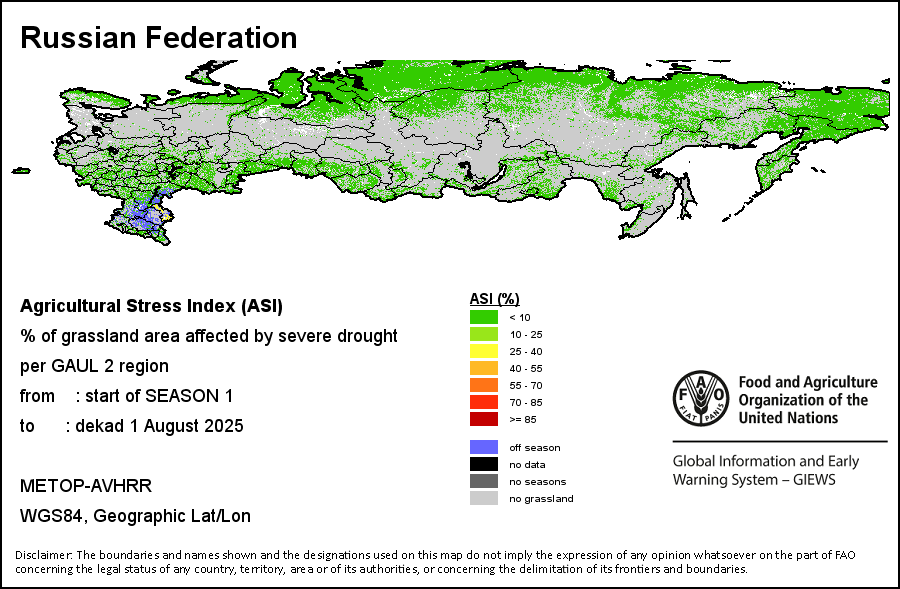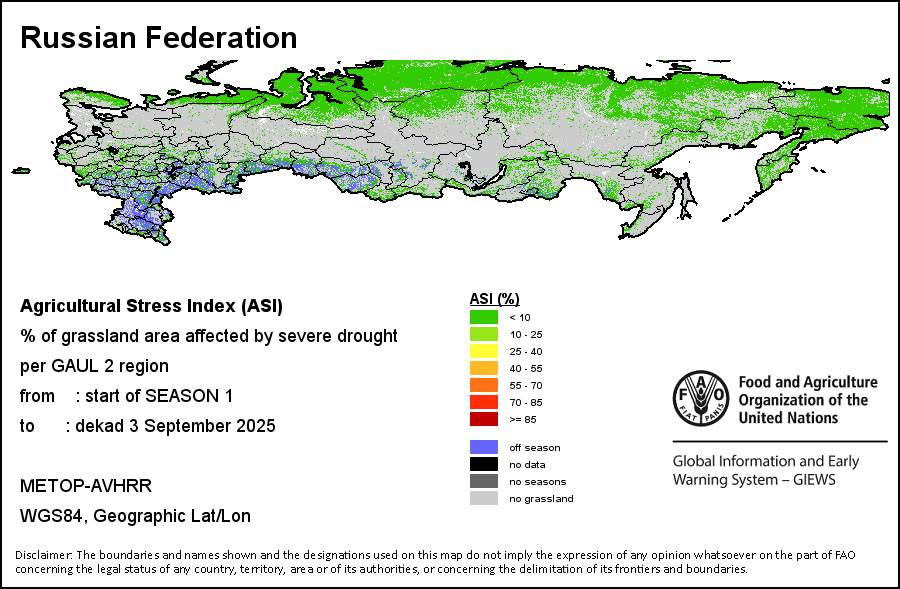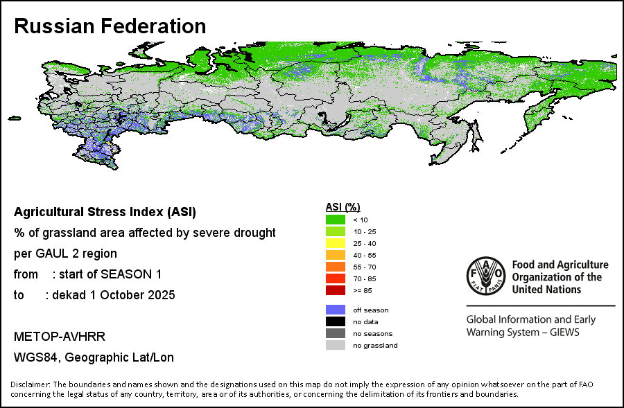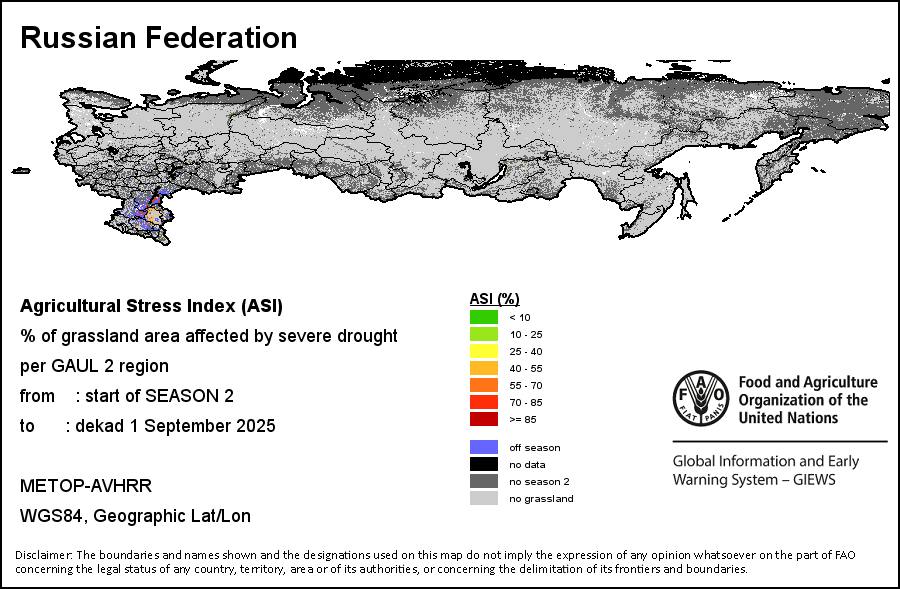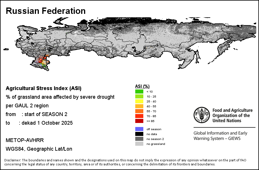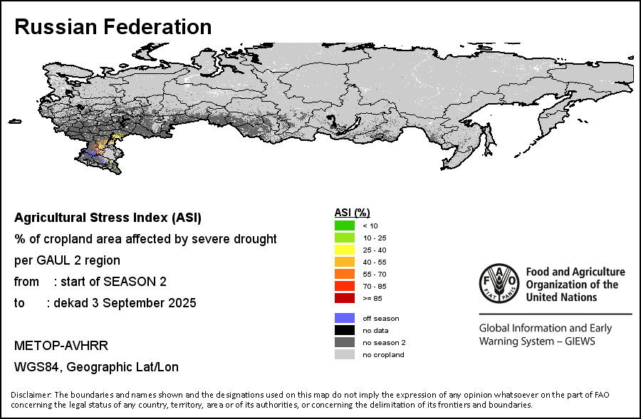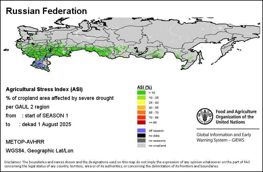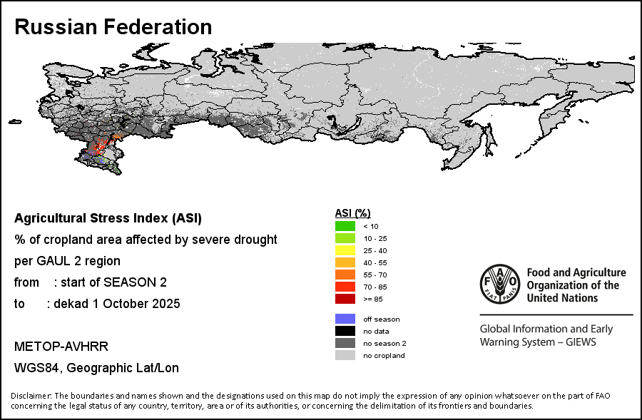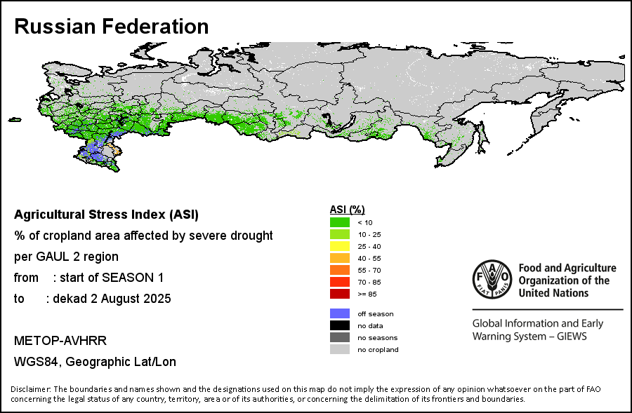 农业干旱胁迫指数(ASI)是一项速览指数,有助于在早期甄别较大可能发生水胁迫(干旱)的耕地。 该指数通过整合植被健康指数(VHI)在评估农业旱情方面具有关键意义的两个维度,即时间和空间维度,而得出。计算农业干旱胁迫指数的第一步是求植被健康指数的时间平均值,对作物周期内旱情的强度和时长进行像素级评估;这项计算包括采用作物系数衡量某种作物在各物候阶段对干旱胁迫的敏感度。第二步是确定旱情的空间广度,方法是计算植被健康指数值低于35%(Kogan前期研究将这一数值确定为评估干旱程度的临界值,1995年)的耕地的像素百分比。然后把各个行政区域根据受影响面积的百分比进行划分,便于对结果进行快速解读。