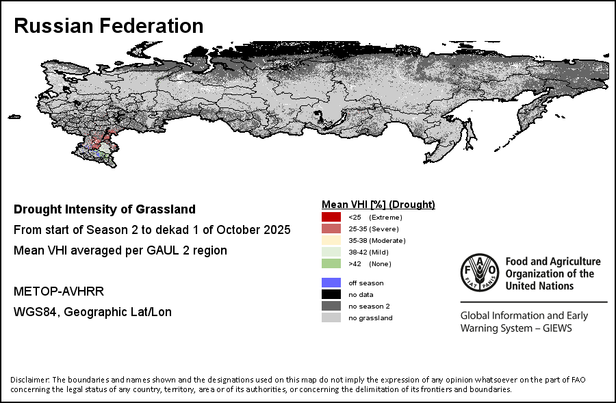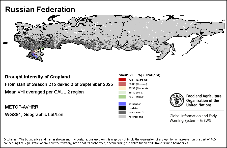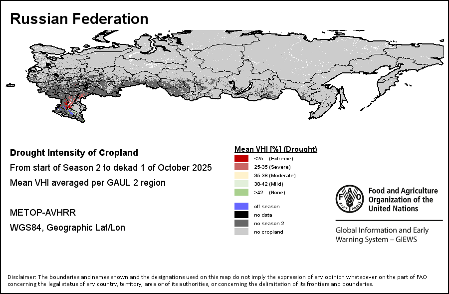 农业干旱依据其强度划分为四类:极端、严重、重度或轻度。干旱的强度通过各全球行政单位分层制度二级区域(GAUL 2)地区累积加权平均植被健康指数计算得出,意味着植被健康状况越差旱情就越严重。
