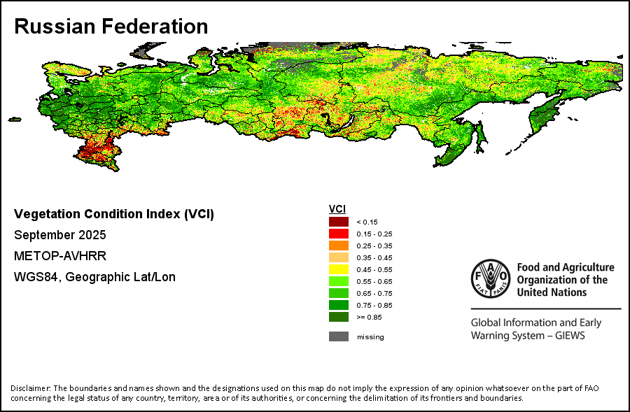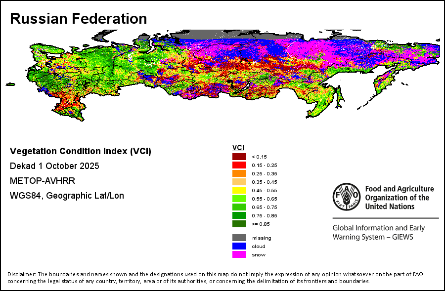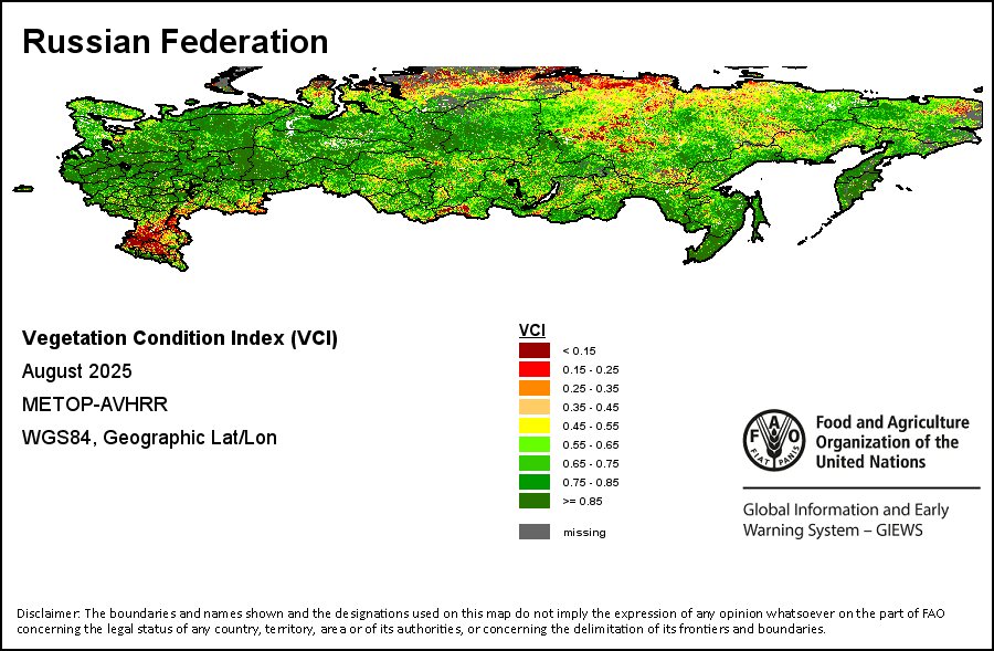 植被状况指数(VCI)评价的是与历史趋势相比当前的植被健康状况。 VCI指数考查的是当前一旬归一化差异植被指数(NDVI)与其长期最小值和最大值之间的关系,使用同一旬的历史NDVI值范围进行归一化计算。VCI的目的是把NDVI中与天气相关的成分从生态要素中分离出来。