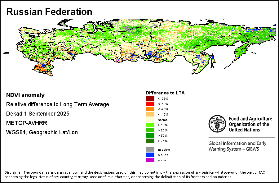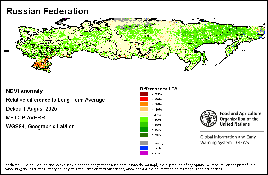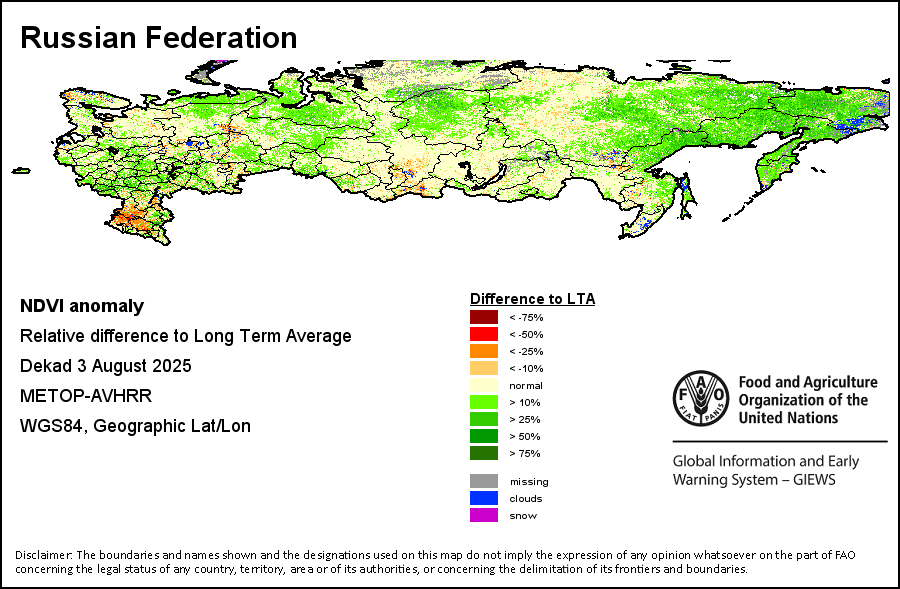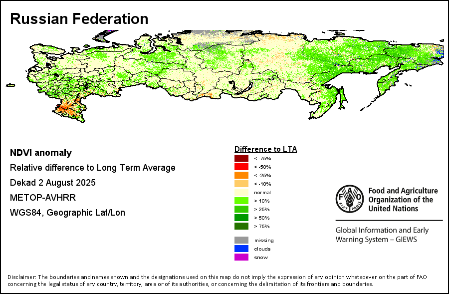 归一化差异植被指数(NDVI)衡量的是地表覆被的绿色程度,以此代表植被的密度和健康度情况。NDVI值的区间从+1至-1,正值越高代表植被的密度和健康度越高,NDVI低值和/或负值则显示植被状况不佳或稀疏。NDVI异常值显示的是当前10天与长期平均值之间的变量,正值(例如20%)就代表植被状况好于平均水平,而负值(如-40%)则代表植被状况相对较差。