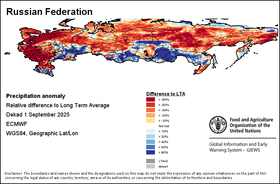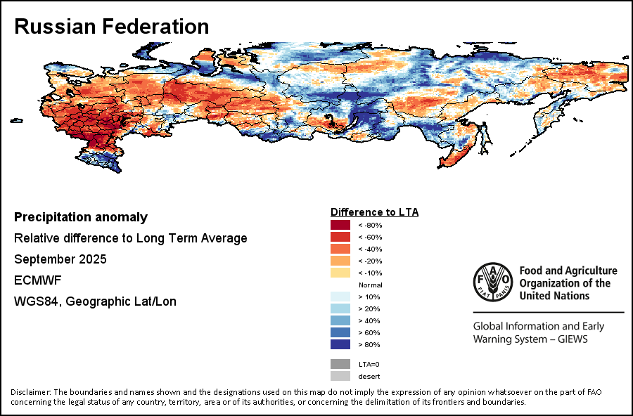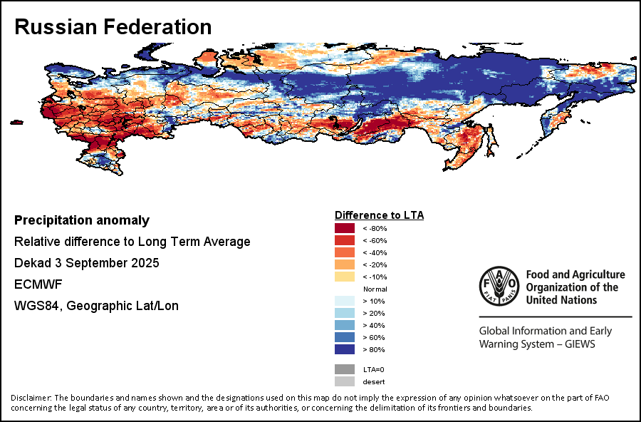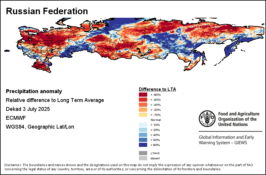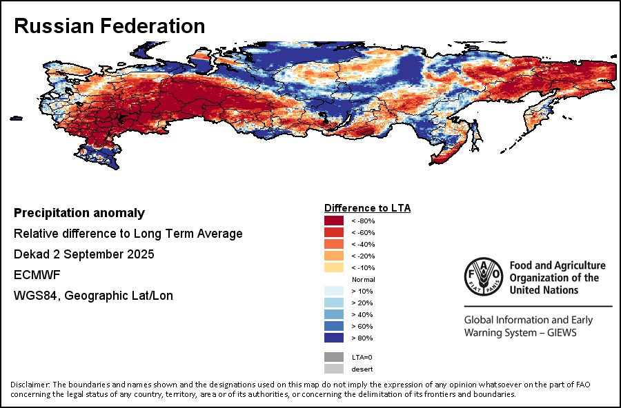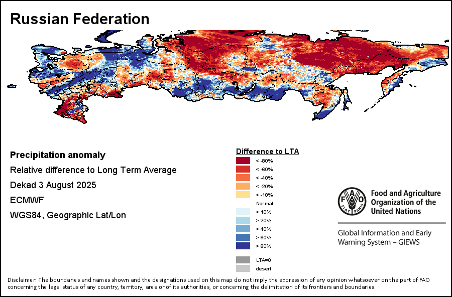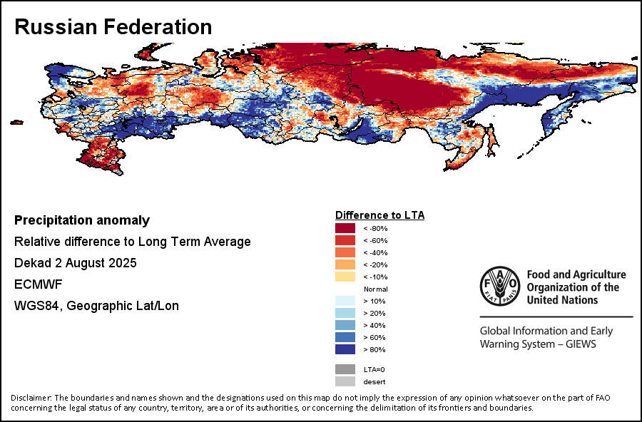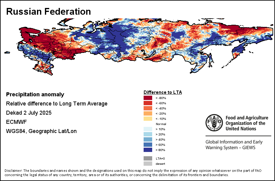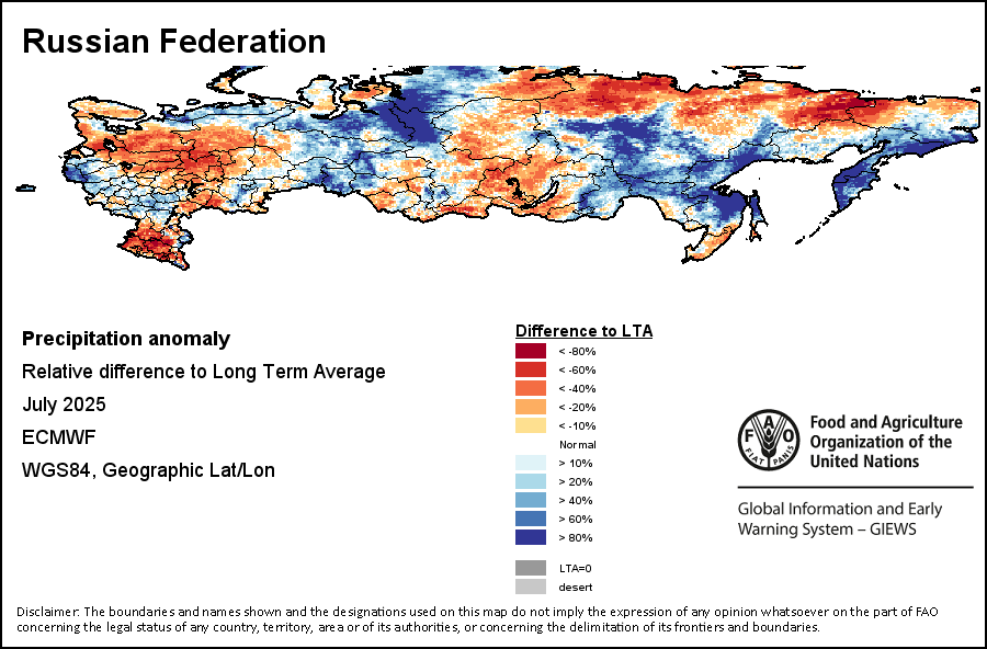 该图谱显示了当前降水量与平均水平之间的差异。 由降水量水平与长期平均值(LTA)进行比较得出,长期平均值系指1989-2015年期间的数值。暖色调指示的是降水量低于平均水平的地区,而冷色调指示的则是降水量高于平均水平的地区。降雨量估算数据来自欧洲中期天气预报这些(ECMWF)。