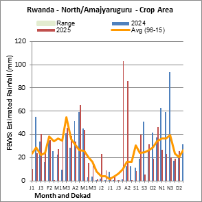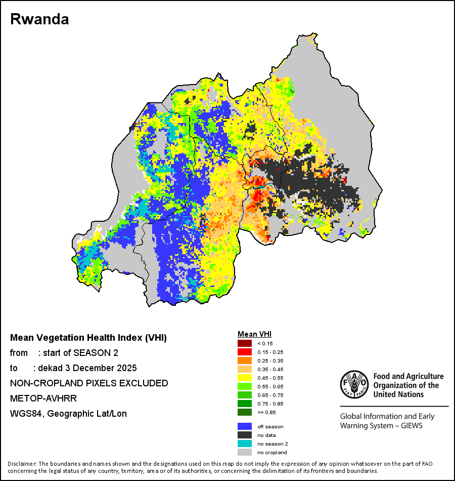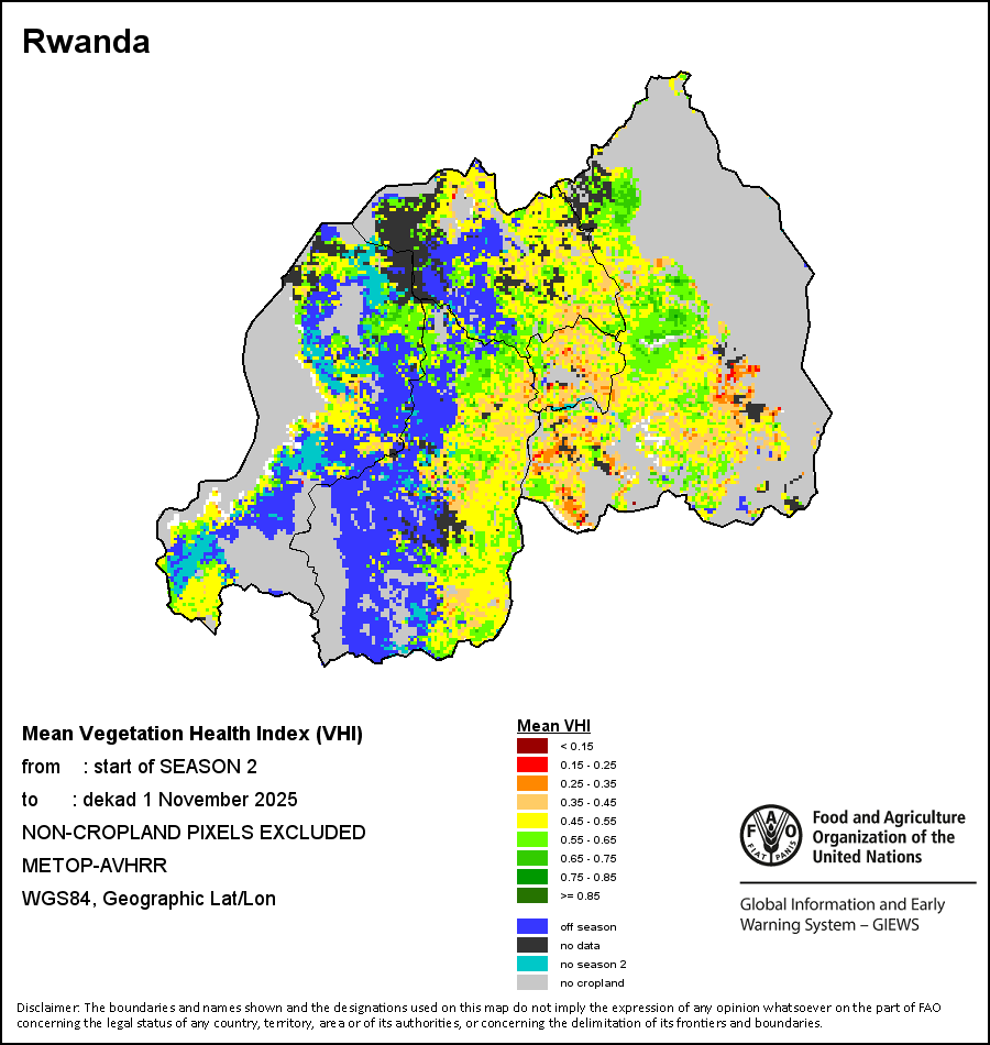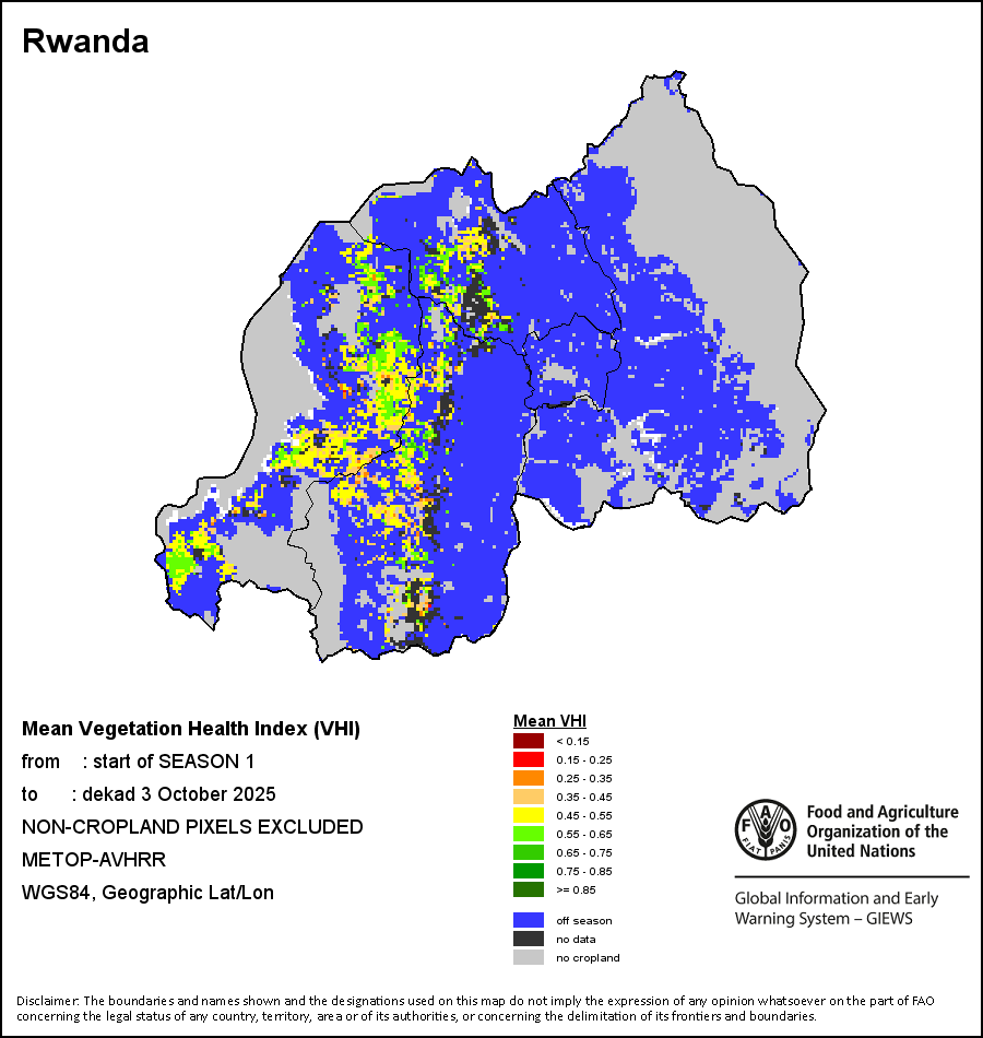 The country level maps and graphs depict the latest 36-month period of the seasonal, vegetation and precipitation indicators. The data is presented by dekad and month. All three vegetation indicators are based on 10-day (dekadal) vegetation data from the METOP-AVHRR sensor at 1 km resolution (2007 and after). Data at 1 km resolution for the period 1984-2006 are derived from the NOAA-AVHRR dataset at 16 km resolution. Precipitation estimates for all African countries (except Cabo Verde and Mauritius) are taken from NOAA/FEWSNet (16 km resolution), while for the remaining countries data is obtained from ECMWF (25 km resolution). Owing to the higher resolution of vegetation indicators (e.g., NDVI, VHI) compared to coarser precipitation indicators, the number of sub-national units for which valid zonal statistics can be generated for vegetation indices is greater than the number of units for precipitation indicators for certain countries.