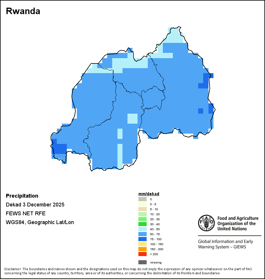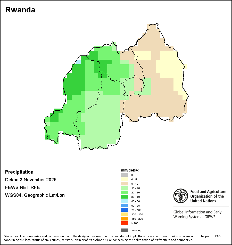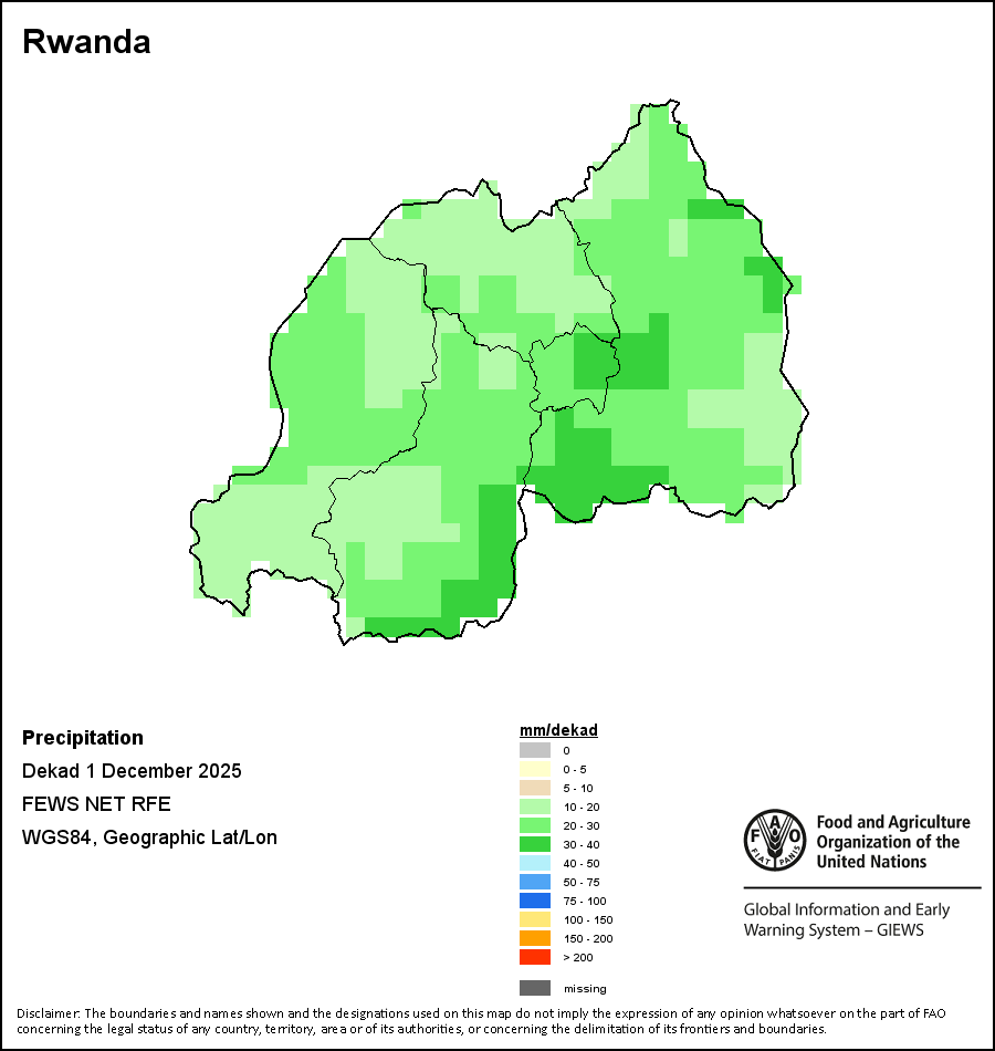 The map depicts cumulative rainfall volumes over a dekad (a 10-day period). Precipitation estimates for all African countries (except Cabo Verde and Mauritius) are taken from NOAA/FEWSNet, while for the remaining countries data is obtained from ECMWF.