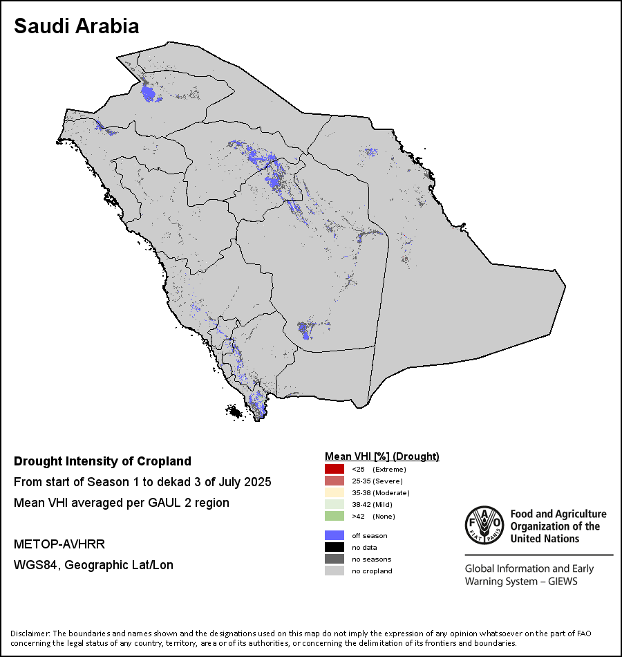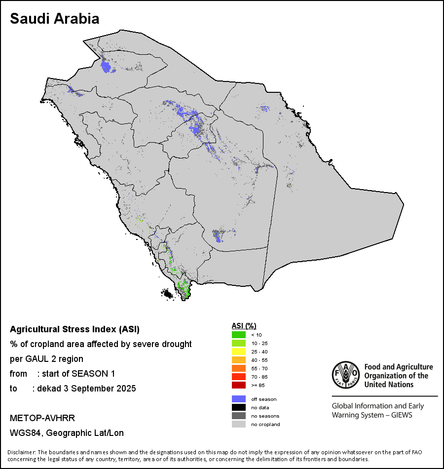 The Agricultural Stress Index (ASI) is a quick-look indicator that facilitates the early identification of cropped land with a high likelihood of water stress (drought). The Index is based on the integration of the Vegetation Health Index (VHI) in two dimensions that are critical in the assessment of a drought event in agriculture: temporal and spatial. The first step of the ASI calculation is a temporal averaging of the VHI, assessing the intensity and duration of dry periods occurring during the crop cycle at the pixel level; this calculation includes the use of crop coefficients, which introduces sensitivity of a crop to water stress during each phenological phase. The second step determines the spatial extent of drought events by calculating the percentage of pixels in arable areas with a VHI value below 35 percent (this value was identified as a critical threshold in assessing the extent of drought in previous research by Kogan, 1995). Each administrative area is classified according to the percentage of the affected area to facilitate the quick interpretation of results.