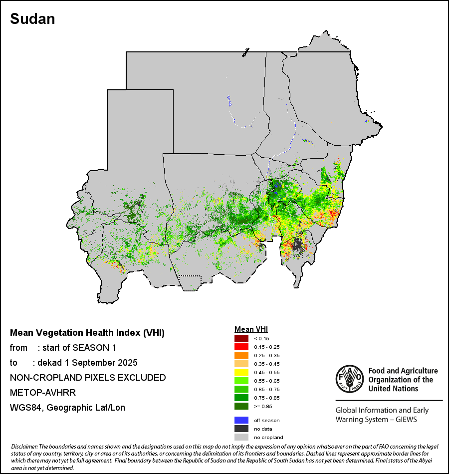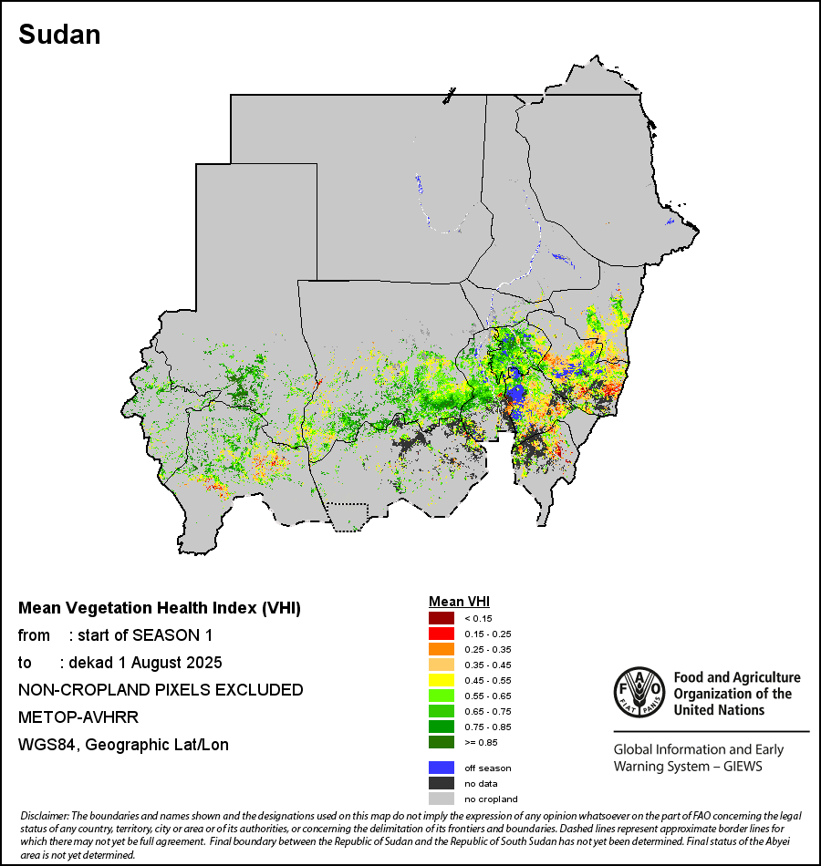 يقيس المؤشر الموحد لتباين الغطاء النباتي مستوى "خضرة" الغطاء النباتي ويُستخدم على نحوٍ غير مباشر للإشارة إلى كثافة النباتات وصحتها. وتتراوح قيم المؤشر الموحد من + 1 إلى -1، حيث تمثل القيم الإيجابية العالية نباتات كثيفة وسليمة، أما القيم المتدنية أو السالبة للمؤشر فتدل على حالة نباتات ضعيفة أو غطاء نباتي مبعثر. ويشير الشذوذ في المؤشر الموحد لتباين الغطاء النباتي إلى التباين ما بين فترة العشرة أيام الراهنة والمعدل طويل الأجل، حيث تدل القيمة الإيجابية (20 في المائة مثلاً) عن تحسن في حالة النباتات قياساً بالمعدل، بينما تدل القيمة السالبة (-40 في المائة مثلاً) على ضعف حالة النباتات نسبياً.