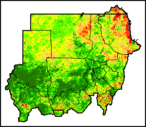 خضعت دراسة المؤشر الموحد لتباين الغطاء النباتي إلى مقارنة مع المعدل طويل الأجل (1984- 2015) وبيانات العام السابق على المستوى الإداري الأول.