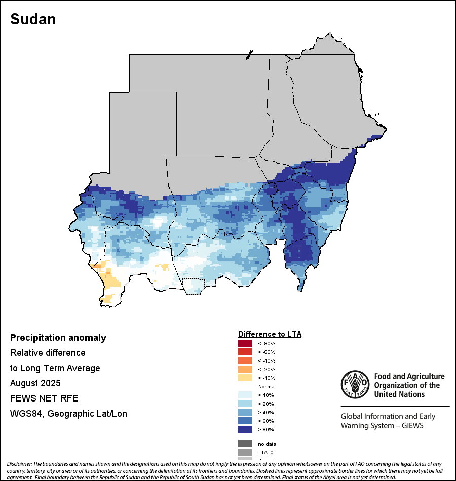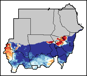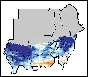 توضح الخريطة الاختلاف بين كمية الهطولات المطرية الراهنة ومعدلها. تقارَن مستويات الهطولات المطرية مع المعدل طويل الأجل الذي يشير إلى الفترة ما بين 1989-2015.