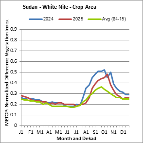 The Normalized Difference Vegetation Index (NDVI) measures the “greenness” of ground cover and is used as a proxy to indicate the density and health of vegetation. NDVI values range from +1 to -1, with high positive values corresponding to dense and healthy vegetation, and low and/or negative NDVI values indicating poor vegetation conditions or sparse vegetative cover. The NDVI anomaly indicates the variation of the current dekad to the long-term average, where a positive value (for example 20 percent) would signify enhanced vegetation conditions compared to the average, while a negative value (for instance -40 percent) would indicate comparatively poor vegetation conditions.