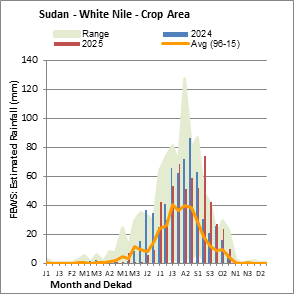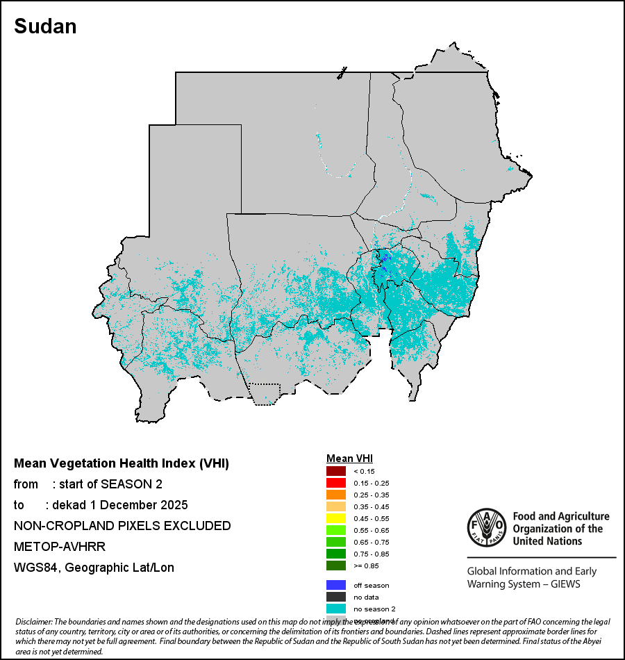 The country level maps and graphs depict the latest 36-month period of the seasonal, vegetation and precipitation indicators. The data is presented by dekad and month. All three vegetation indicators are based on 10-day (dekadal) vegetation data from the METOP-AVHRR sensor at 1 km resolution (2007 and after). Data at 1 km resolution for the period 1984-2006 are derived from the NOAA-AVHRR dataset at 16 km resolution. Precipitation estimates for all African countries (except Cabo Verde and Mauritius) are taken from NOAA/FEWSNet (16 km resolution), while for the remaining countries data is obtained from ECMWF (25 km resolution). Owing to the higher resolution of vegetation indicators (e.g., NDVI, VHI) compared to coarser precipitation indicators, the number of sub-national units for which valid zonal statistics can be generated for vegetation indices is greater than the number of units for precipitation indicators for certain countries.