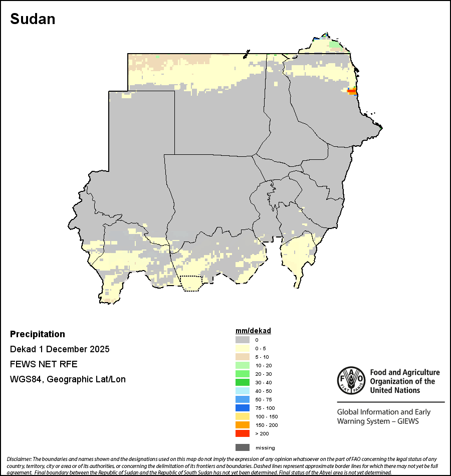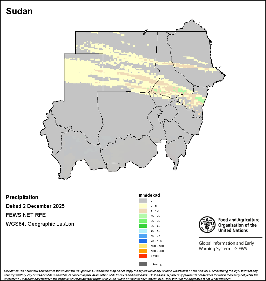 The map depicts cumulative rainfall volumes over a dekad (a 10-day period). Precipitation estimates for all African countries (except Cabo Verde and Mauritius) are taken from NOAA/FEWSNet, while for the remaining countries data is obtained from ECMWF.