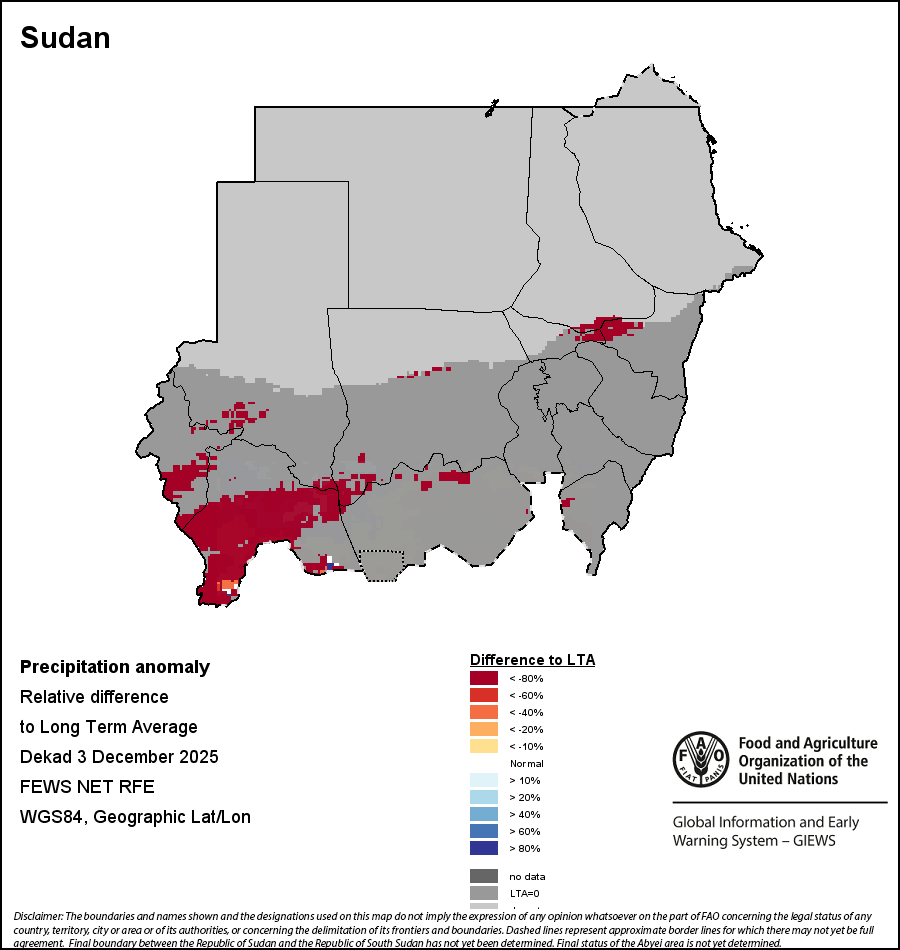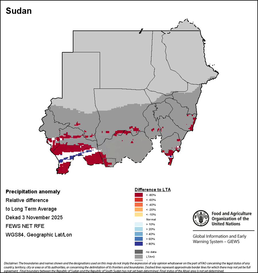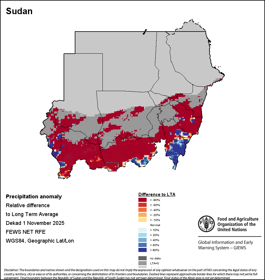 The map illustrates the difference between the current rainfall volume and the average level. Rainfall levels are compared with the Long-Term Average (LTA), which refers to the period 1989-2015. Warmer colours identify areas which have received lower-than-average rainfall, while colder colours are given to areas where precipitation has been above average.
