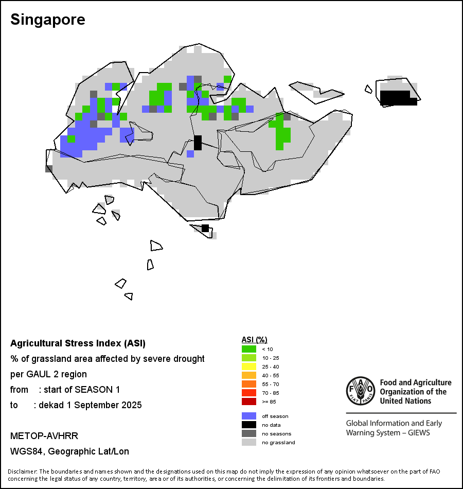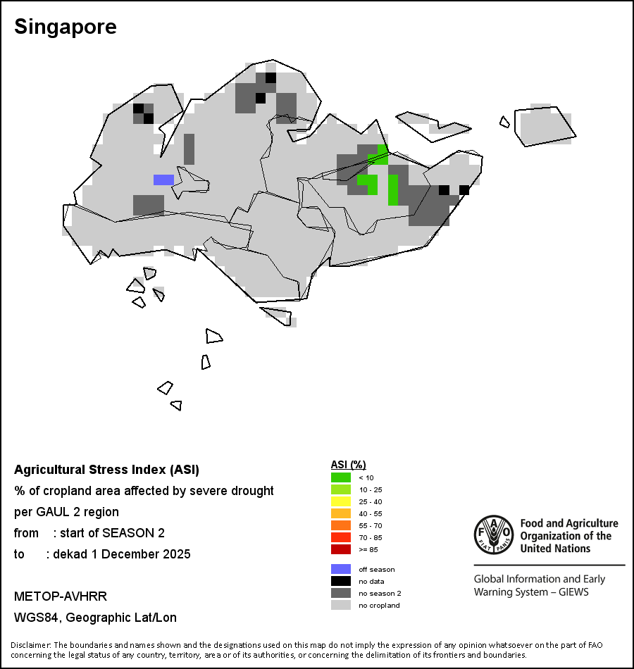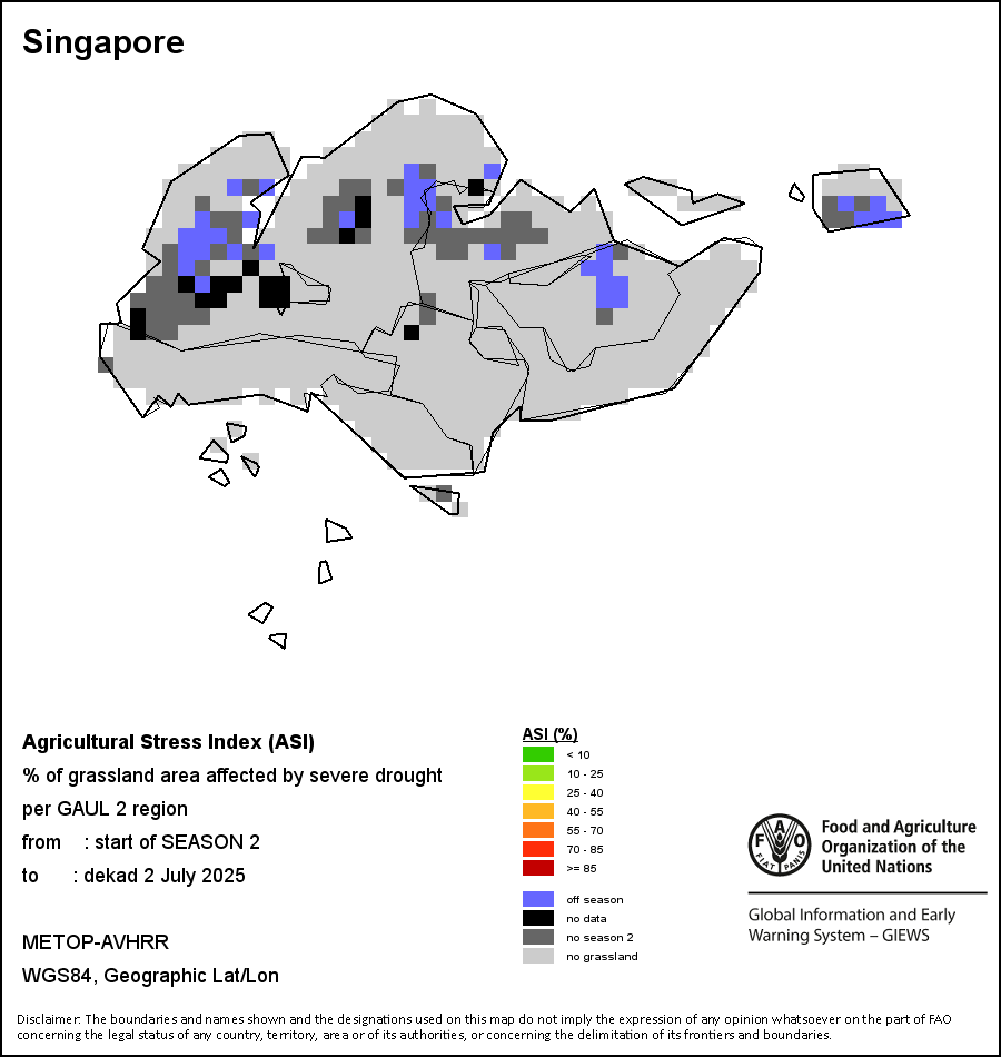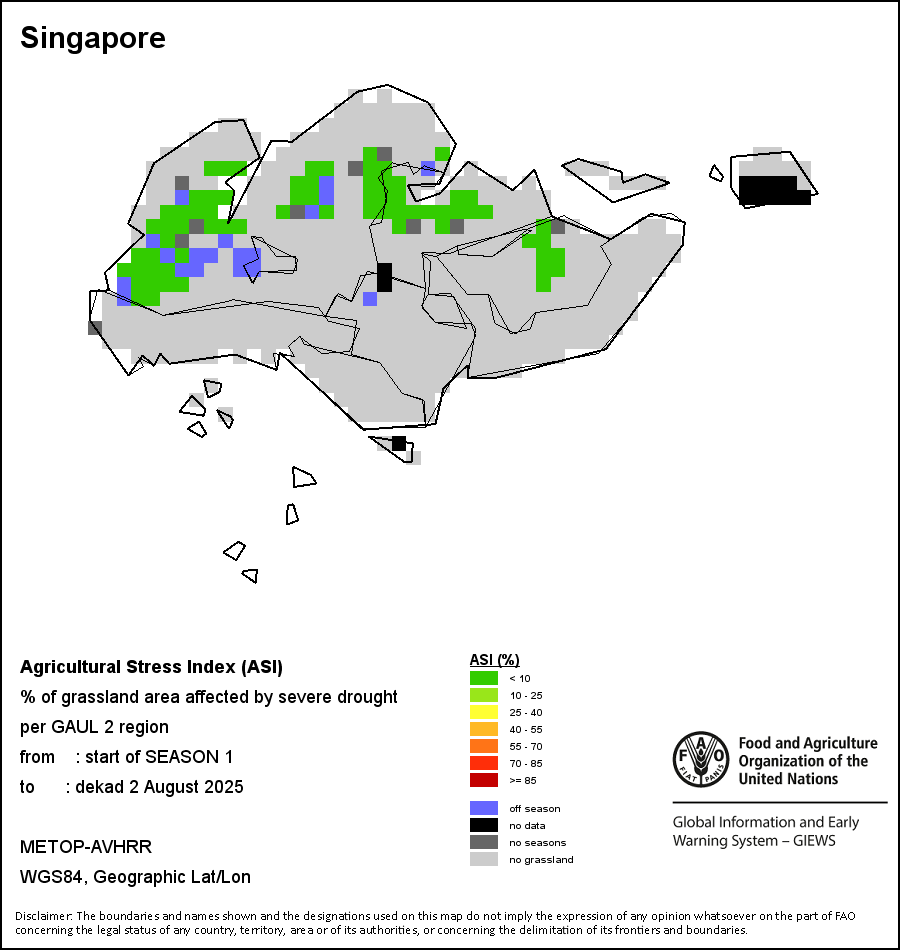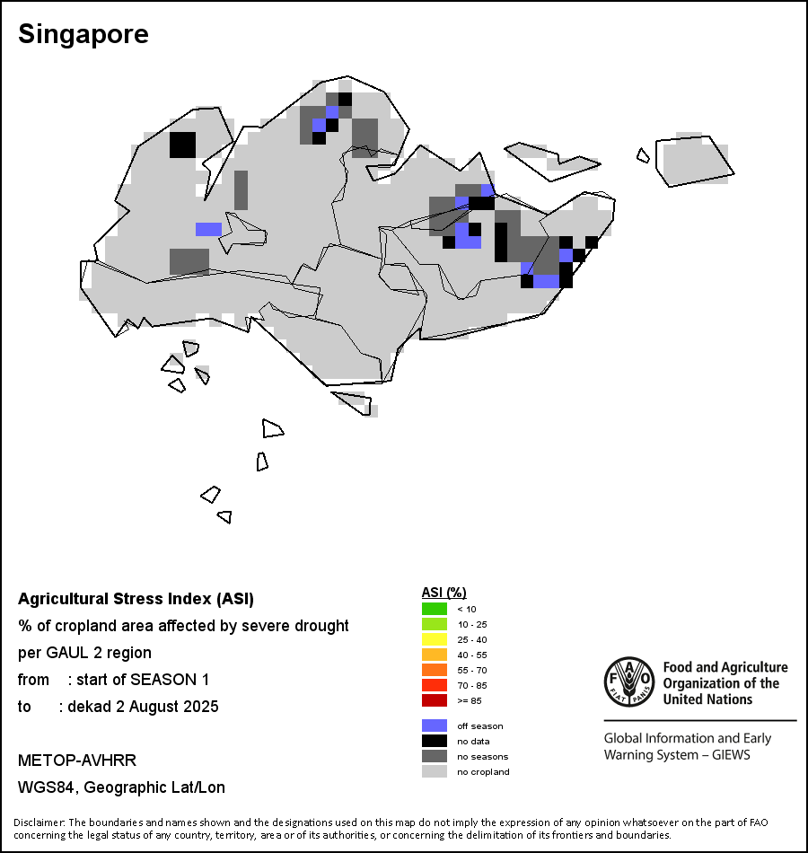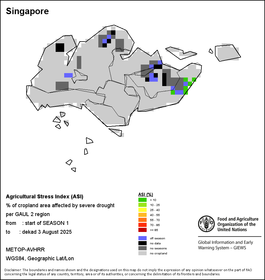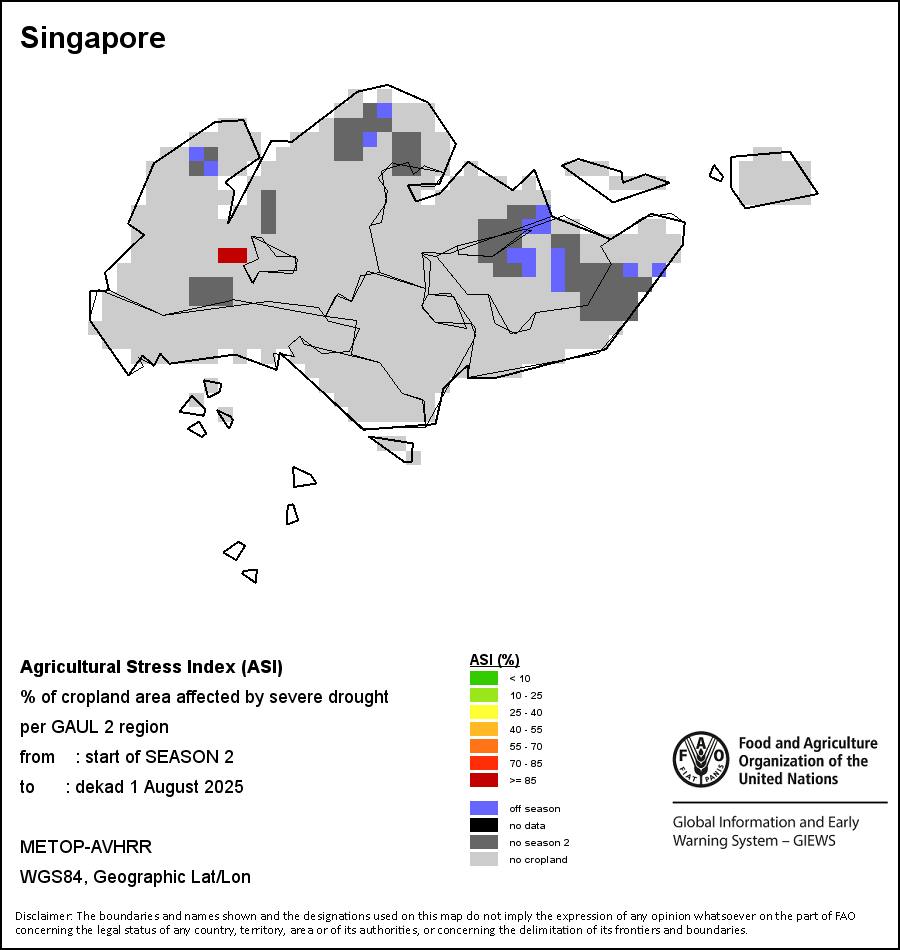 The Agricultural Stress Index (ASI) is a quick-look indicator that facilitates the early identification of cropped land with a high likelihood of water stress (drought). The Index is based on the integration of the Vegetation Health Index (VHI) in two dimensions that are critical in the assessment of a drought event in agriculture: temporal and spatial. The first step of the ASI calculation is a temporal averaging of the VHI, assessing the intensity and duration of dry periods occurring during the crop cycle at the pixel level; this calculation includes the use of crop coefficients, which introduces sensitivity of a crop to water stress during each phenological phase. The second step determines the spatial extent of drought events by calculating the percentage of pixels in arable areas with a VHI value below 35 percent (this value was identified as a critical threshold in assessing the extent of drought in previous research by Kogan, 1995). Each administrative area is classified according to the percentage of the affected area to facilitate the quick interpretation of results.