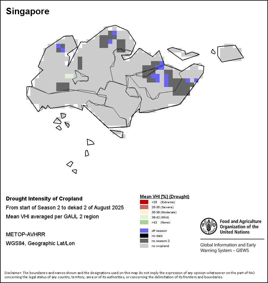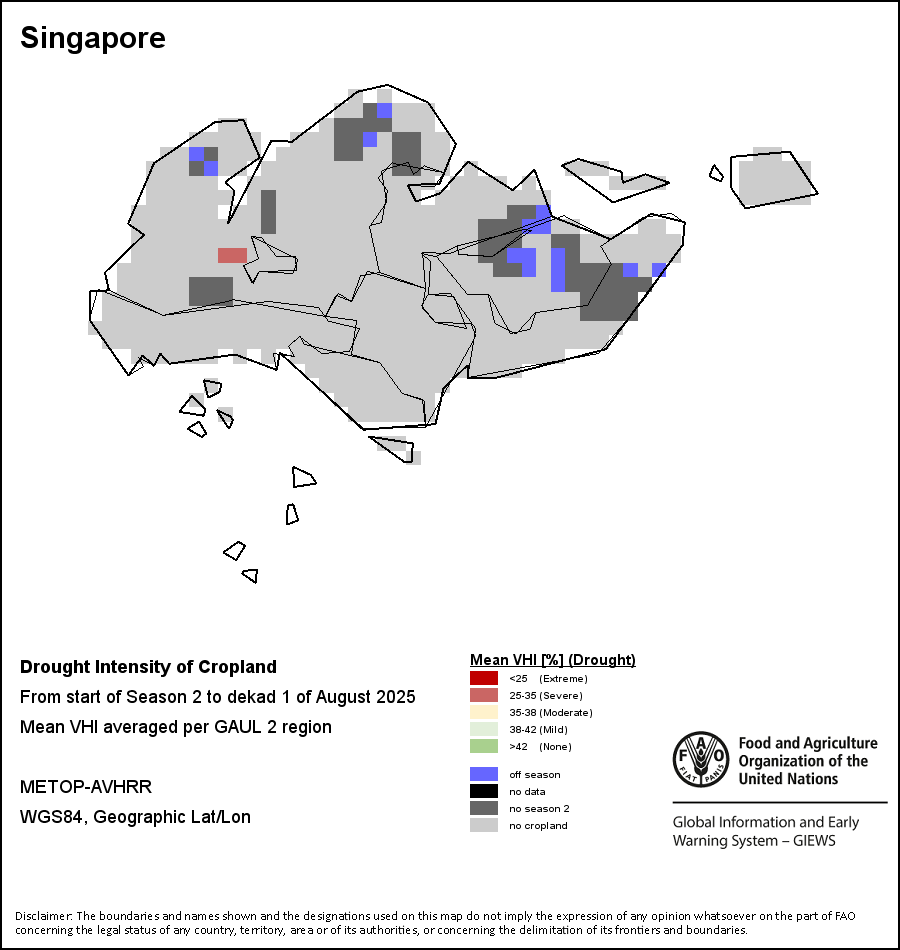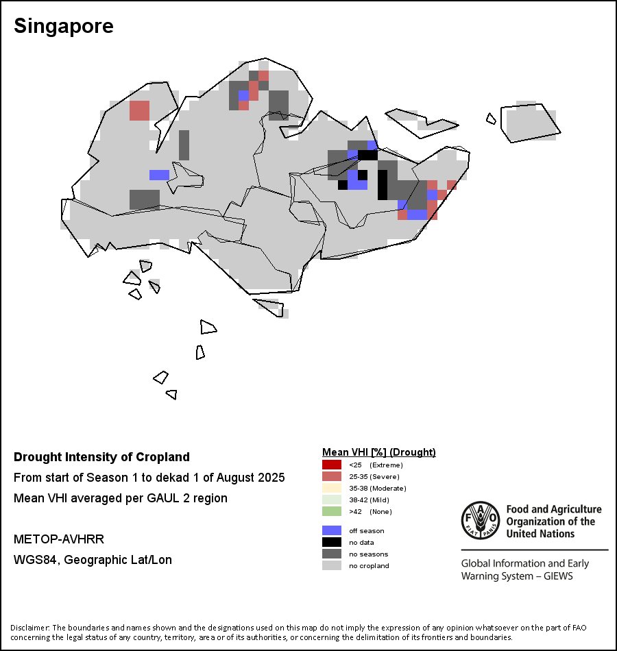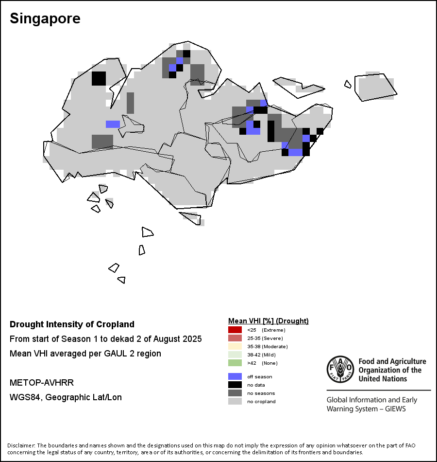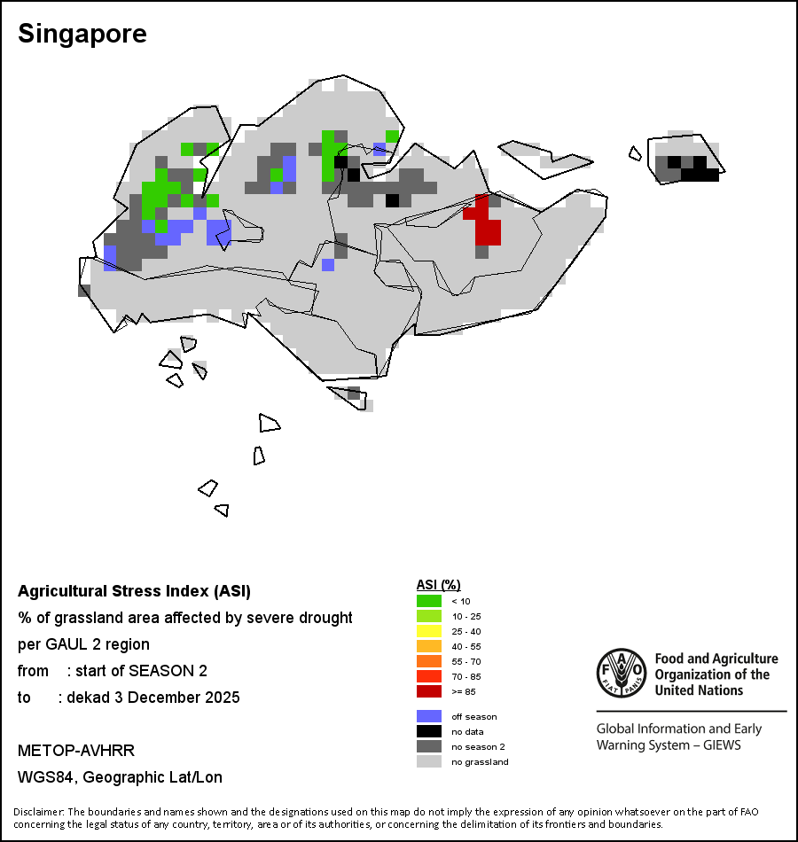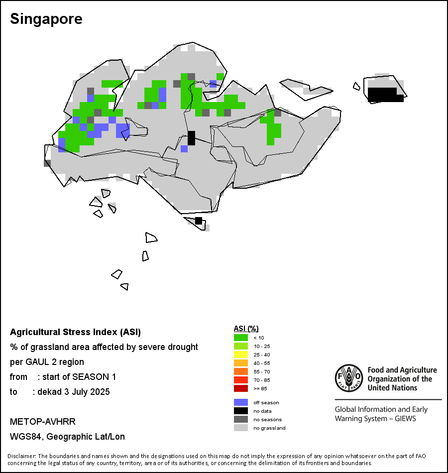 The Agricultural Stress Index (ASI) is a quick-look indicator that facilitates the early identification of cropped land with a high likelihood of water stress (drought). The Index is based on the integration of the Vegetation Health Index (VHI) in two dimensions that are critical in the assessment of a drought event in agriculture: temporal and spatial. The first step of the ASI calculation is a temporal averaging of the VHI, assessing the intensity and duration of dry periods occurring during the crop cycle at the pixel level; this calculation includes the use of crop coefficients, which introduces sensitivity of a crop to water stress during each phenological phase. The second step determines the spatial extent of drought events by calculating the percentage of pixels in arable areas with a VHI value below 35 percent (this value was identified as a critical threshold in assessing the extent of drought in previous research by Kogan, 1995). Each administrative area is classified according to the percentage of the affected area to facilitate the quick interpretation of results.