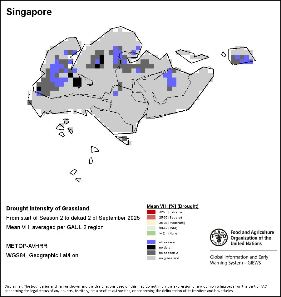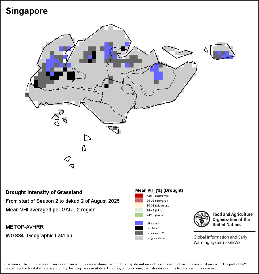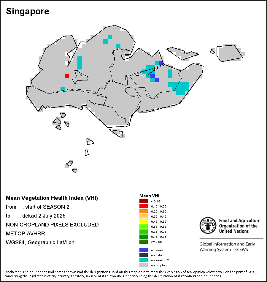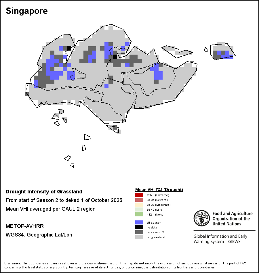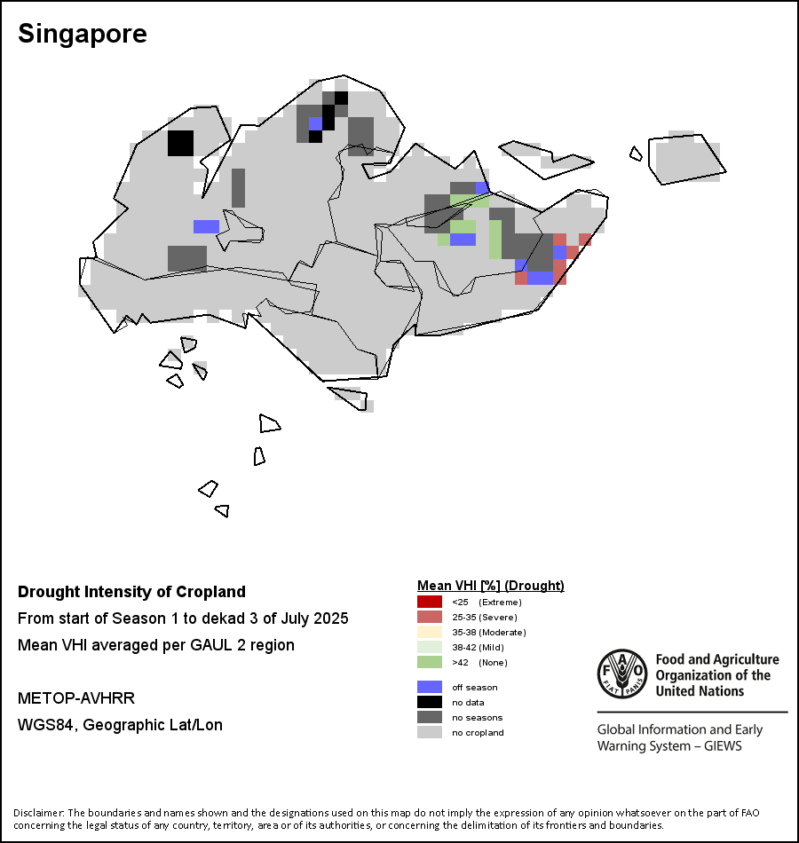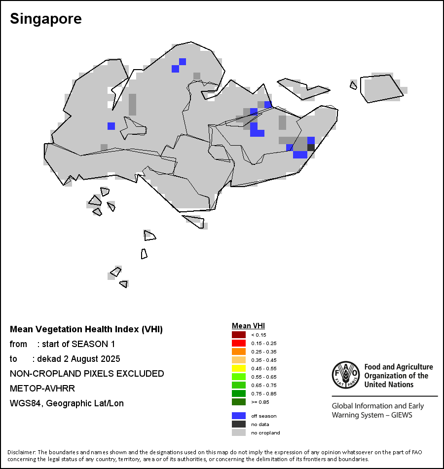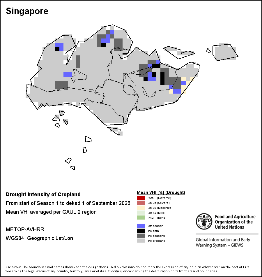 The Agricultural Stress Index (ASI) is a quick-look indicator that facilitates the early identification of cropped land with a high likelihood of water stress (drought). The Index is based on the integration of the Vegetation Health Index (VHI) in two dimensions that are critical in the assessment of a drought event in agriculture: temporal and spatial. The first step of the ASI calculation is a temporal averaging of the VHI, assessing the intensity and duration of dry periods occurring during the crop cycle at the pixel level; this calculation includes the use of crop coefficients, which introduces sensitivity of a crop to water stress during each phenological phase. The second step determines the spatial extent of drought events by calculating the percentage of pixels in arable areas with a VHI value below 35 percent (this value was identified as a critical threshold in assessing the extent of drought in previous research by Kogan, 1995). Each administrative area is classified according to the percentage of the affected area to facilitate the quick interpretation of results.