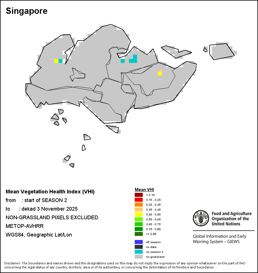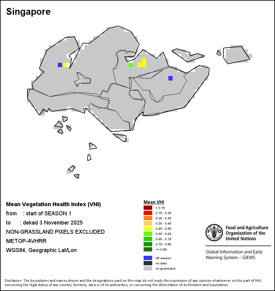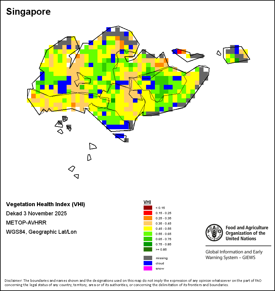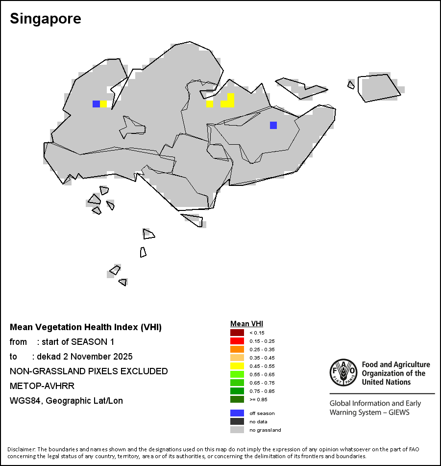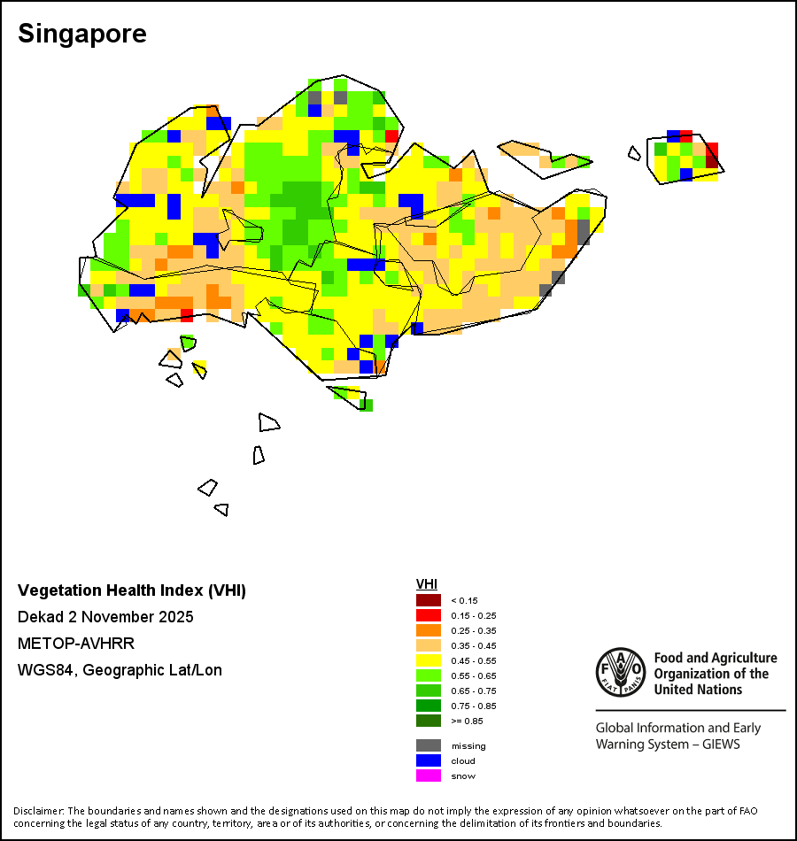 The country level maps and graphs depict the latest 36-month period of the seasonal, vegetation and precipitation indicators. The data is presented by dekad and month. All three vegetation indicators are based on 10-day (dekadal) vegetation data from the METOP-AVHRR sensor at 1 km resolution (2007 and after). Data at 1 km resolution for the period 1984-2006 are derived from the NOAA-AVHRR dataset at 16 km resolution. Precipitation estimates for all African countries (except Cabo Verde and Mauritius) are taken from NOAA/FEWSNet (16 km resolution), while for the remaining countries data is obtained from ECMWF (25 km resolution). Owing to the higher resolution of vegetation indicators (e.g., NDVI, VHI) compared to coarser precipitation indicators, the number of sub-national units for which valid zonal statistics can be generated for vegetation indices is greater than the number of units for precipitation indicators for certain countries.