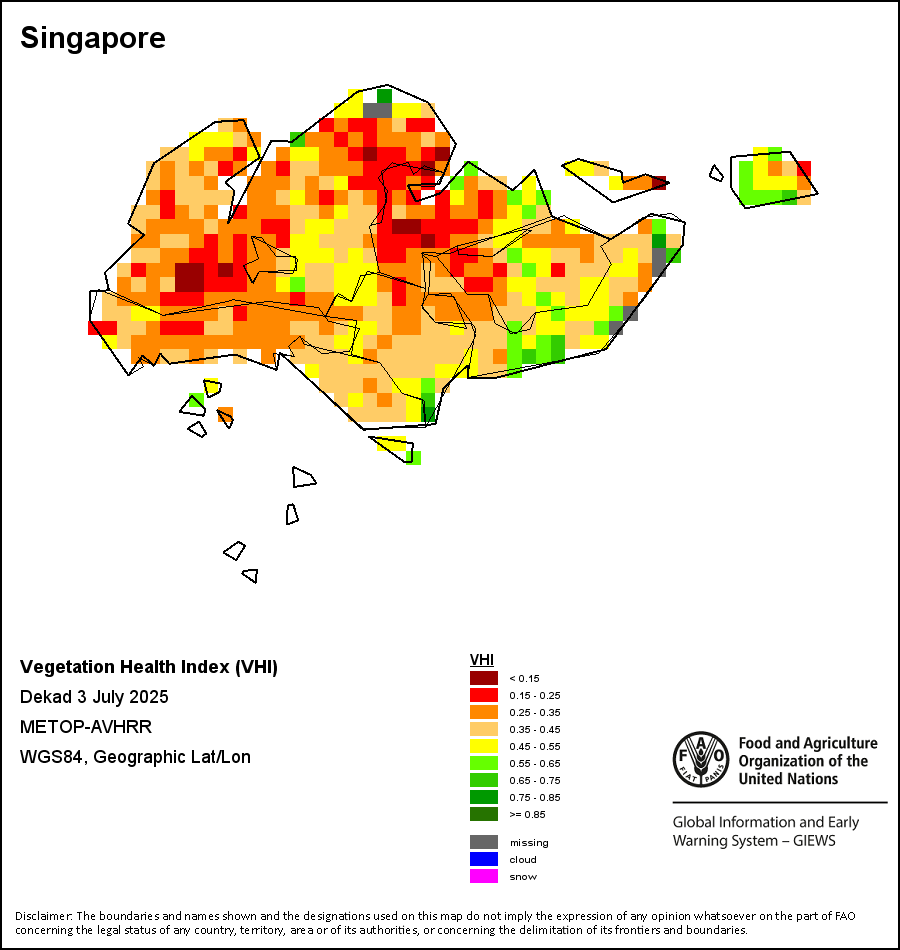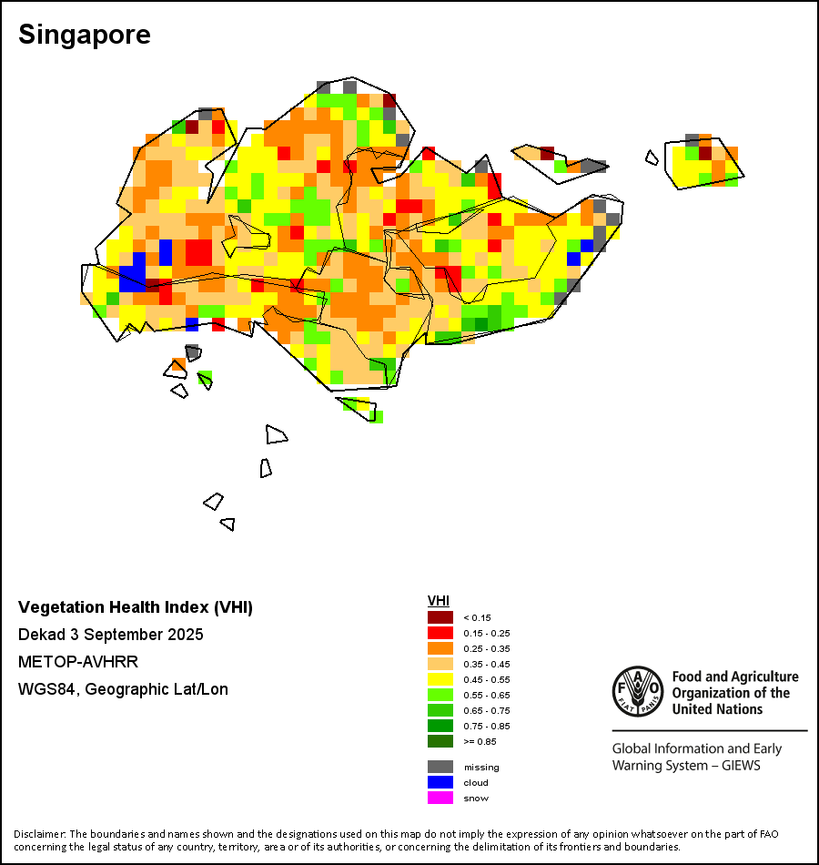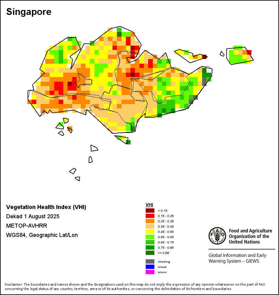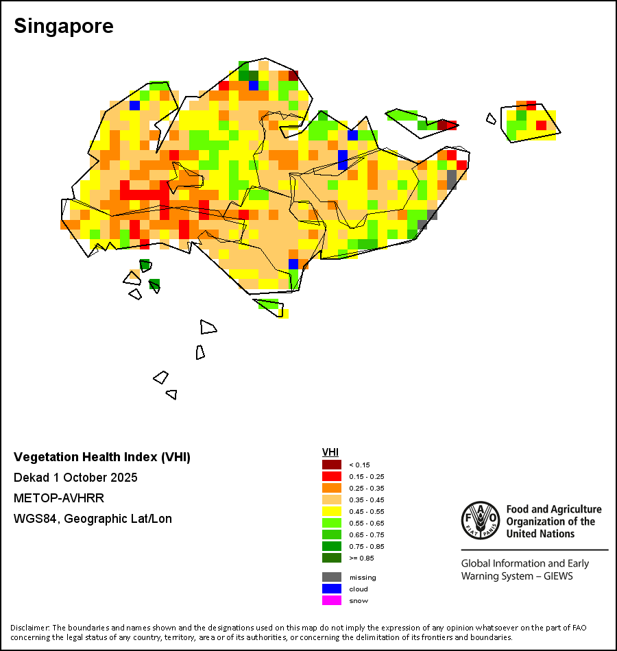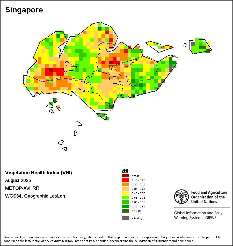 The Vegetation Health Index (VHI) illustrates the severity of drought based on the vegetation health and the influence of temperature on plant conditions. The VHI is a composite index and the elementary indicator used to compute the ASI. It combines both the Vegetation Condition Index (VCI) and the Temperature Condition Index (TCI). The TCI is calculated using a similar equation to the VCI, but relates the current temperature to the long-term maximum and minimum , as it is assumed that higher temperatures tend to cause a deterioration in vegetation conditions. A decrease in the VHI would, for example, indicate relatively poor vegetation conditions and warmer temperatures, signifying stressed vegetation conditions, and over a longer period would be indicative of drought. The VHI images are computed for the two main seasons and in three modalities: dekadal, monthly and annual.