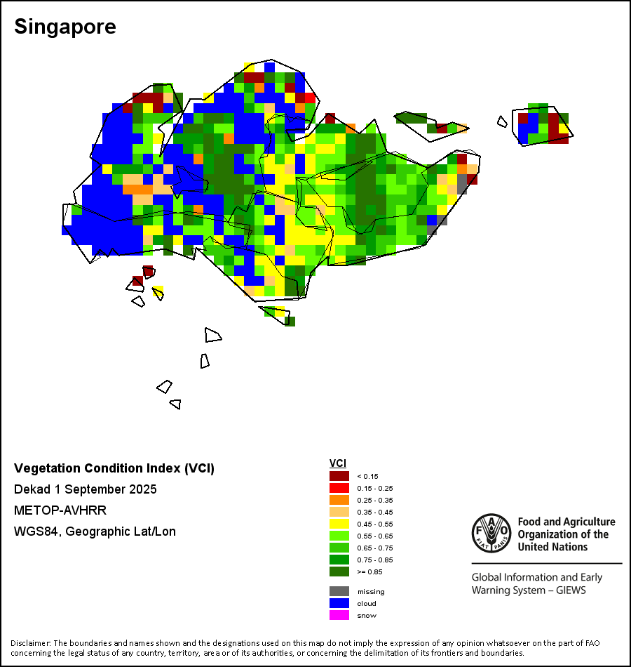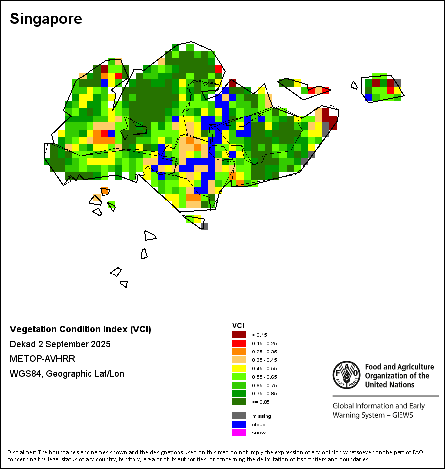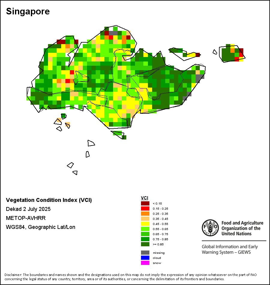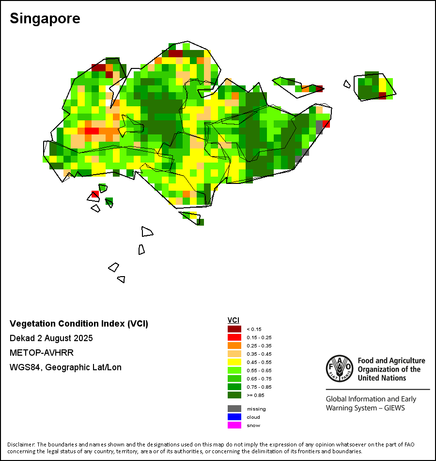 The Vegetation Condition Index (VCI) evaluates the current vegetation health in comparison to the historical trends. The VCI relates current dekadal Normalized Difference Vegetation Index (NDVI) to its long-term minimum and maximum, normalized by the historical range of NDVI values for the same dekad. The VCI was designed to separate the weather-related component of the NDVI from the ecological element.