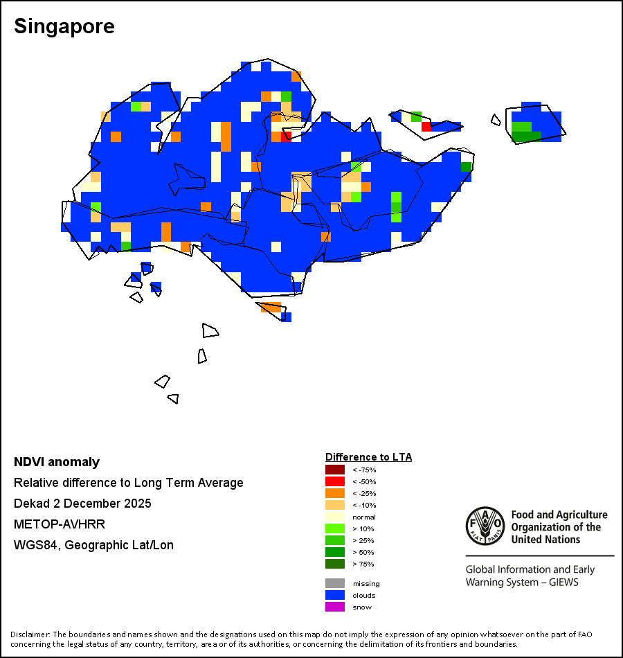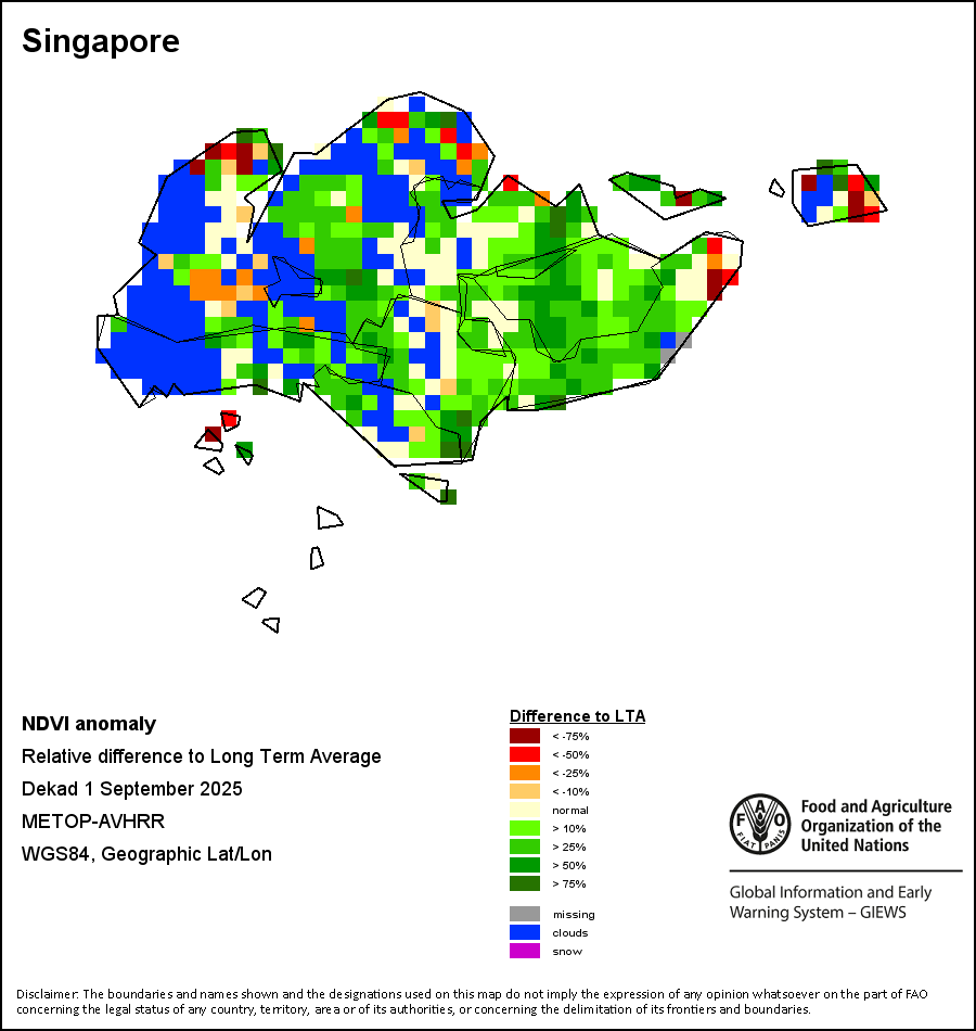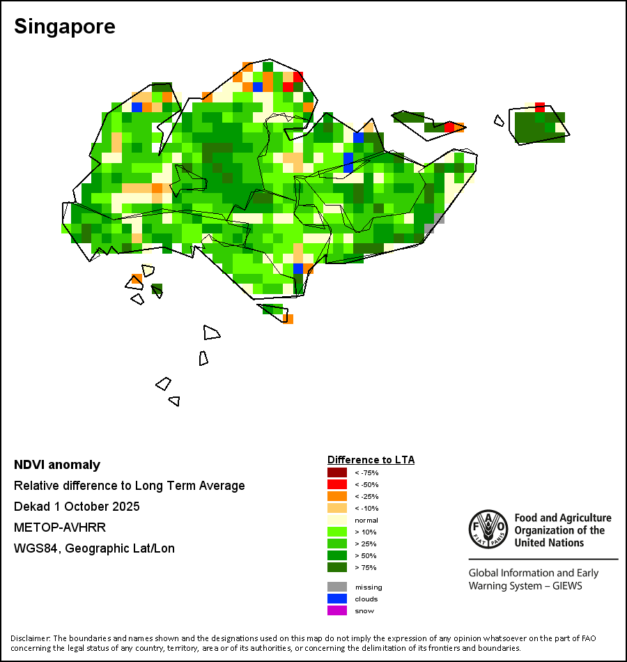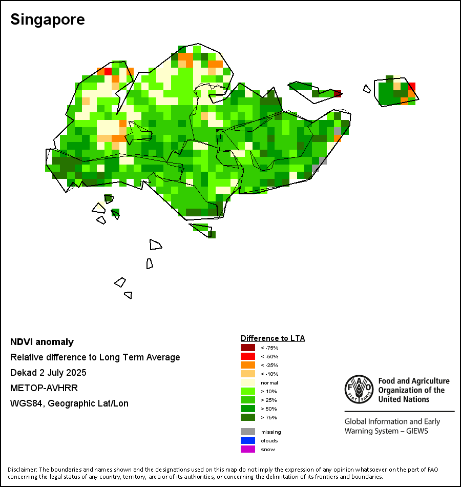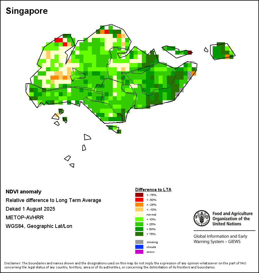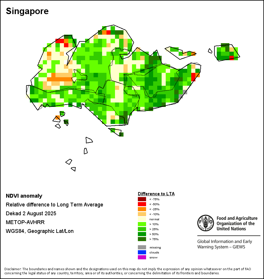 The Normalized Difference Vegetation Index (NDVI) measures the “greenness” of ground cover and is used as a proxy to indicate the density and health of vegetation. NDVI values range from +1 to -1, with high positive values corresponding to dense and healthy vegetation, and low and/or negative NDVI values indicating poor vegetation conditions or sparse vegetative cover. The NDVI anomaly indicates the variation of the current dekad to the long-term average, where a positive value (for example 20 percent) would signify enhanced vegetation conditions compared to the average, while a negative value (for instance -40 percent) would indicate comparatively poor vegetation conditions.