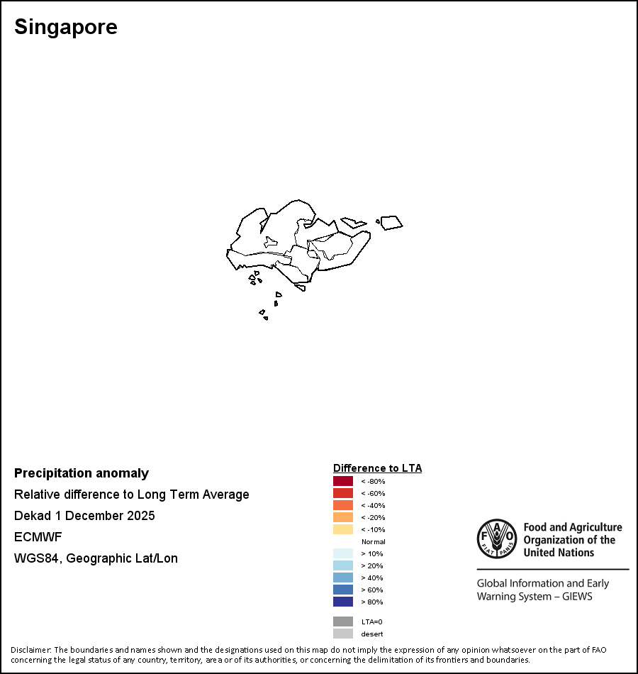 The map illustrates the difference between the current rainfall volume and the average level. Rainfall levels are compared with the Long-Term Average (LTA), which refers to the period 1989-2015. Warmer colours identify areas which have received lower-than-average rainfall, while colder colours are given to areas where precipitation has been above average.