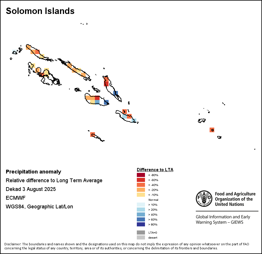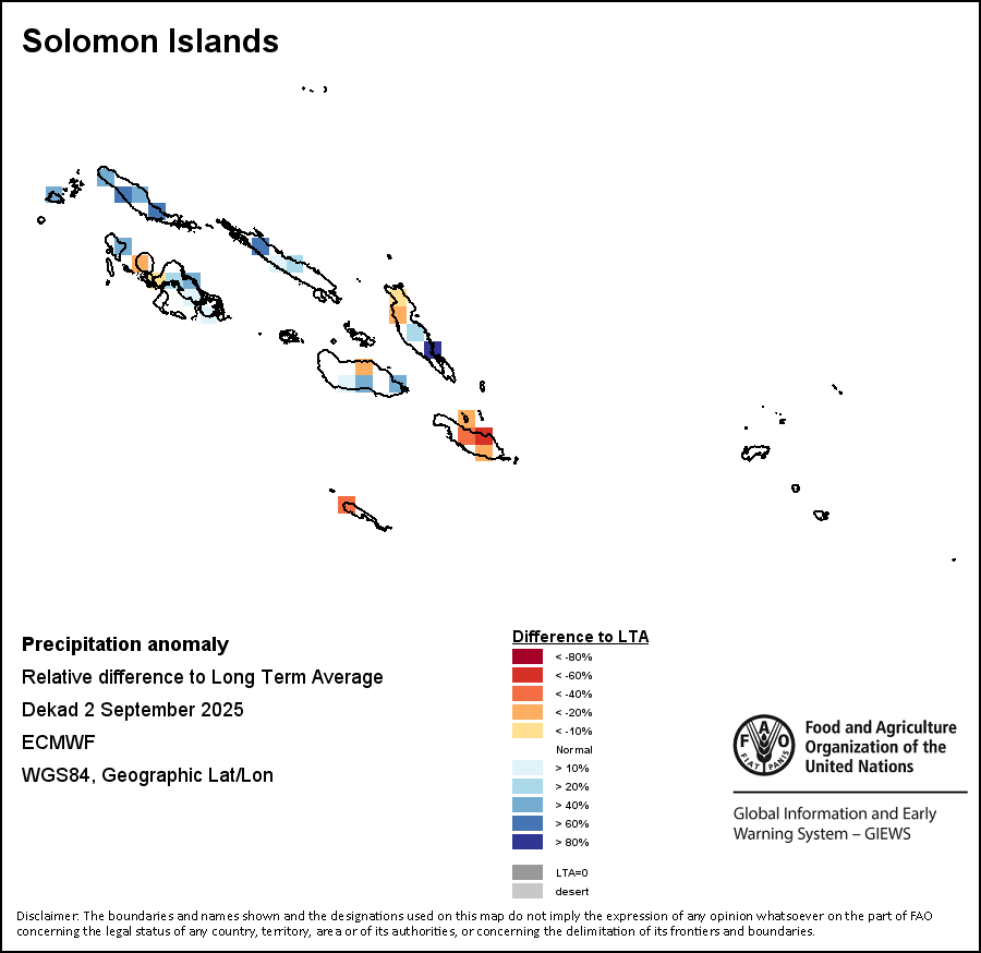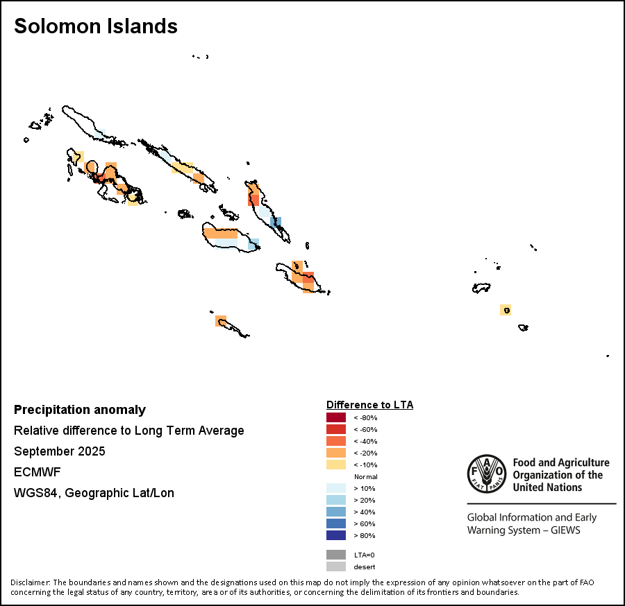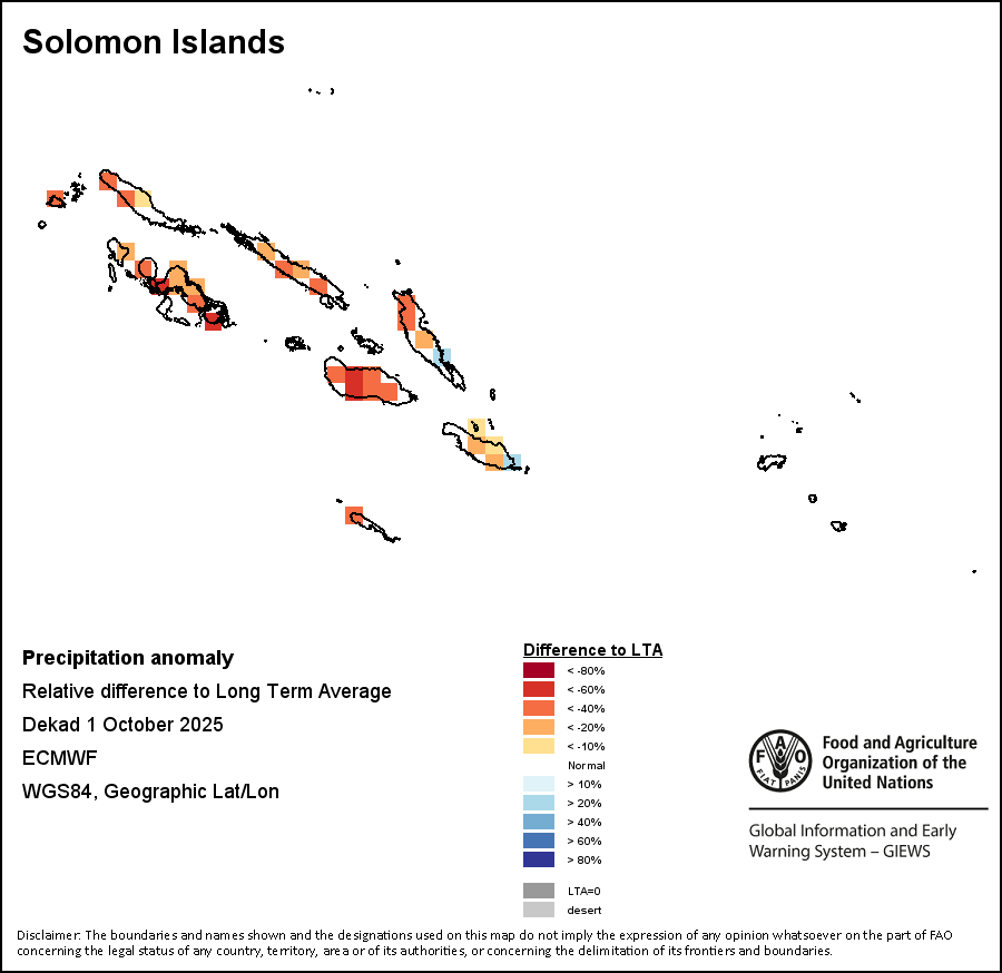 توضح الخريطة الاختلاف بين كمية الهطولات المطرية الراهنة ومعدلها. تقارَن مستويات الهطولات المطرية مع المعدل طويل الأجل الذي يشير إلى الفترة ما بين 1989-2015.