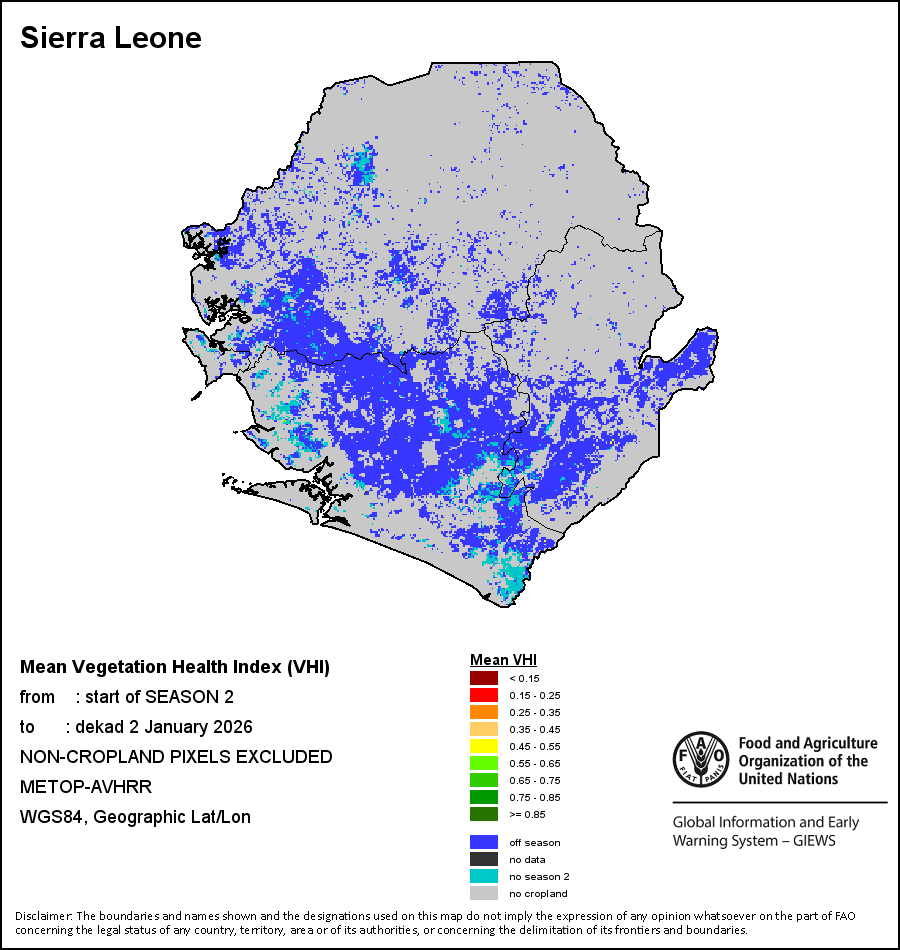 L'indicateur de santé de la végétation (VHI – Vegetation Health Index) illustre la gravité des sécheresses en se fondant sur l'état de la végétation et l'influence des températures sur les conditions des plantes. Le VHI est un indice composite et l'indicateur primaire utilisé pour calculer l’ASI. Les composantes du VHI (VCI et TCI) reçoivent la même pondération dans le calcul de l'indice. Il combine à la fois le VCI et l'Indice des conditions de température (TCI – Temperature Condition Index). Le TCI est calculé à l’aide d’une équation similaire au VCI, mais rapporte les températures actuelles à leur maximum et minimum à long terme, en supposant qu’une élévation des températures tend à provoquer une détérioration des conditions de la végétation. Une diminution du VHI indique, par exemple, un état de la végétation relativement mauvais et une augmentation des températures, ce qui signifie que les conditions de végétation sont soumises à un stress, voire une sécheresse sur une période longue. Les données du VHI sont calculées pour les deux principales campagnes et sous trois formes: décadaires, mensuelles et annuelles.