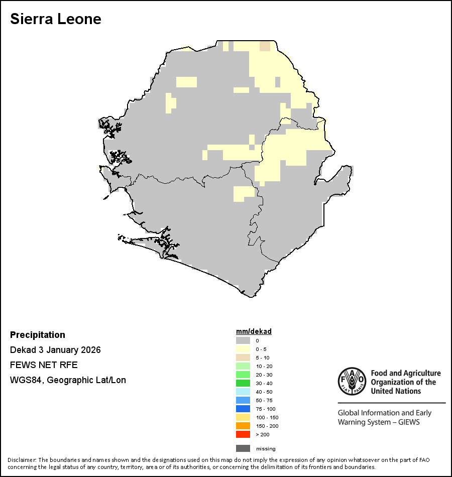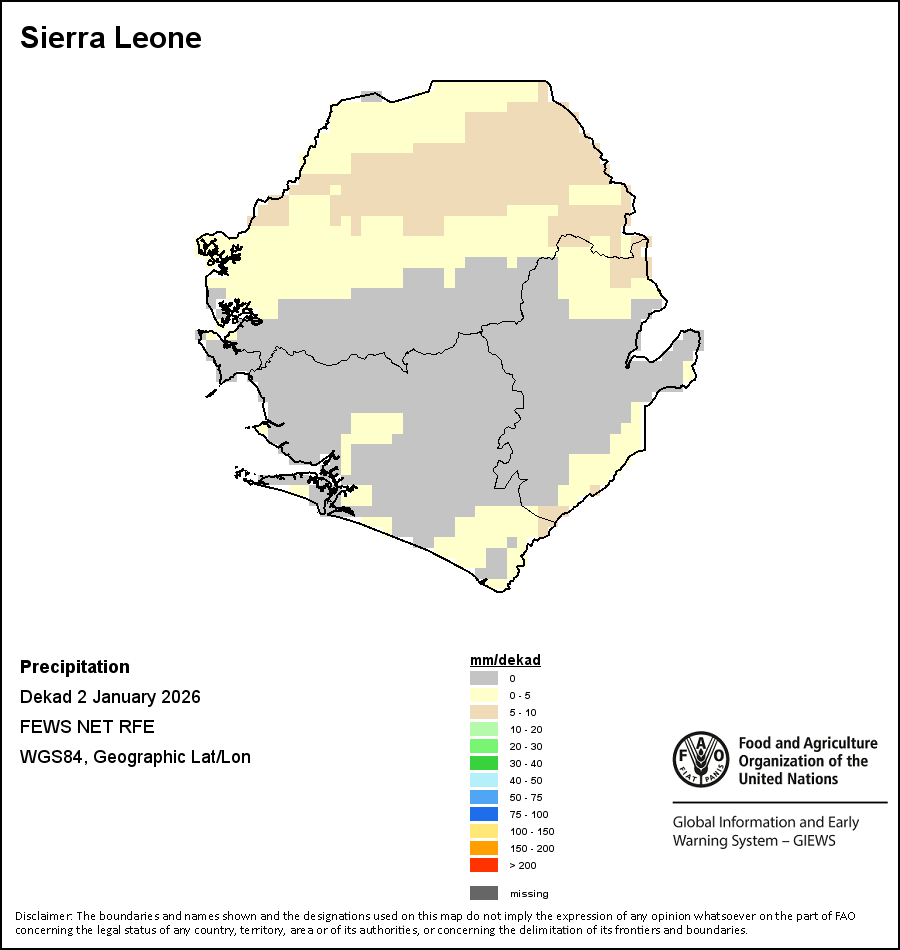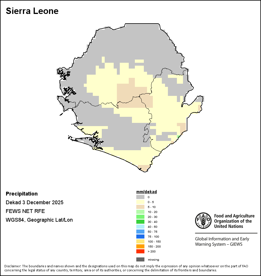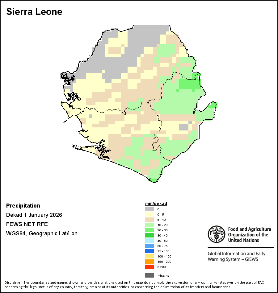 La carte illustre les volumes cumulés de précipitations au cours d’une décade (une période de 10 jours). Les estimations concernant les précipitations pour tous les pays africains (à l'exception du Cap Vert et de Maurice) proviennent du NOAA/FEWSNet, tandis que les données concernant les autres pays sont obtenues à partir du CEPMMT.