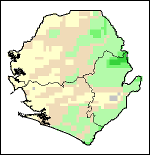 L'indice de végétation par différence normalisé (NDVI – Normalized Difference Vegetation Index) mesure la "verdeur" de la couverture du sol, et est utilisé comme indicateur de la densité et de l’état de la végétation. Les valeurs du NDVI varient de +1 à -1, plus les valeurs positives sont élevées plus la végétation est dense et en bonne santé, tandis que des valeurs faibles et/ou négatives du NDVI indiquent une végétation en mauvaises conditions ou une couverture végétale clairsemée. L’écart NDVI indique la variation de la décade actuelle par rapport à la moyenne à long terme. Une valeur positive (par exemple 20 pour cent) indique une amélioration des conditions de végétation par rapport à la moyenne, tandis qu'une valeur négative (par exemple -40 pour cent) signale des conditions de végétation relativement mauvaises.
