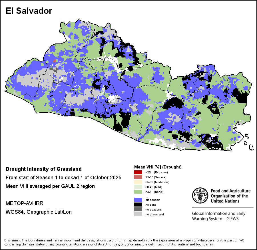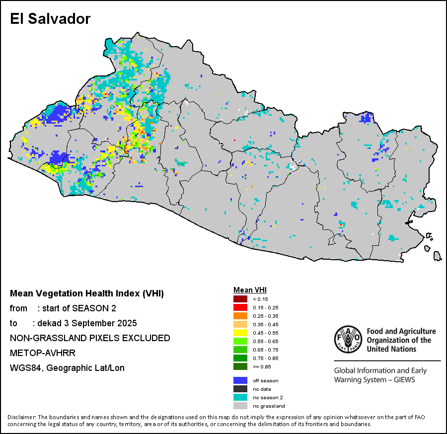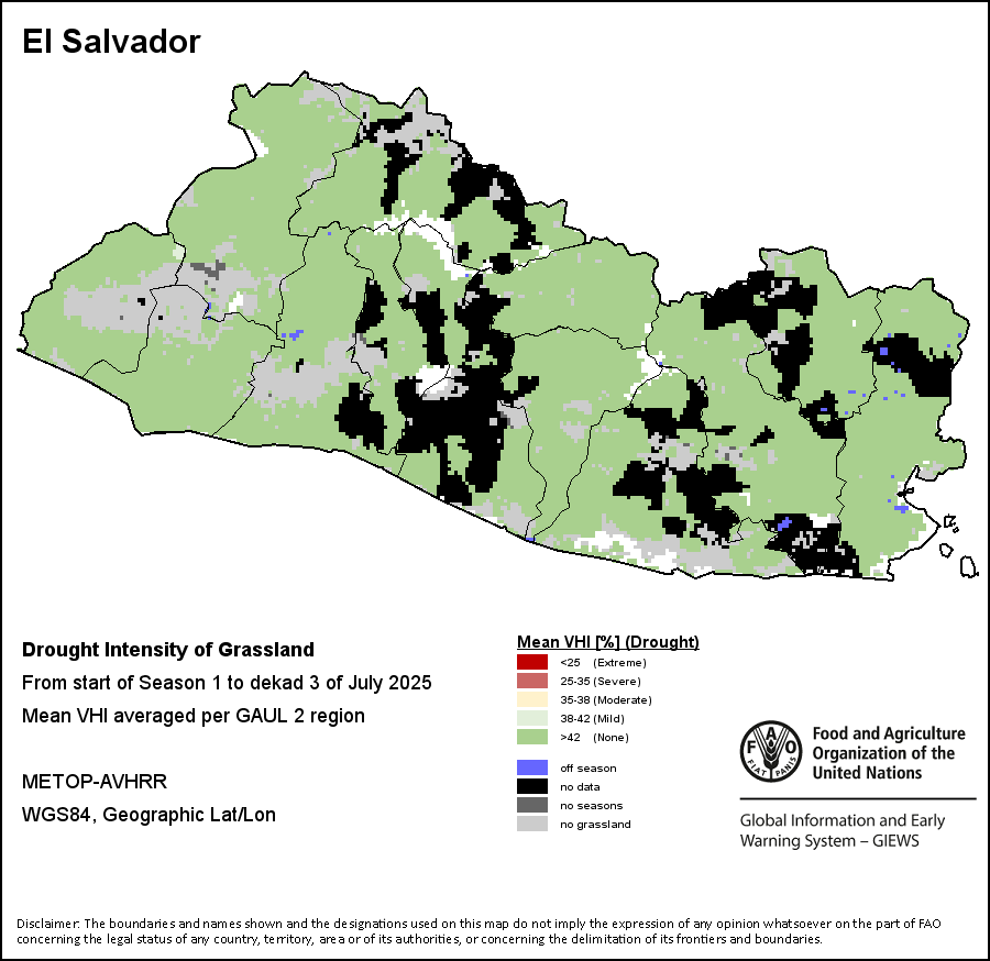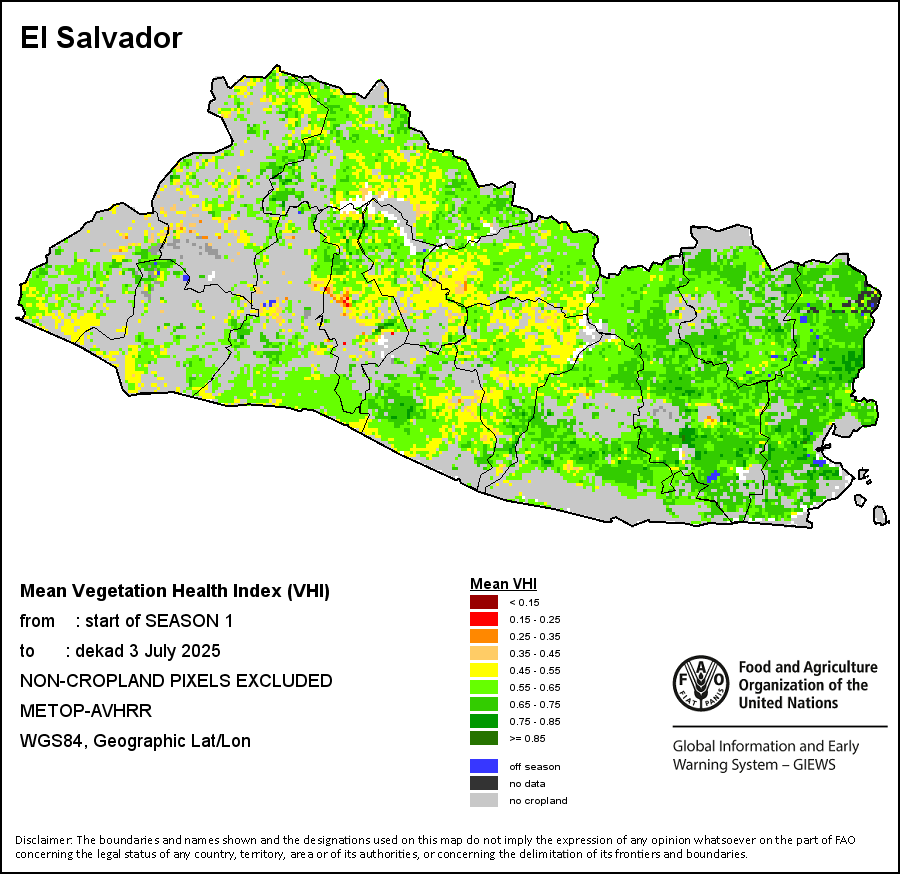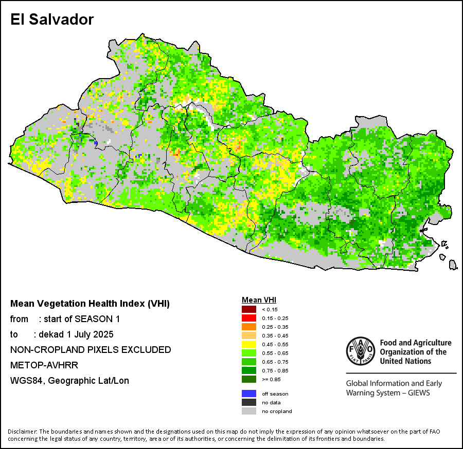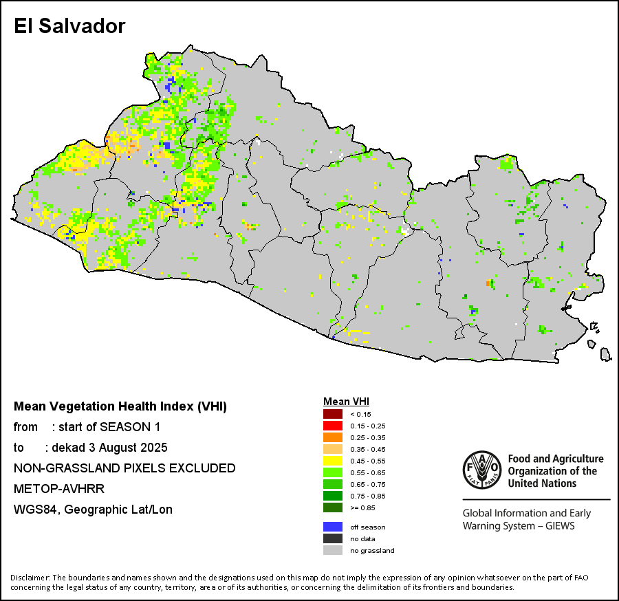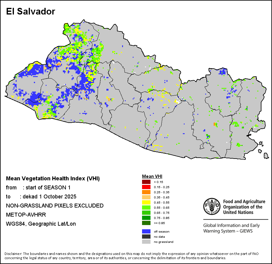 The country level maps and graphs depict the latest 36-month period of the seasonal, vegetation and precipitation indicators. The data is presented by dekad and month.   More