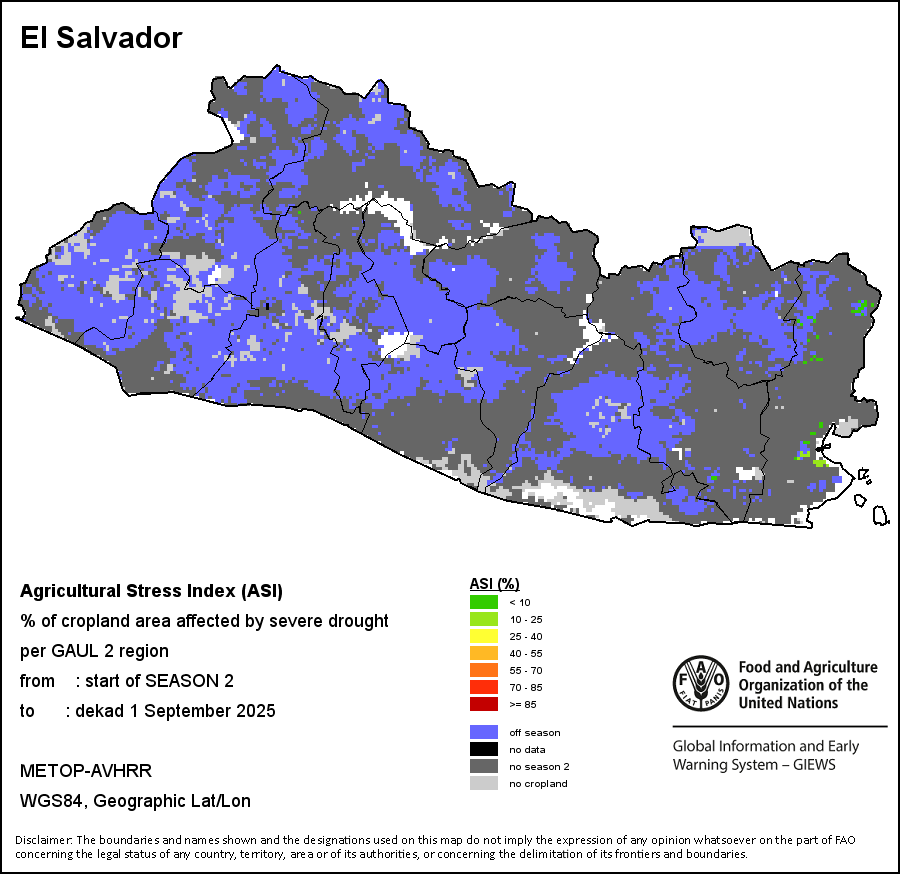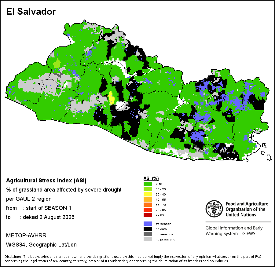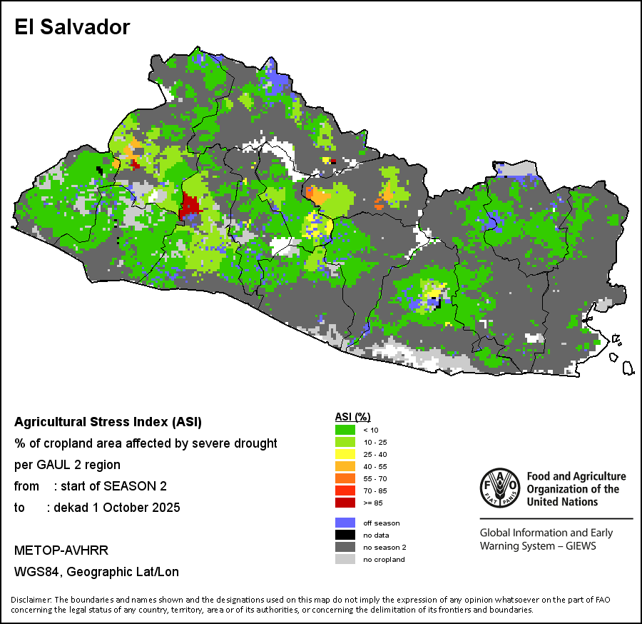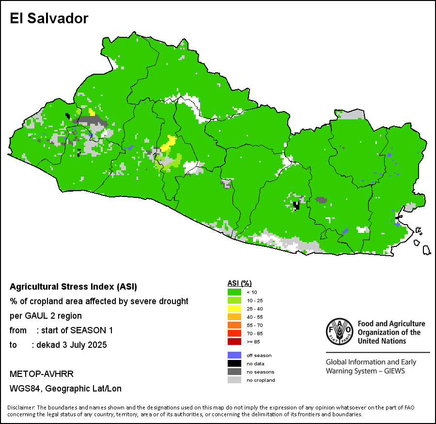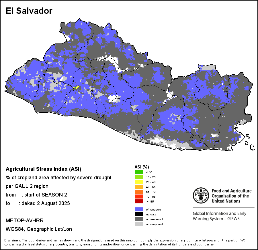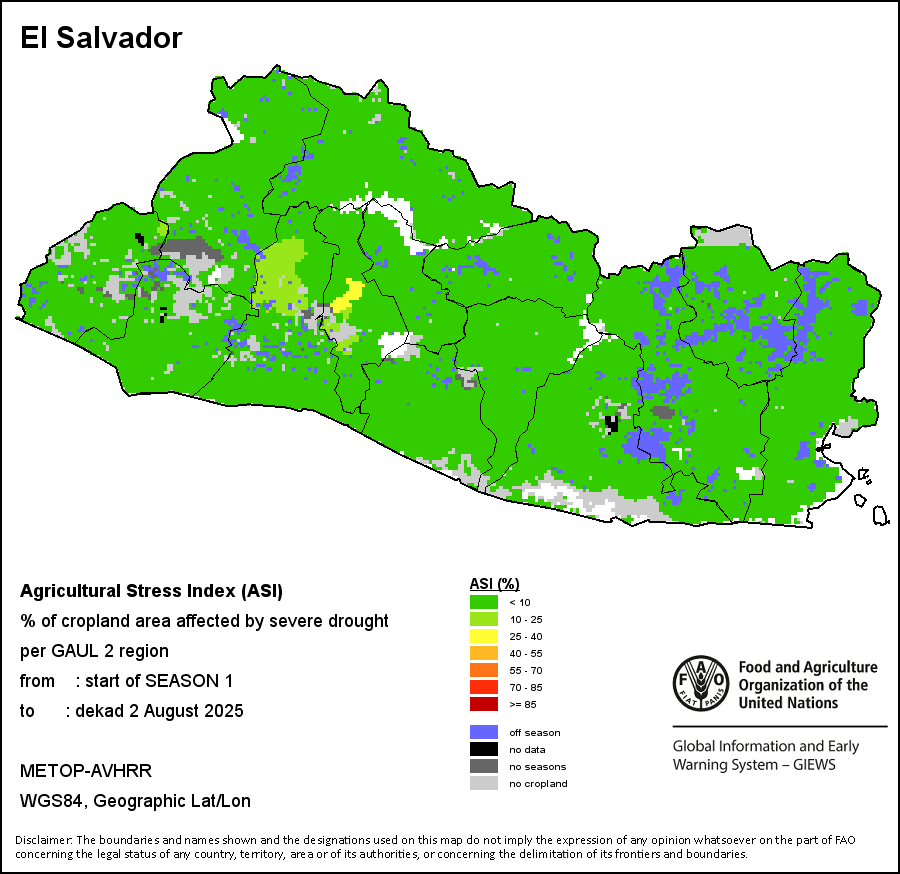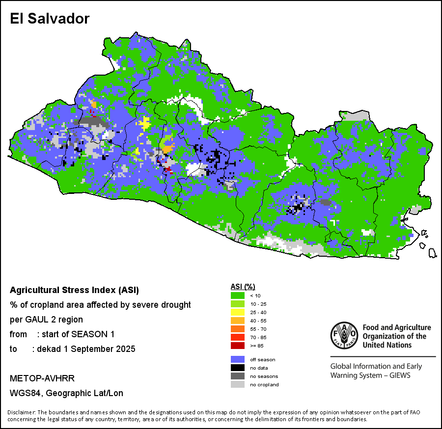 The Agricultural Stress Index (ASI) is a quick-look indicator that facilitates the early identification of cropped land with a high likelihood of water stress (drought). The Index is based on the integration of the Vegetation Health Index (VHI) in two dimensions that are critical in the assessment of a drought event in agriculture: temporal and spatial. The first step of the ASI calculation is a temporal averaging of the VHI, assessing the intensity and duration of dry periods occurring during the crop cycle at the pixel level; this calculation includes the use of crop coefficients, which introduces sensitivity of a crop to water stress during each phenological phase. The second step determines the spatial extent of drought events by calculating the percentage of pixels in arable areas with a VHI value below 35 percent (this value was identified as a critical threshold in assessing the extent of drought in previous research by Kogan, 1995). Each administrative area is classified according to the percentage of the affected area to facilitate the quick interpretation of results.