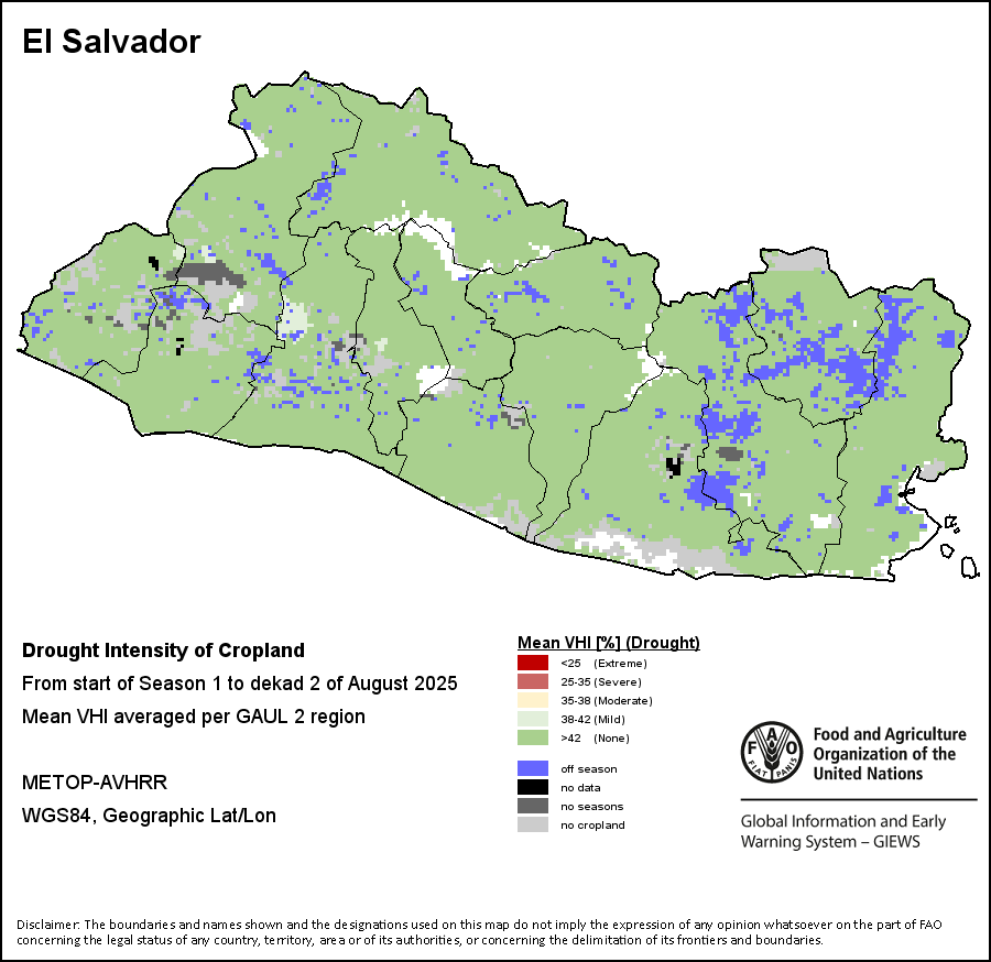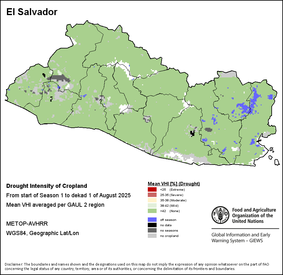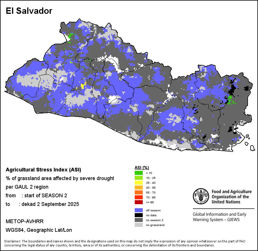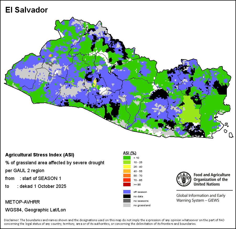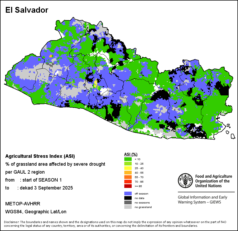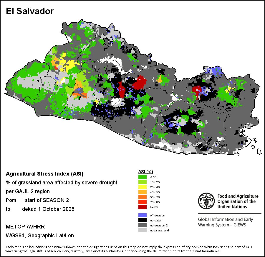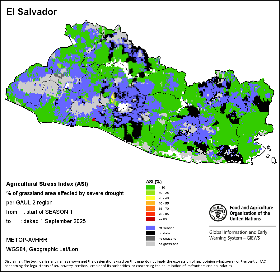 The Agricultural Stress Index (ASI) is a quick-look indicator that facilitates the early identification of cropped land with a high likelihood of water stress (drought). The Index is based on the integration of the Vegetation Health Index (VHI) in two dimensions that are critical in the assessment of a drought event in agriculture: temporal and spatial. The first step of the ASI calculation is a temporal averaging of the VHI, assessing the intensity and duration of dry periods occurring during the crop cycle at the pixel level; this calculation includes the use of crop coefficients, which introduces sensitivity of a crop to water stress during each phenological phase. The second step determines the spatial extent of drought events by calculating the percentage of pixels in arable areas with a VHI value below 35 percent (this value was identified as a critical threshold in assessing the extent of drought in previous research by Kogan, 1995). Each administrative area is classified according to the percentage of the affected area to facilitate the quick interpretation of results.