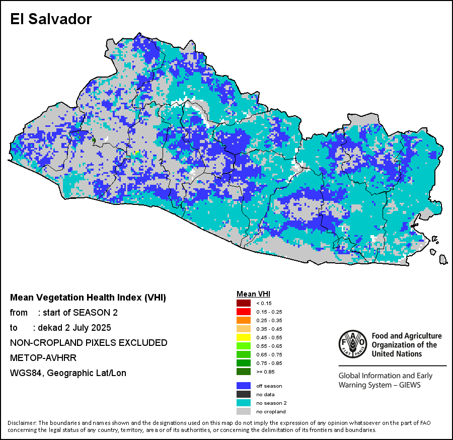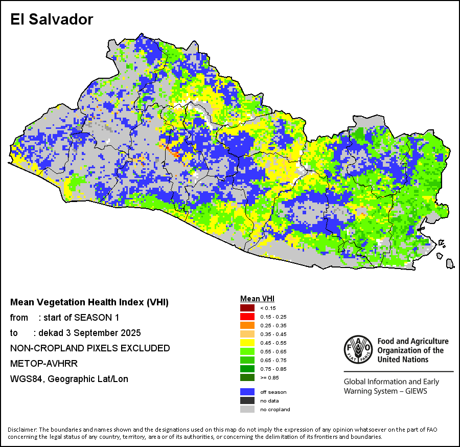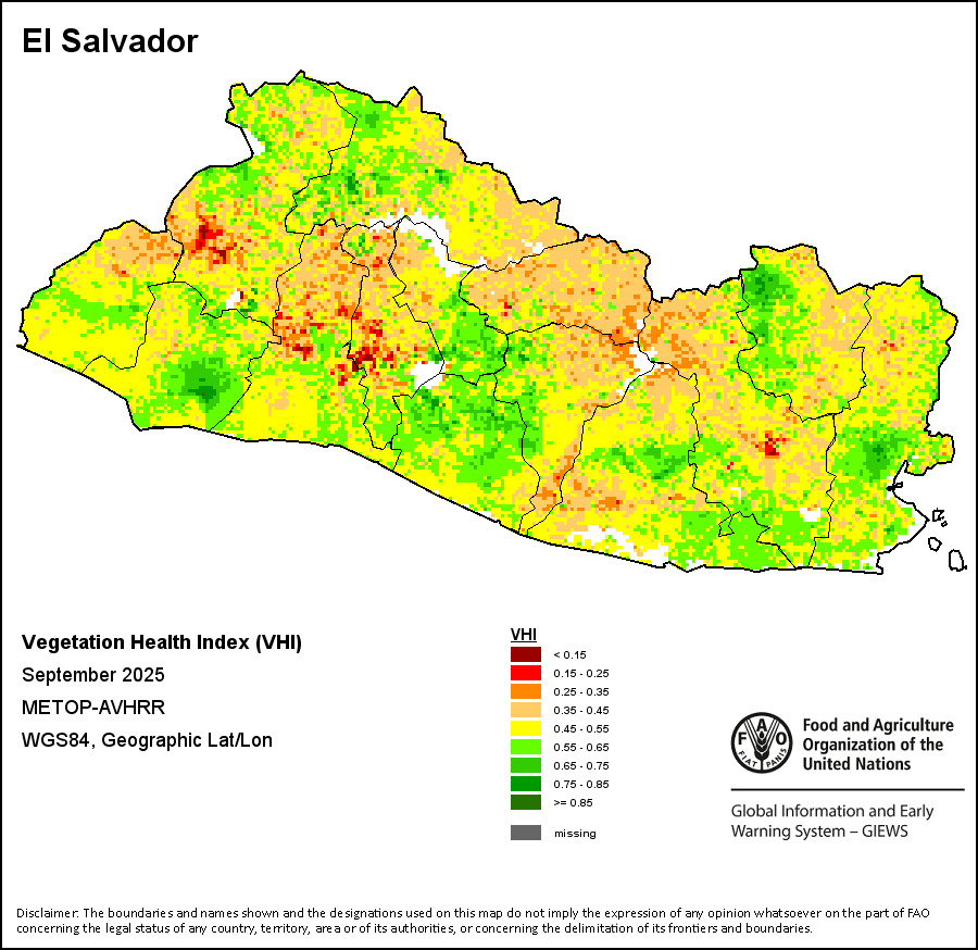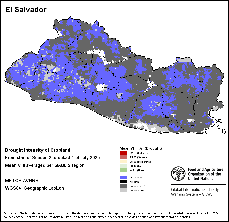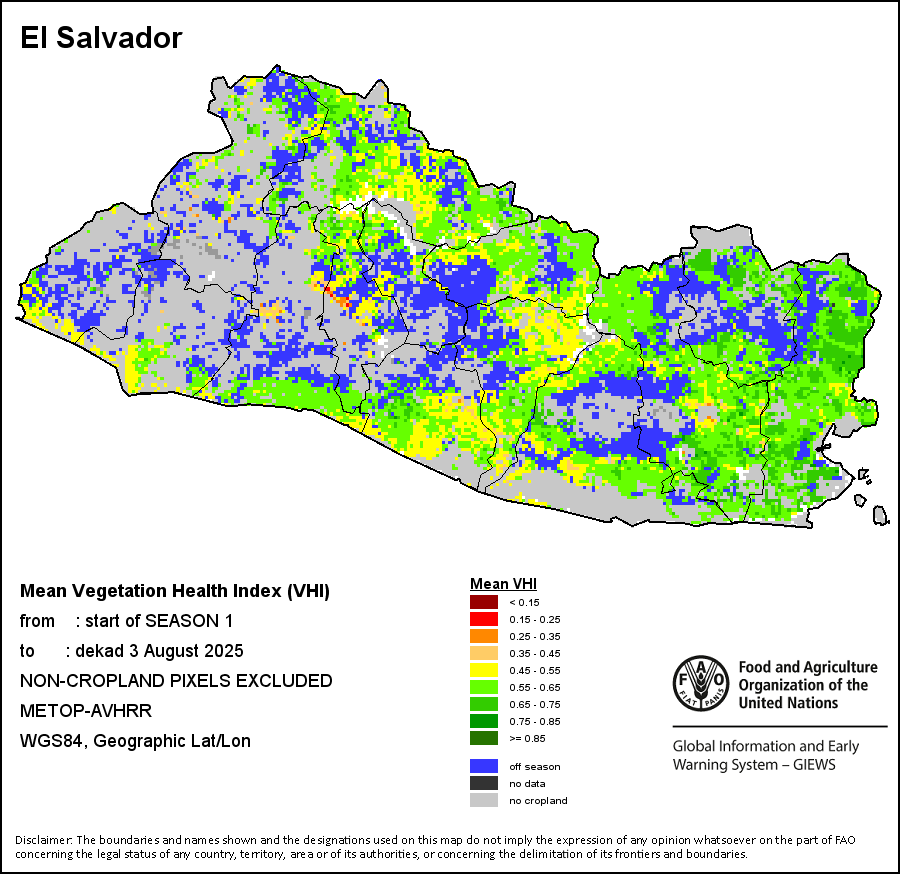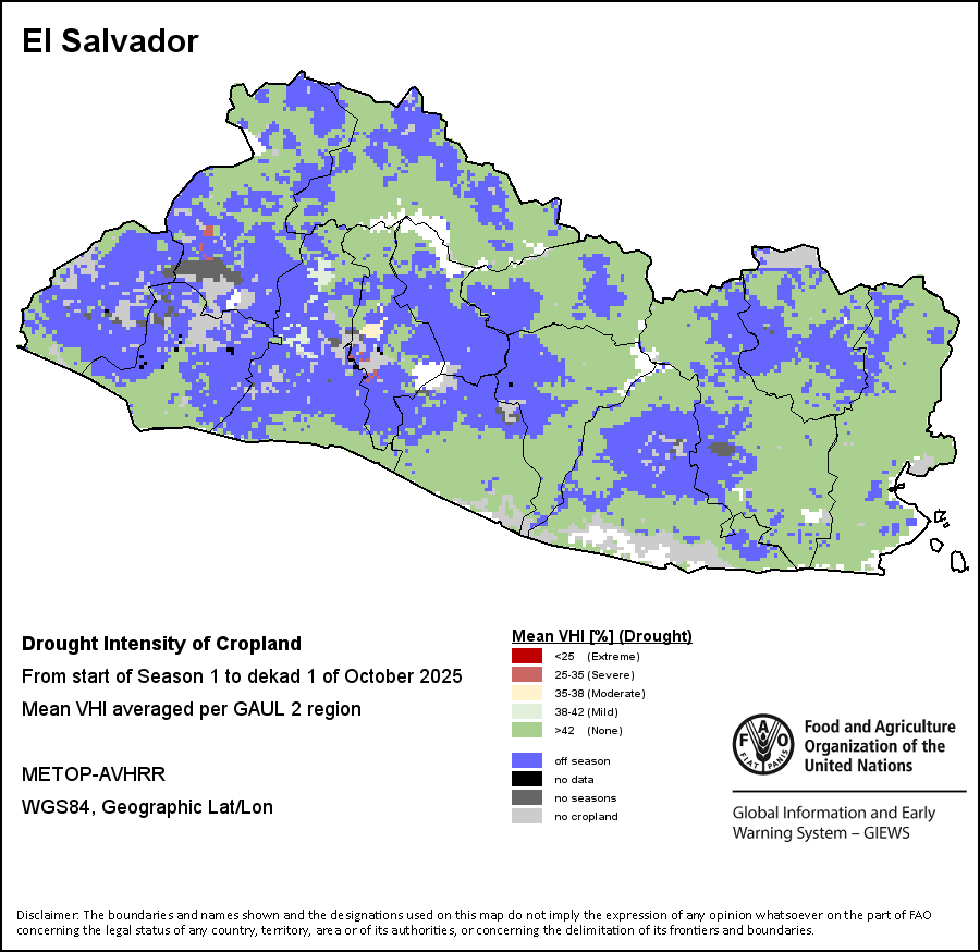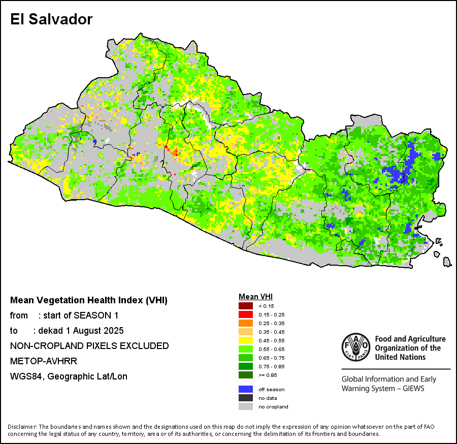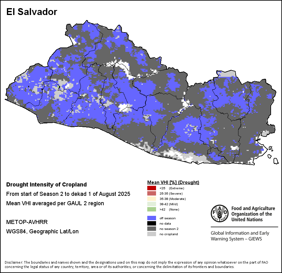 The Agricultural Stress Index (ASI) is a quick-look indicator that facilitates the early identification of cropped land with a high likelihood of water stress (drought). The Index is based on the integration of the Vegetation Health Index (VHI) in two dimensions that are critical in the assessment of a drought event in agriculture: temporal and spatial. The first step of the ASI calculation is a temporal averaging of the VHI, assessing the intensity and duration of dry periods occurring during the crop cycle at the pixel level; this calculation includes the use of crop coefficients, which introduces sensitivity of a crop to water stress during each phenological phase. The second step determines the spatial extent of drought events by calculating the percentage of pixels in arable areas with a VHI value below 35 percent (this value was identified as a critical threshold in assessing the extent of drought in previous research by Kogan, 1995). Each administrative area is classified according to the percentage of the affected area to facilitate the quick interpretation of results.