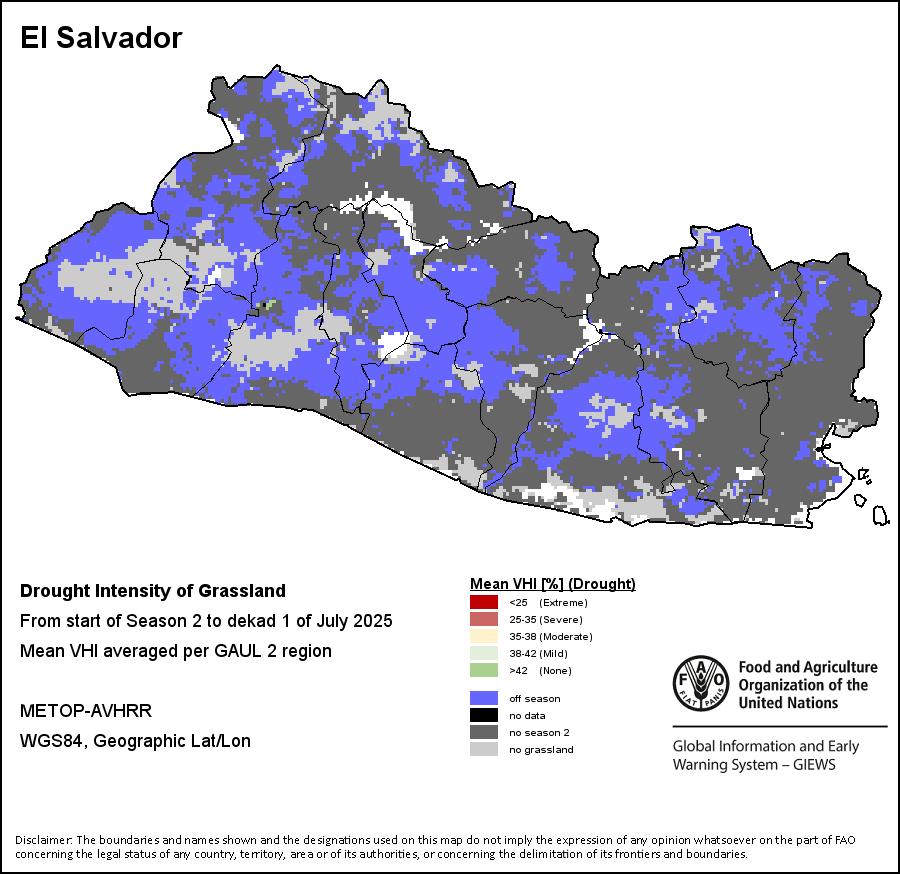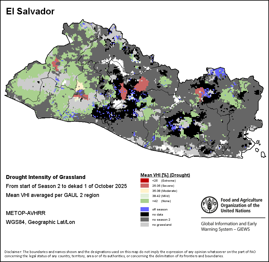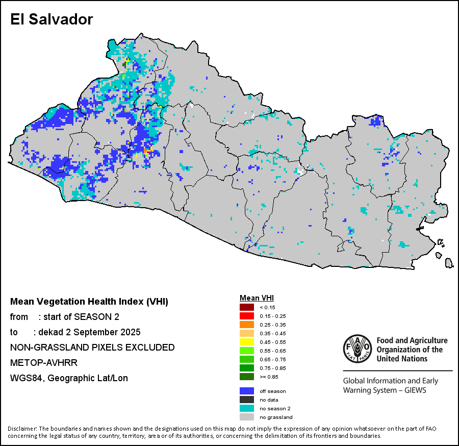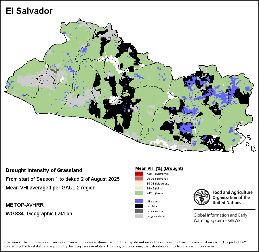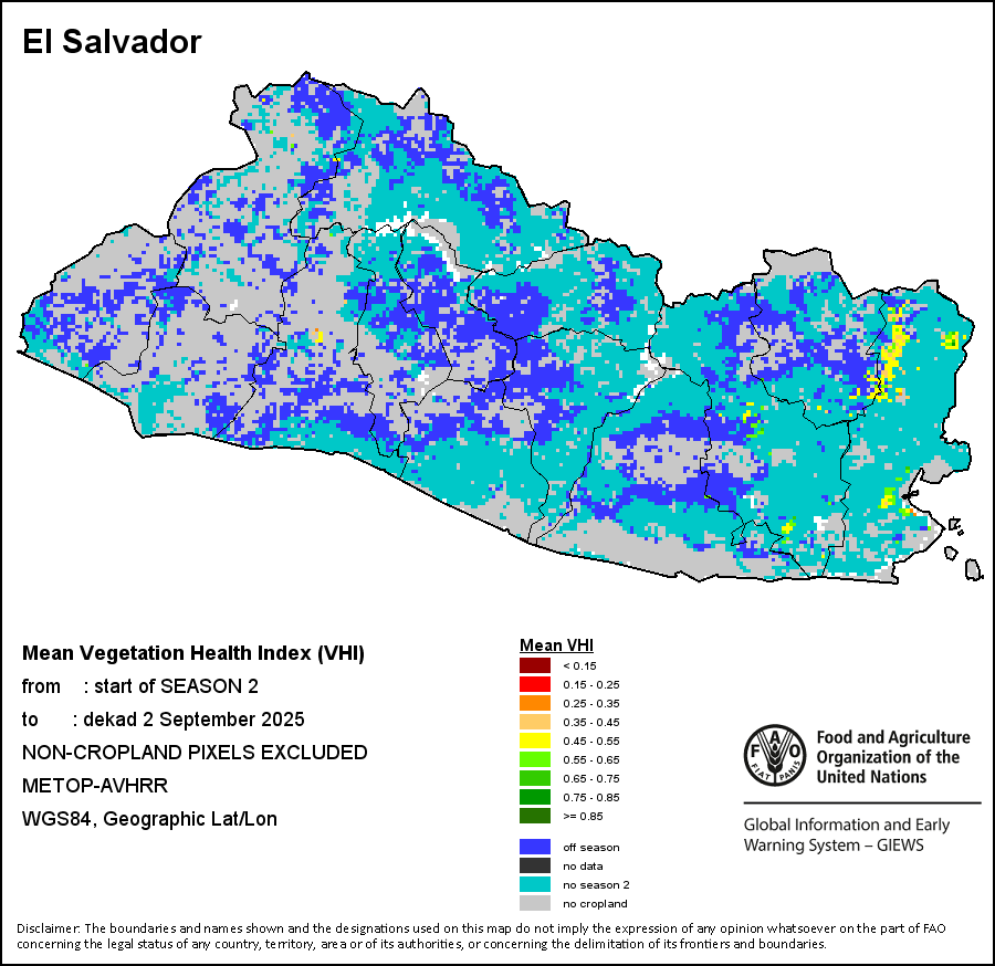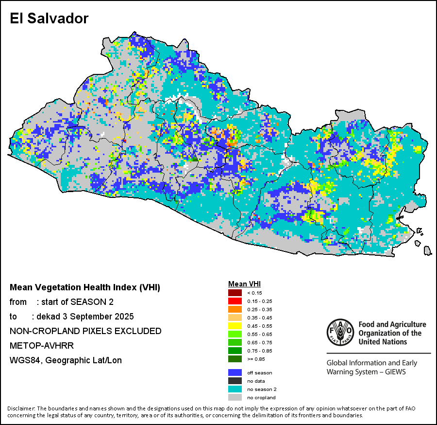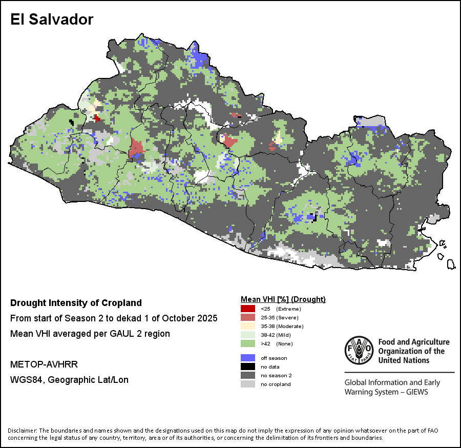 The Agricultural Stress Index (ASI) is a quick-look indicator that facilitates the early identification of cropped land with a high likelihood of water stress (drought). The Index is based on the integration of the Vegetation Health Index (VHI) in two dimensions that are critical in the assessment of a drought event in agriculture: temporal and spatial. The first step of the ASI calculation is a temporal averaging of the VHI, assessing the intensity and duration of dry periods occurring during the crop cycle at the pixel level; this calculation includes the use of crop coefficients, which introduces sensitivity of a crop to water stress during each phenological phase. The second step determines the spatial extent of drought events by calculating the percentage of pixels in arable areas with a VHI value below 35 percent (this value was identified as a critical threshold in assessing the extent of drought in previous research by Kogan, 1995). Each administrative area is classified according to the percentage of the affected area to facilitate the quick interpretation of results.