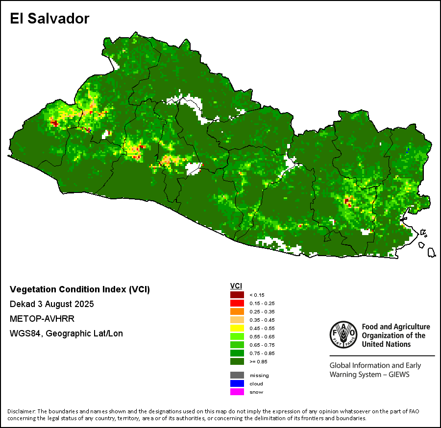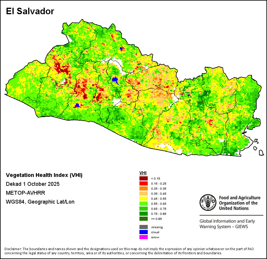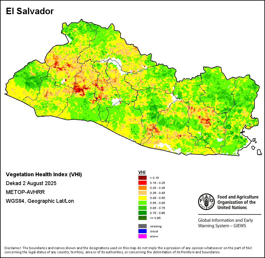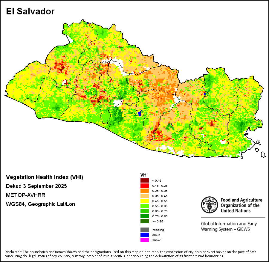 The Vegetation Health Index (VHI) illustrates the severity of drought based on the vegetation health and the influence of temperature on plant conditions. The VHI is a composite index and the elementary indicator used to compute the ASI. It combines both the Vegetation Condition Index (VCI) and the Temperature Condition Index (TCI). The TCI is calculated using a similar equation to the VCI, but relates the current temperature to the long-term maximum and minimum , as it is assumed that higher temperatures tend to cause a deterioration in vegetation conditions. A decrease in the VHI would, for example, indicate relatively poor vegetation conditions and warmer temperatures, signifying stressed vegetation conditions, and over a longer period would be indicative of drought. The VHI images are computed for the two main seasons and in three modalities: dekadal, monthly and annual.