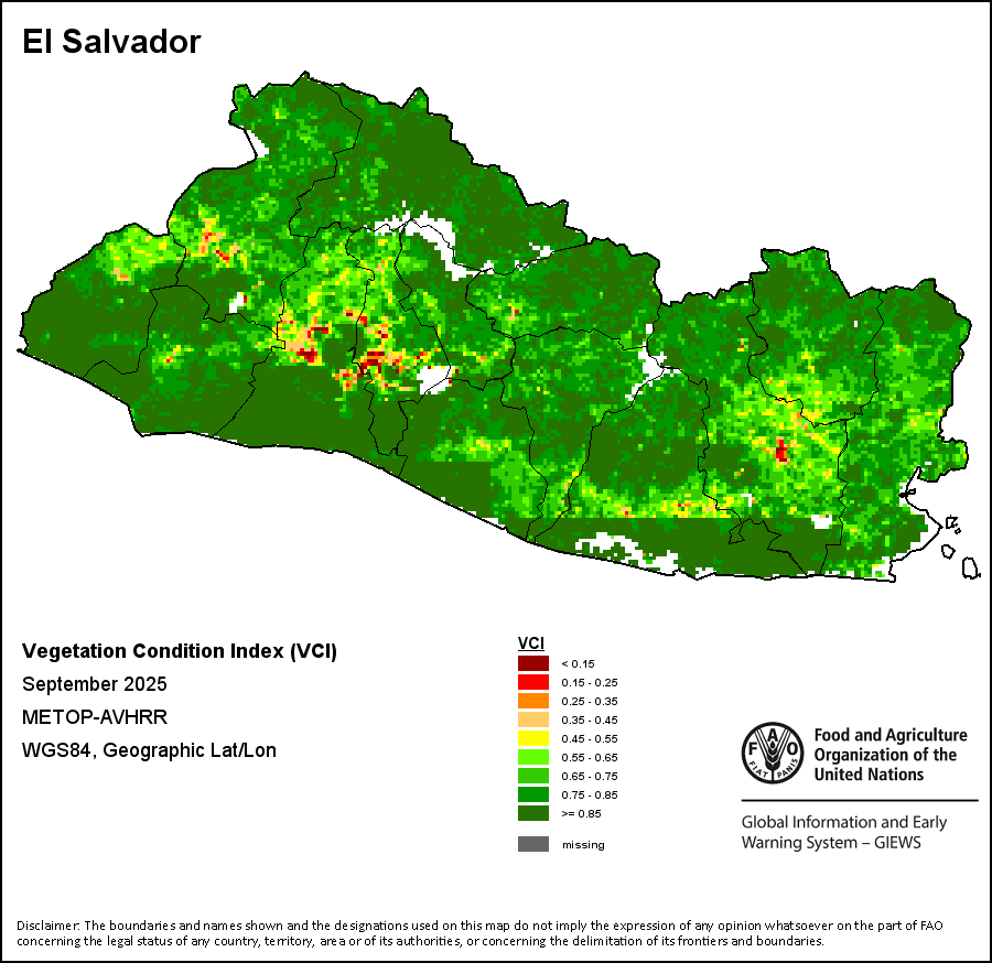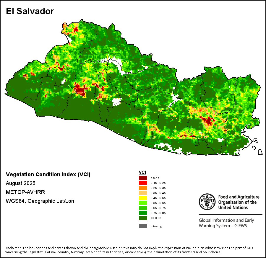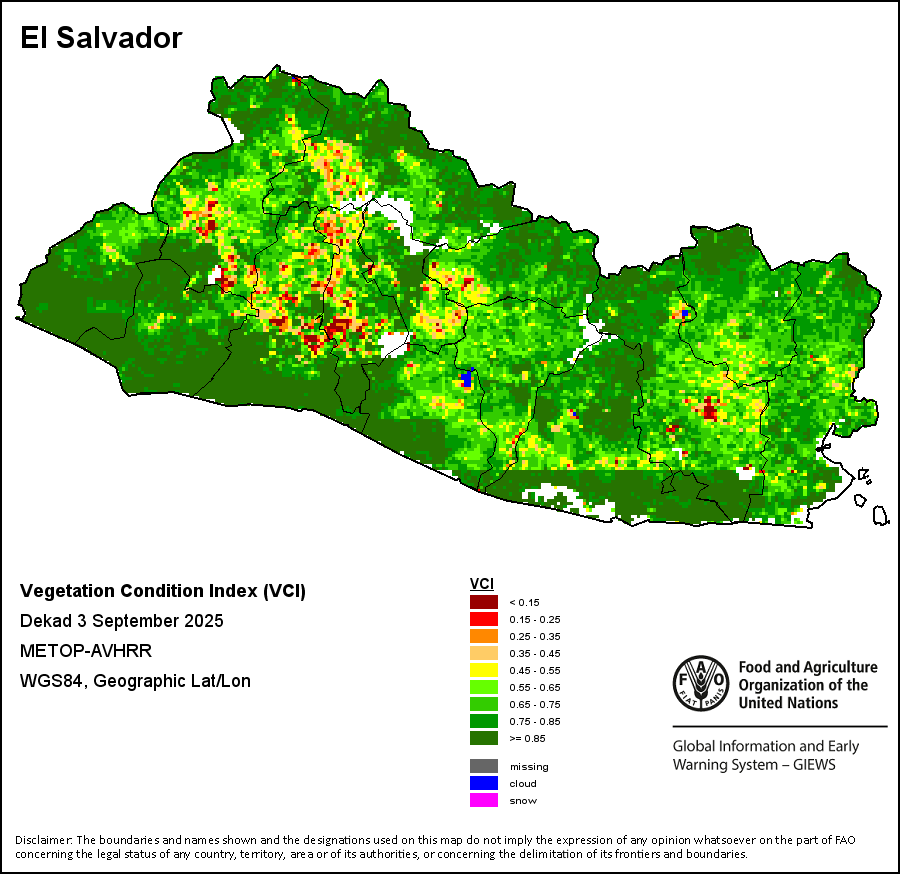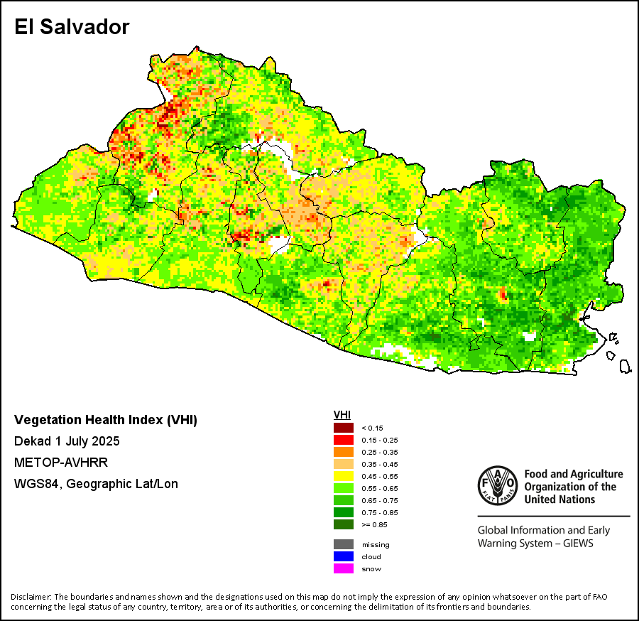 The Vegetation Health Index (VHI) illustrates the severity of drought based on the vegetation health and the influence of temperature on plant conditions. The VHI is a composite index and the elementary indicator used to compute the ASI. It combines both the Vegetation Condition Index (VCI) and the Temperature Condition Index (TCI). The TCI is calculated using a similar equation to the VCI, but relates the current temperature to the long-term maximum and minimum , as it is assumed that higher temperatures tend to cause a deterioration in vegetation conditions. A decrease in the VHI would, for example, indicate relatively poor vegetation conditions and warmer temperatures, signifying stressed vegetation conditions, and over a longer period would be indicative of drought. The VHI images are computed for the two main seasons and in three modalities: dekadal, monthly and annual.