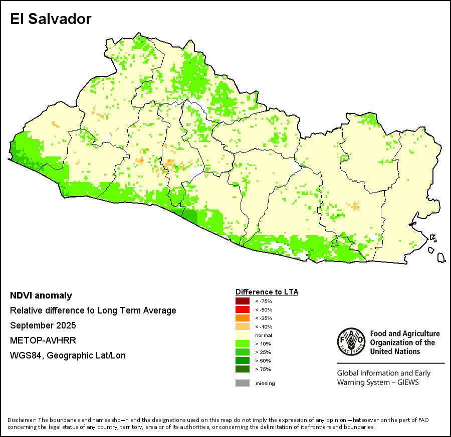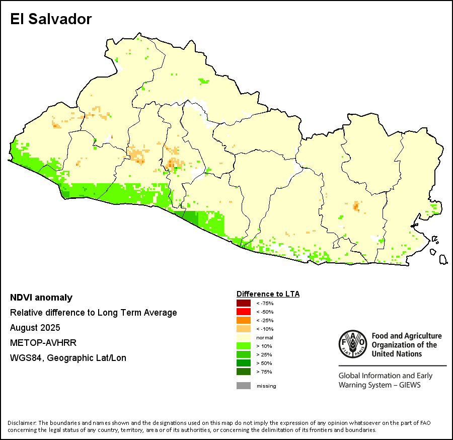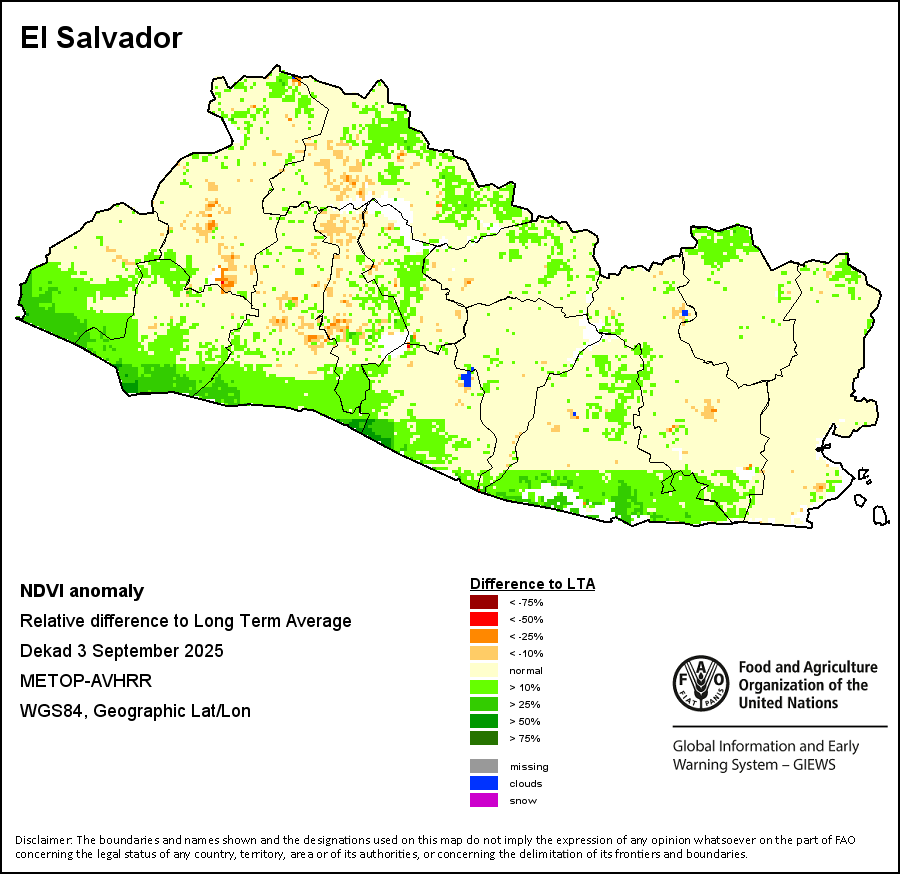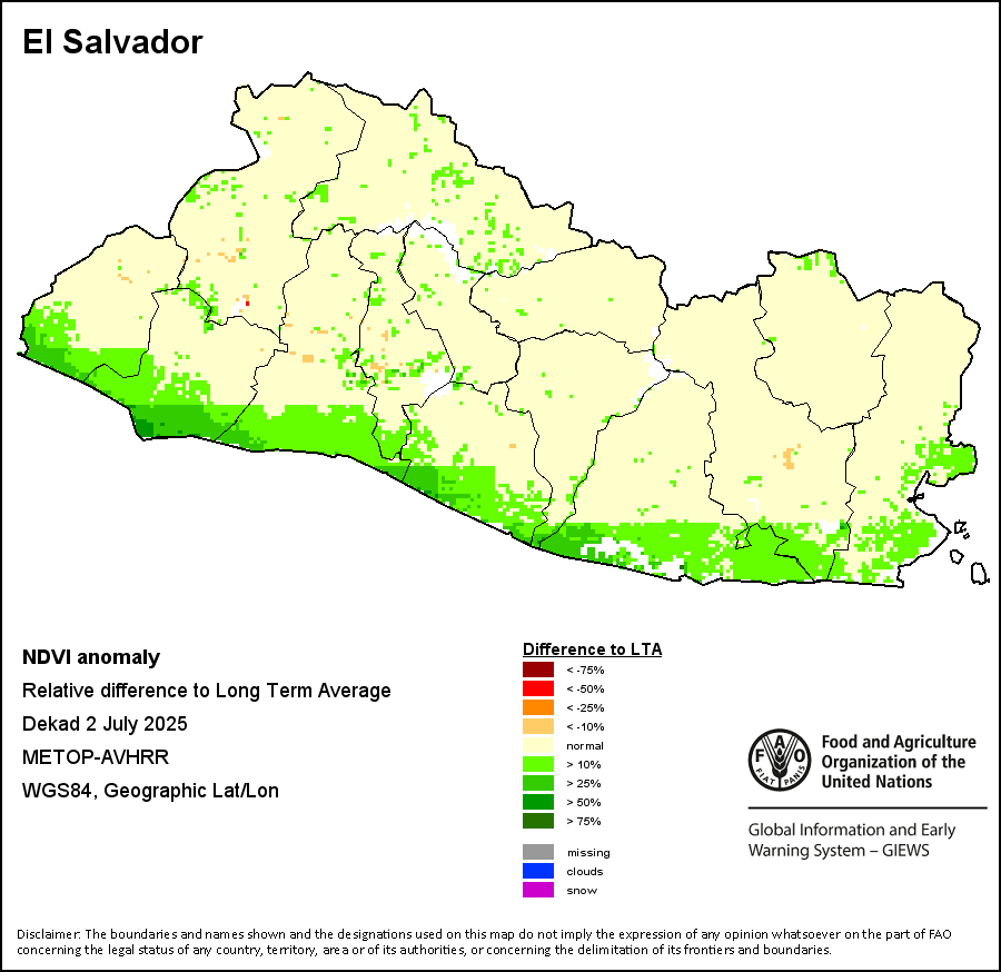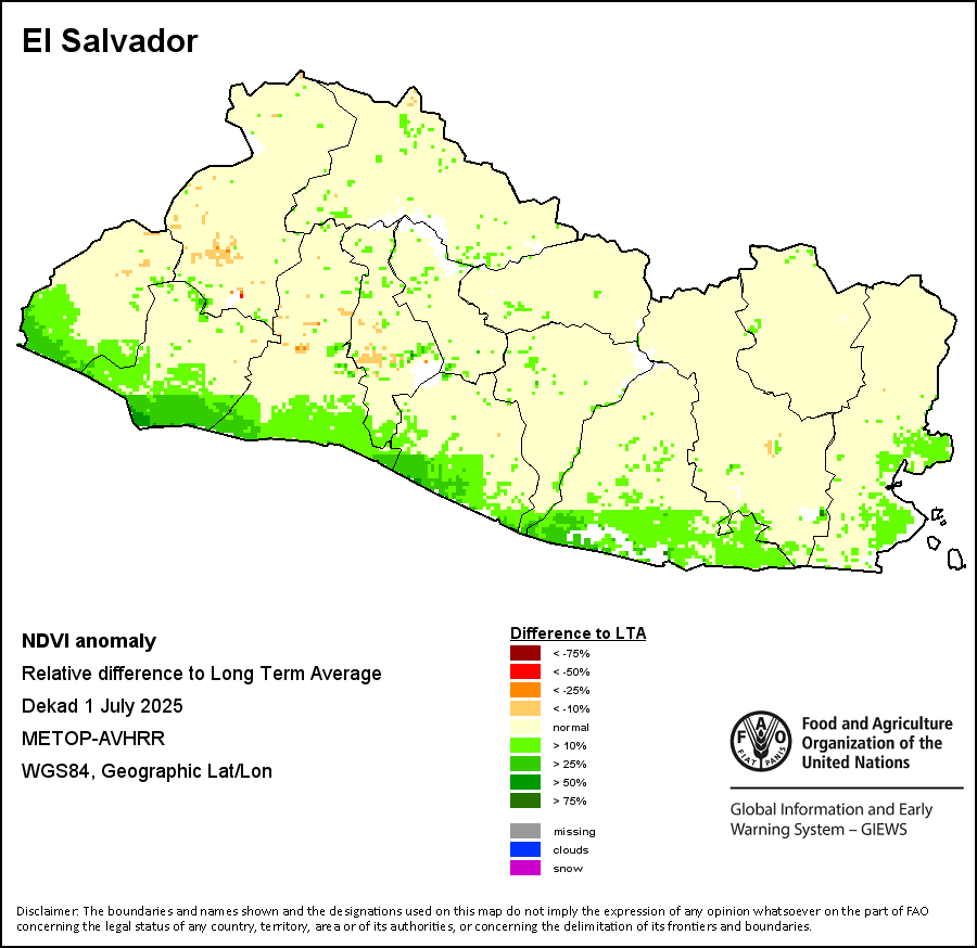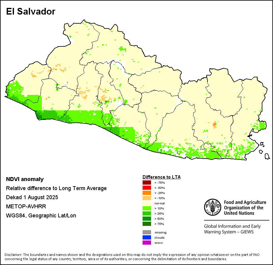 The Normalized Difference Vegetation Index (NDVI) measures the “greenness” of ground cover and is used as a proxy to indicate the density and health of vegetation. NDVI values range from +1 to -1, with high positive values corresponding to dense and healthy vegetation, and low and/or negative NDVI values indicating poor vegetation conditions or sparse vegetative cover. The NDVI anomaly indicates the variation of the current dekad to the long-term average, where a positive value (for example 20 percent) would signify enhanced vegetation conditions compared to the average, while a negative value (for instance -40 percent) would indicate comparatively poor vegetation conditions.