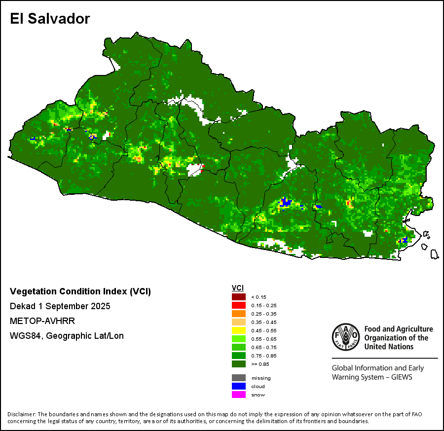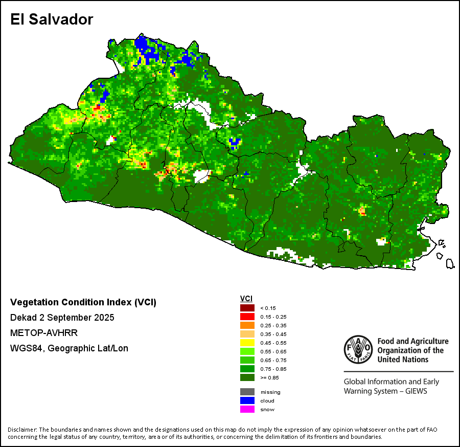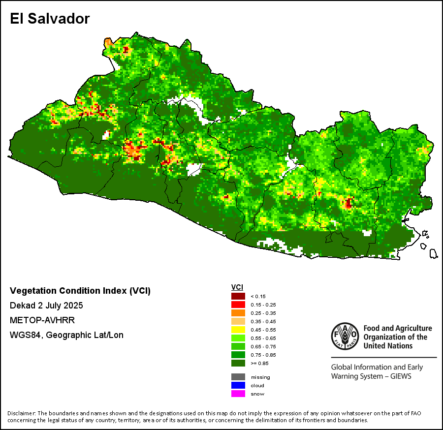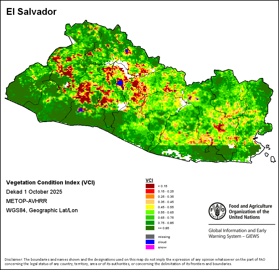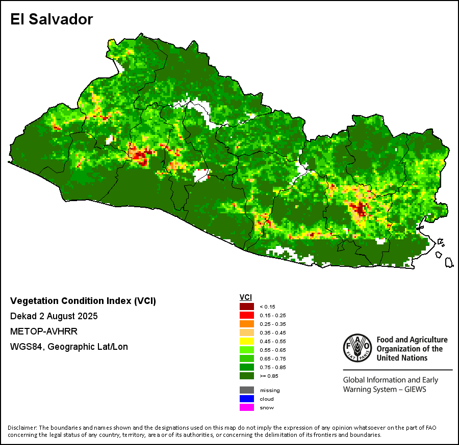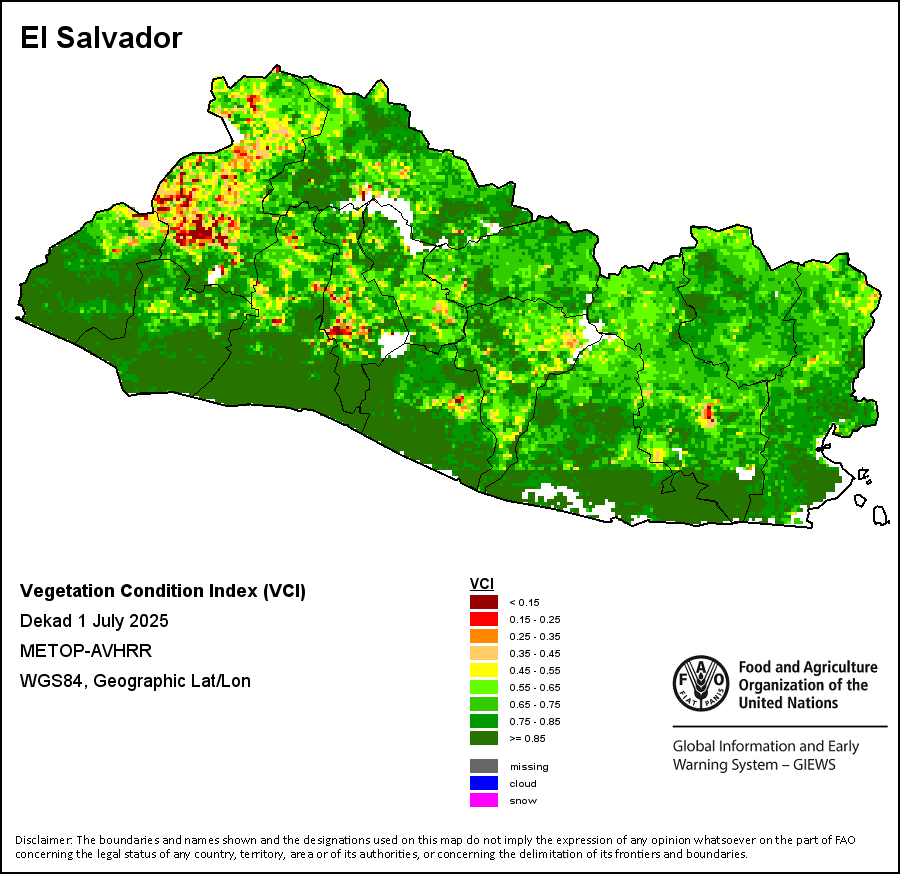 The Vegetation Condition Index (VCI) evaluates the current vegetation health in comparison to the historical trends. The VCI relates current dekadal Normalized Difference Vegetation Index (NDVI) to its long-term minimum and maximum, normalized by the historical range of NDVI values for the same dekad. The VCI was designed to separate the weather-related component of the NDVI from the ecological element.