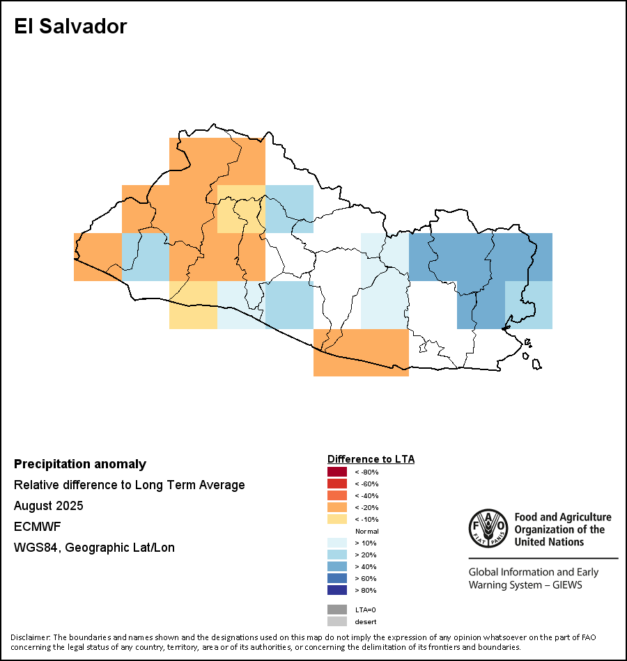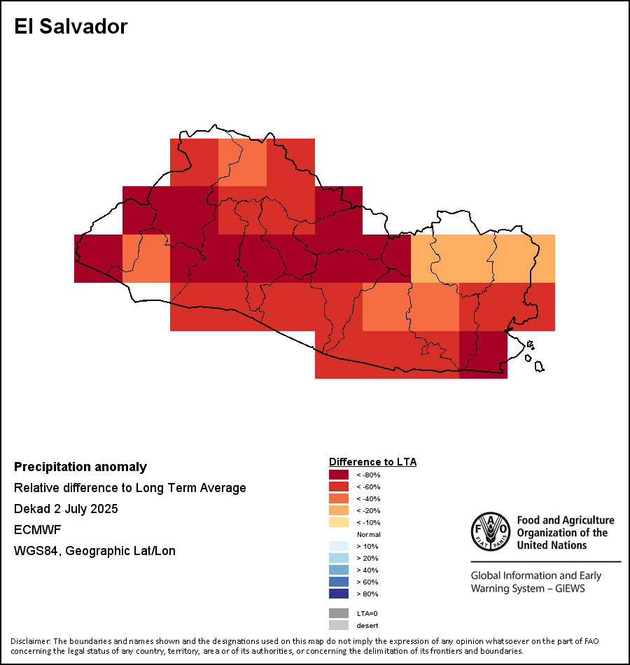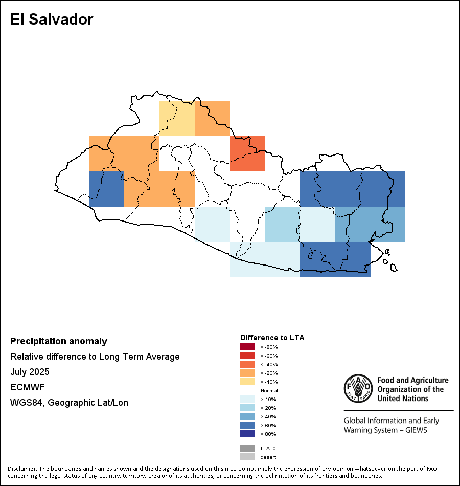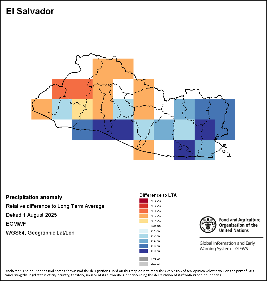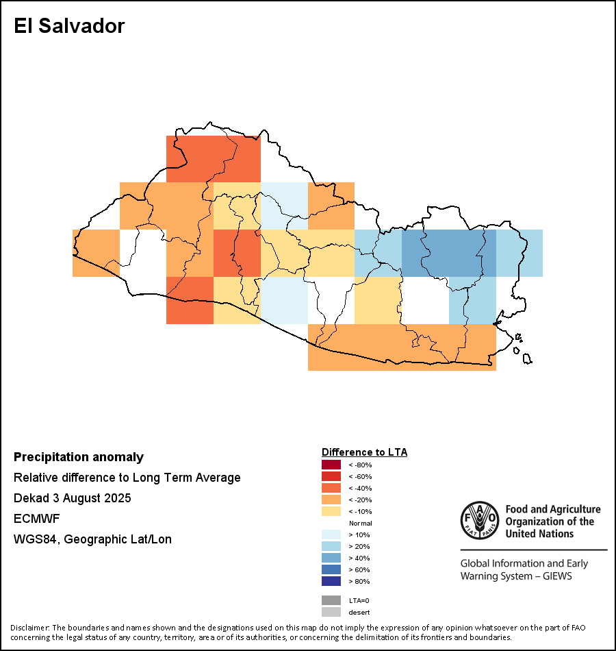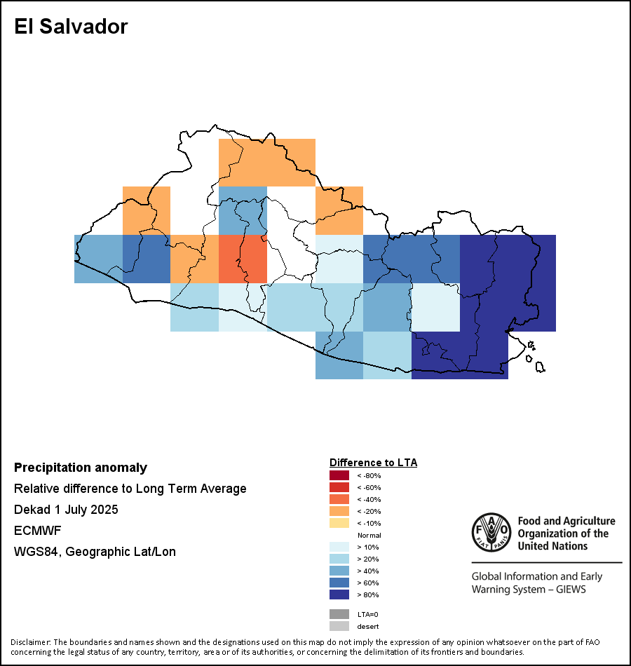 The map illustrates the difference between the current rainfall volume and the average level. Rainfall levels are compared with the Long-Term Average (LTA), which refers to the period 1989-2015. Warmer colours identify areas which have received lower-than-average rainfall, while colder colours are given to areas where precipitation has been above average.
