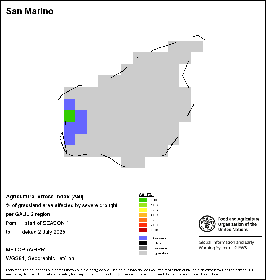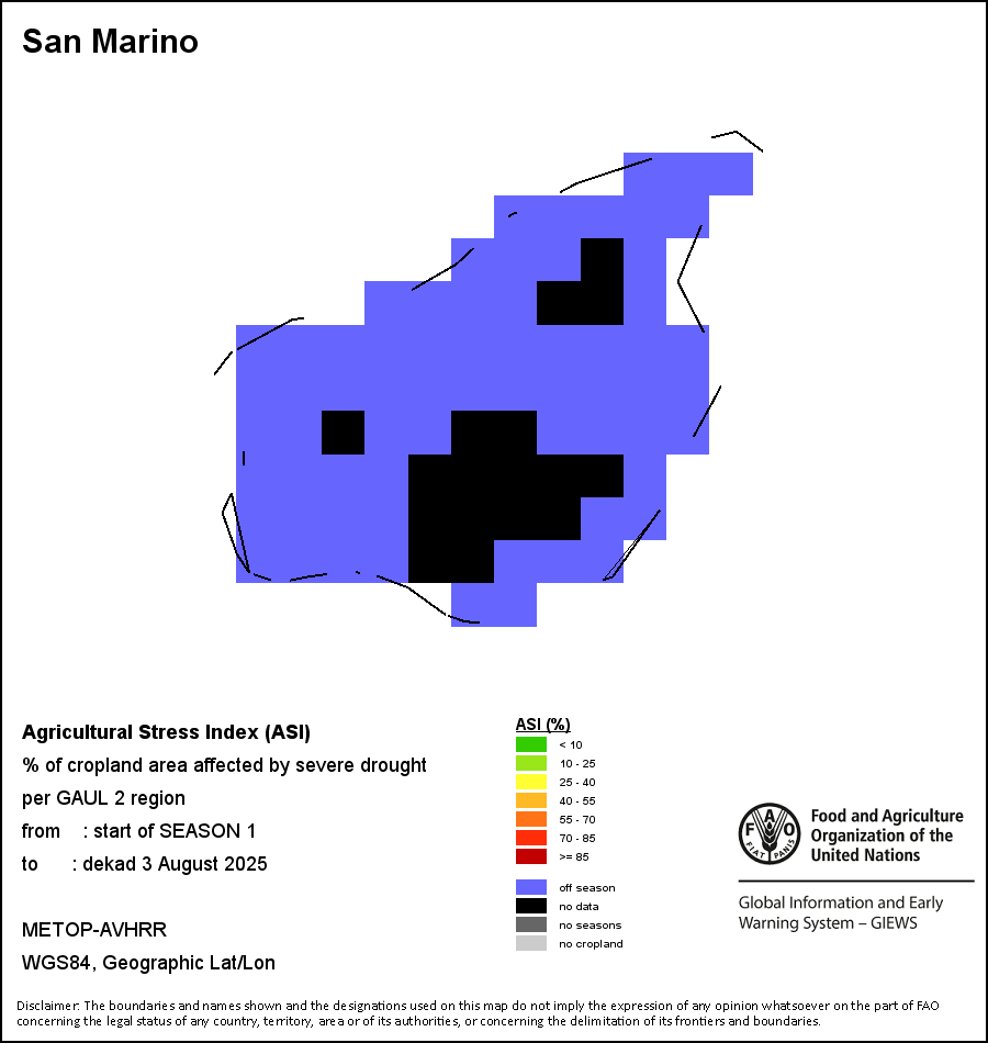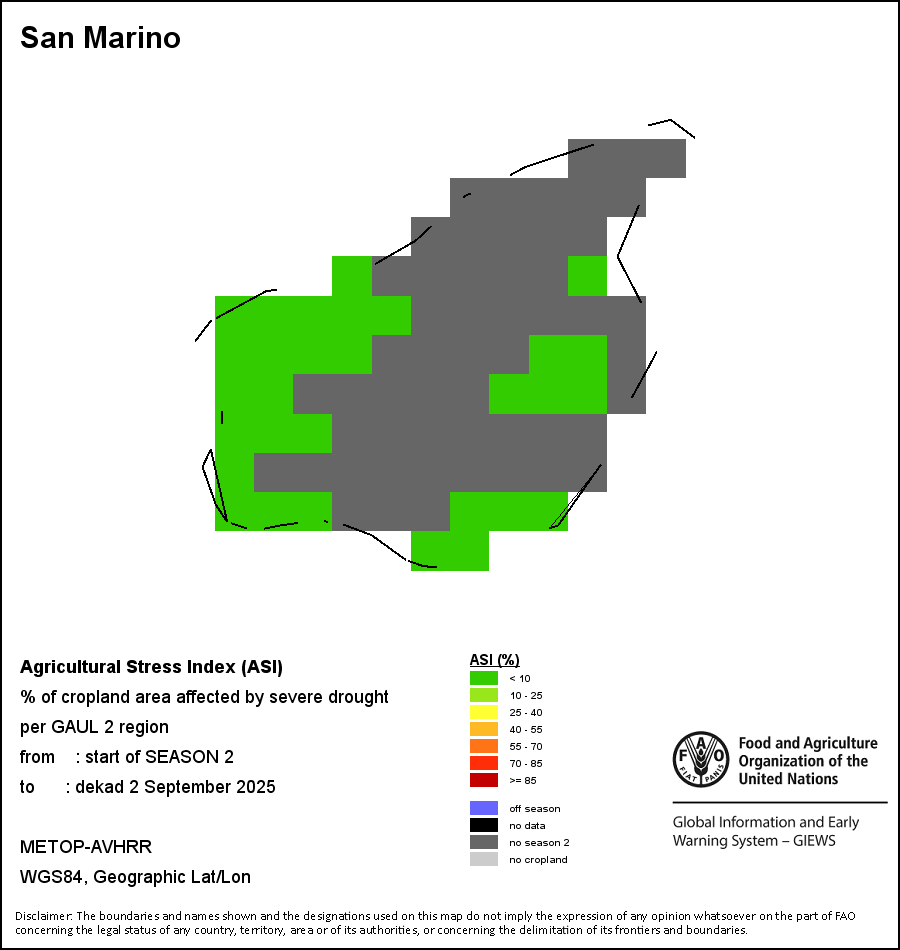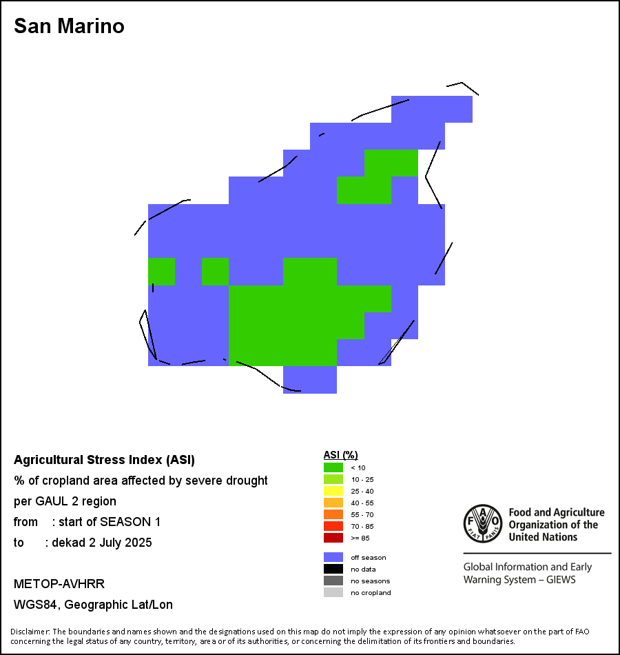 The Agricultural Stress Index (ASI) is a quick-look indicator that facilitates the early identification of cropped land with a high likelihood of water stress (drought). The Index is based on the integration of the Vegetation Health Index (VHI) in two dimensions that are critical in the assessment of a drought event in agriculture: temporal and spatial. The first step of the ASI calculation is a temporal averaging of the VHI, assessing the intensity and duration of dry periods occurring during the crop cycle at the pixel level; this calculation includes the use of crop coefficients, which introduces sensitivity of a crop to water stress during each phenological phase. The second step determines the spatial extent of drought events by calculating the percentage of pixels in arable areas with a VHI value below 35 percent (this value was identified as a critical threshold in assessing the extent of drought in previous research by Kogan, 1995). Each administrative area is classified according to the percentage of the affected area to facilitate the quick interpretation of results.