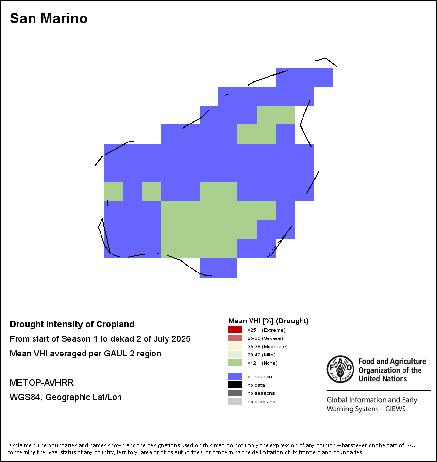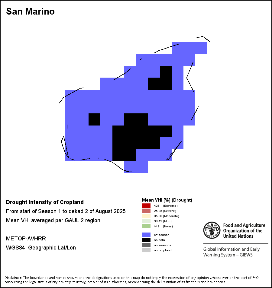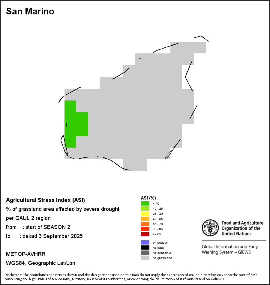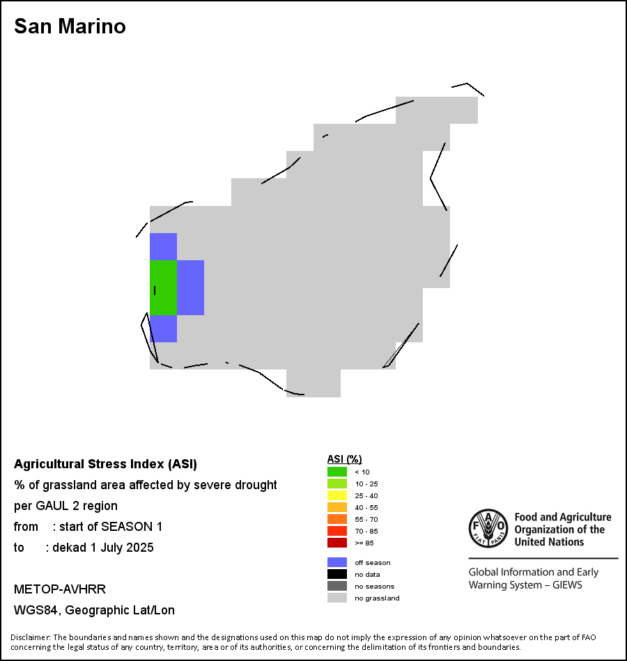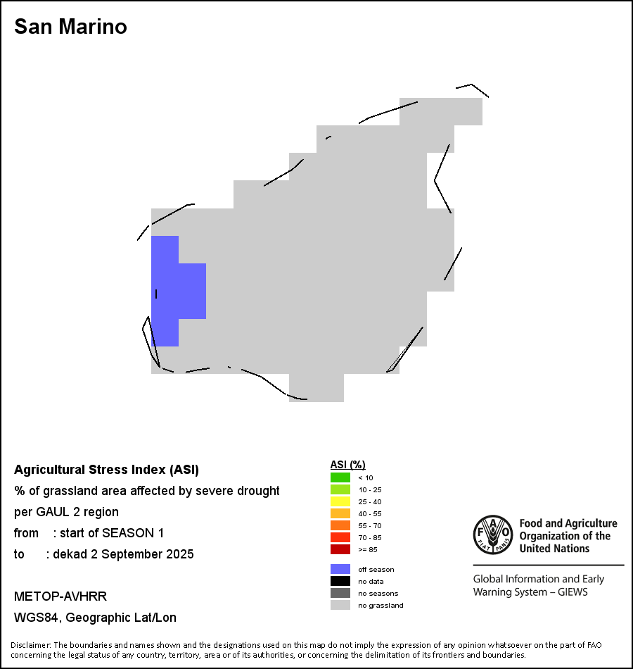 The Agricultural Stress Index (ASI) is a quick-look indicator that facilitates the early identification of cropped land with a high likelihood of water stress (drought). The Index is based on the integration of the Vegetation Health Index (VHI) in two dimensions that are critical in the assessment of a drought event in agriculture: temporal and spatial. The first step of the ASI calculation is a temporal averaging of the VHI, assessing the intensity and duration of dry periods occurring during the crop cycle at the pixel level; this calculation includes the use of crop coefficients, which introduces sensitivity of a crop to water stress during each phenological phase. The second step determines the spatial extent of drought events by calculating the percentage of pixels in arable areas with a VHI value below 35 percent (this value was identified as a critical threshold in assessing the extent of drought in previous research by Kogan, 1995). Each administrative area is classified according to the percentage of the affected area to facilitate the quick interpretation of results.