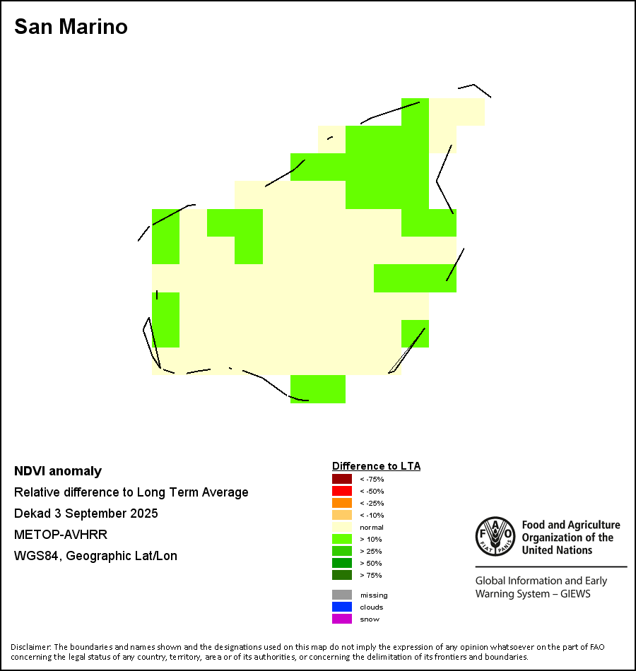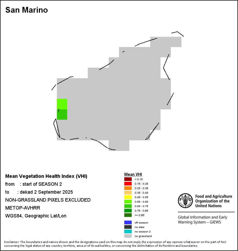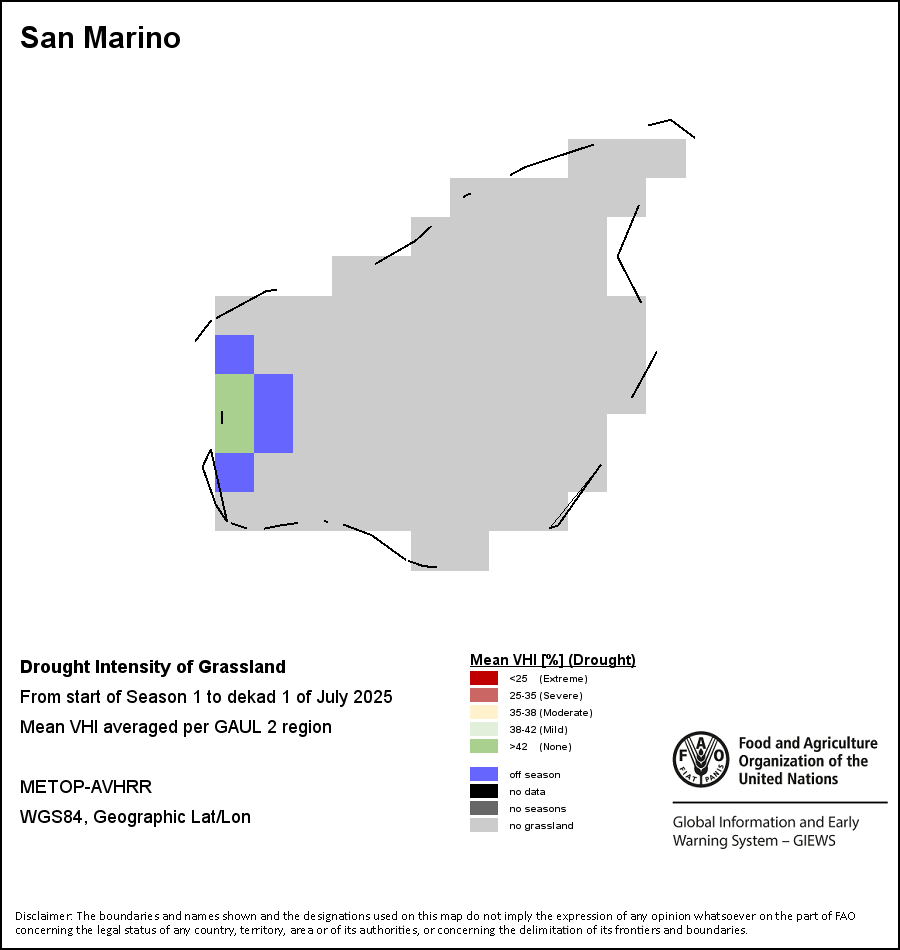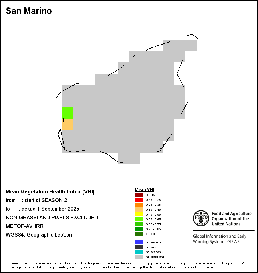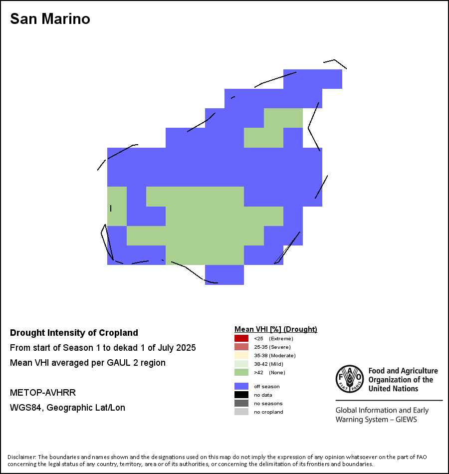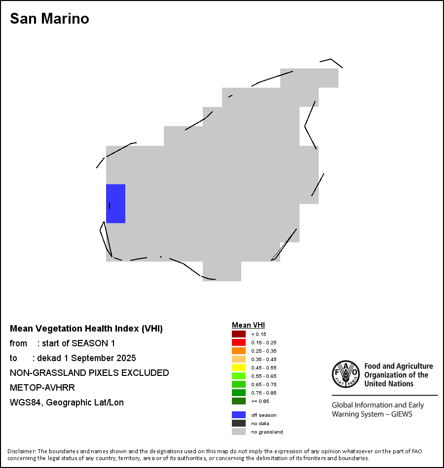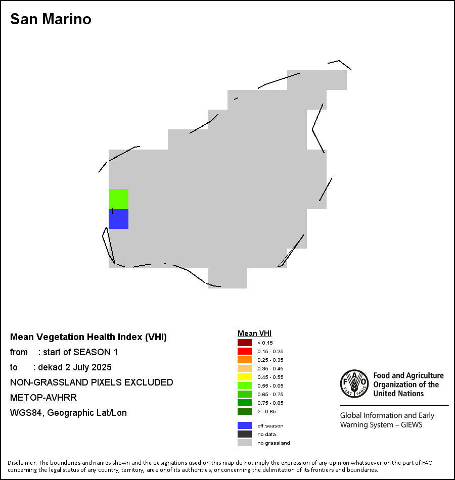 The country level maps and graphs depict the latest 36-month period of the seasonal, vegetation and precipitation indicators. The data is presented by dekad and month.   More