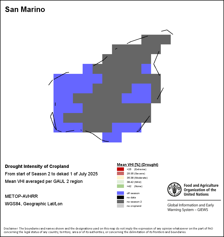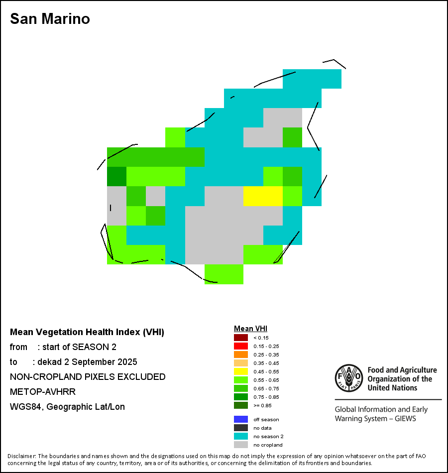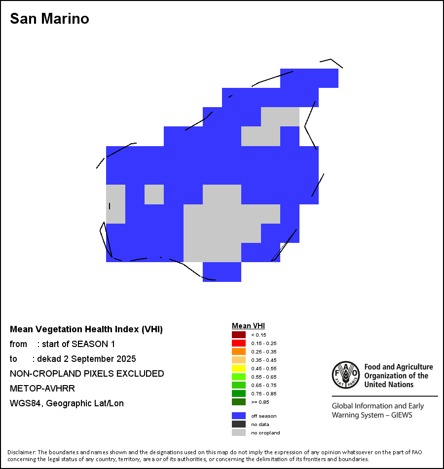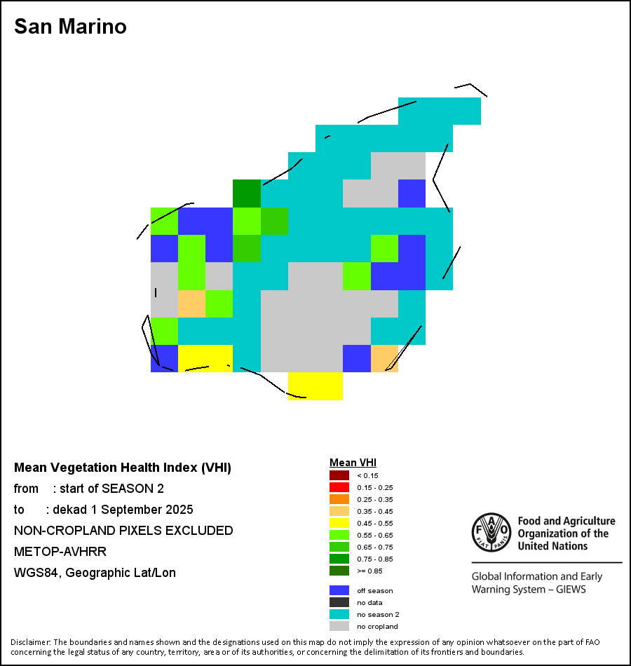 The Weighted Mean Vegetation Health Index (Weighted Mean VHI) allows the user to assess the severity of the drought from the start of the growing season, examining the vegetation health and the influence of temperature on plant conditions. The Mean VHI is an average of the dekadal VHI values over the crop growing season (from the start until the last dekad of analysis), weighted by crop coefficients (Kc), assigned to VHI values at the dekads corresponding to the Start of the Season (SOS), Maximum of the Season (MOS) and End of the Season (EOS). Crop coefficient is applied for the purpose of reflecting the crop’s water sensitivity at different phenology stages.