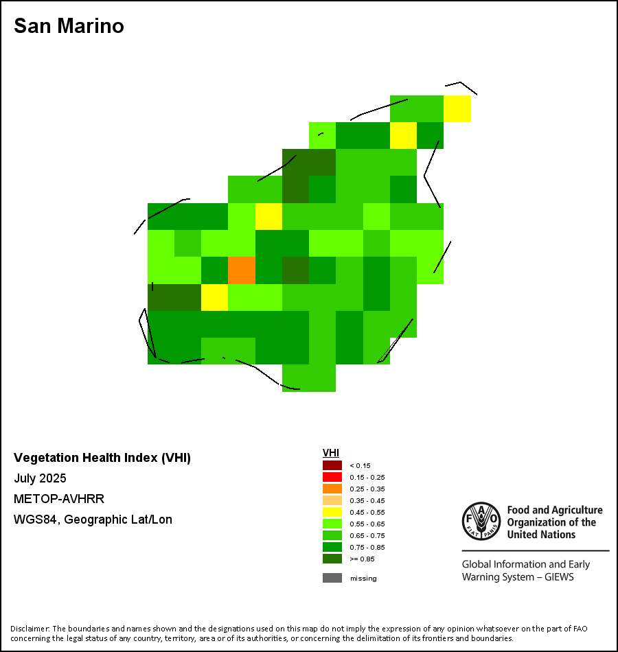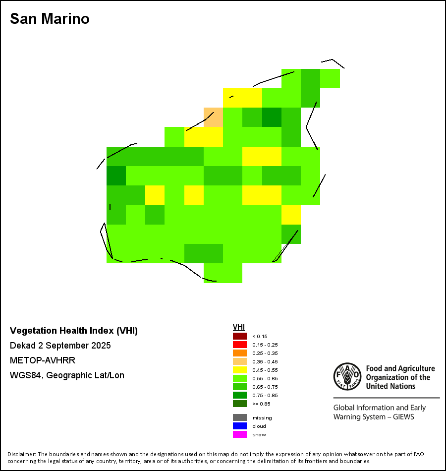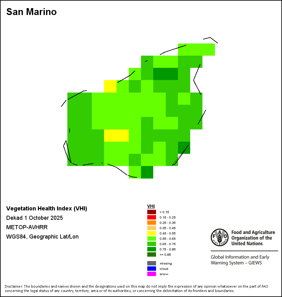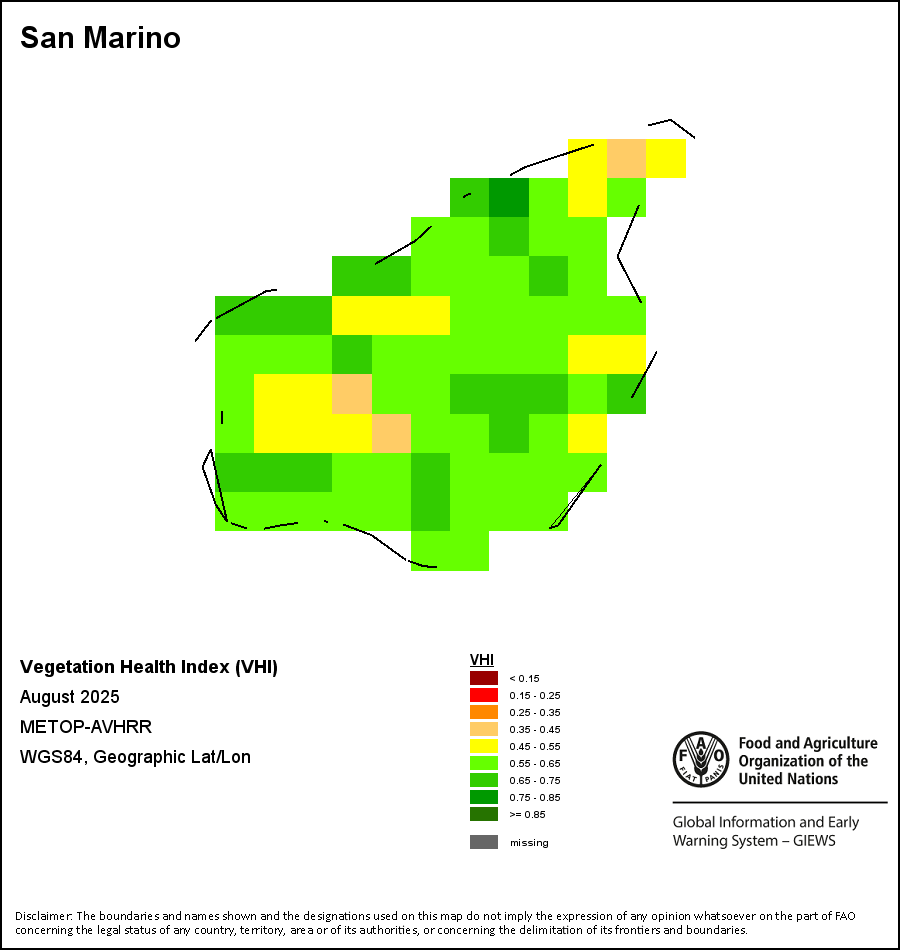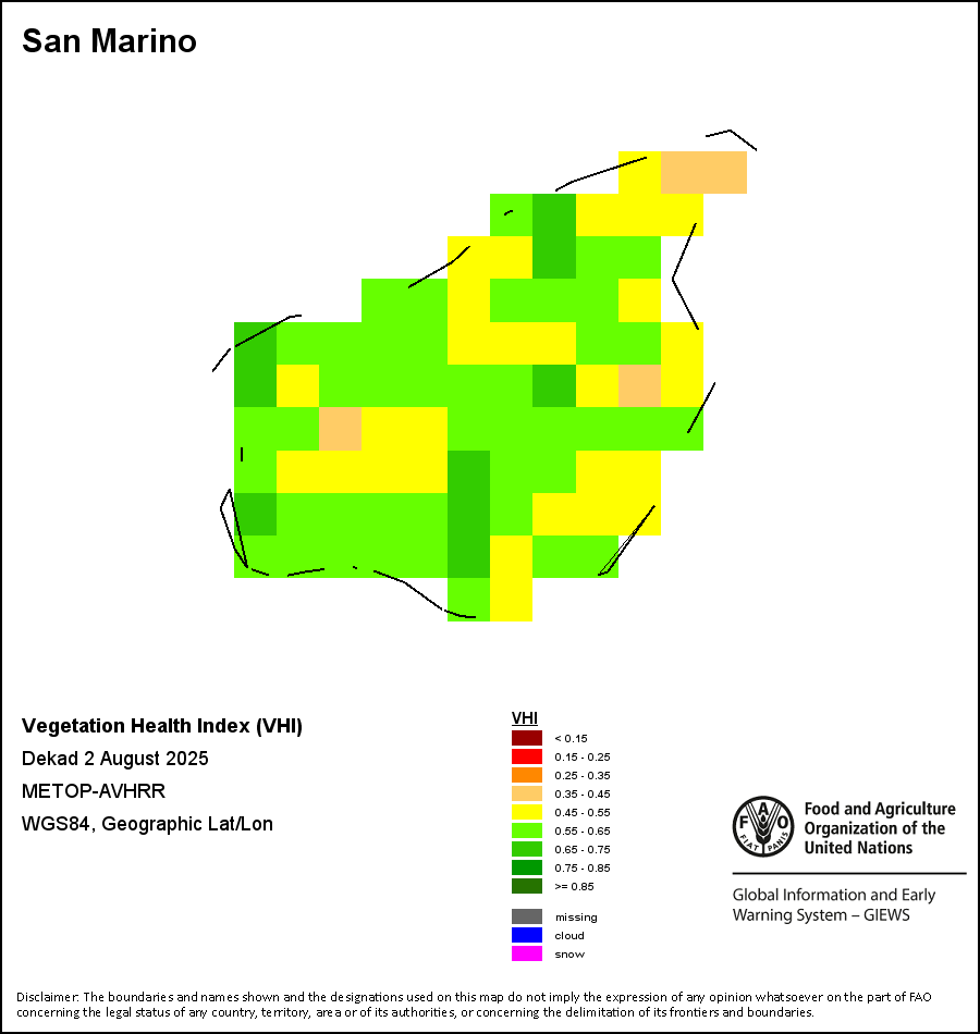 The Vegetation Health Index (VHI) illustrates the severity of drought based on the vegetation health and the influence of temperature on plant conditions. The VHI is a composite index and the elementary indicator used to compute the ASI. It combines both the Vegetation Condition Index (VCI) and the Temperature Condition Index (TCI). The TCI is calculated using a similar equation to the VCI, but relates the current temperature to the long-term maximum and minimum , as it is assumed that higher temperatures tend to cause a deterioration in vegetation conditions. A decrease in the VHI would, for example, indicate relatively poor vegetation conditions and warmer temperatures, signifying stressed vegetation conditions, and over a longer period would be indicative of drought. The VHI images are computed for the two main seasons and in three modalities: dekadal, monthly and annual.
